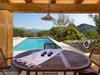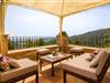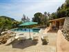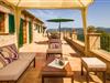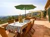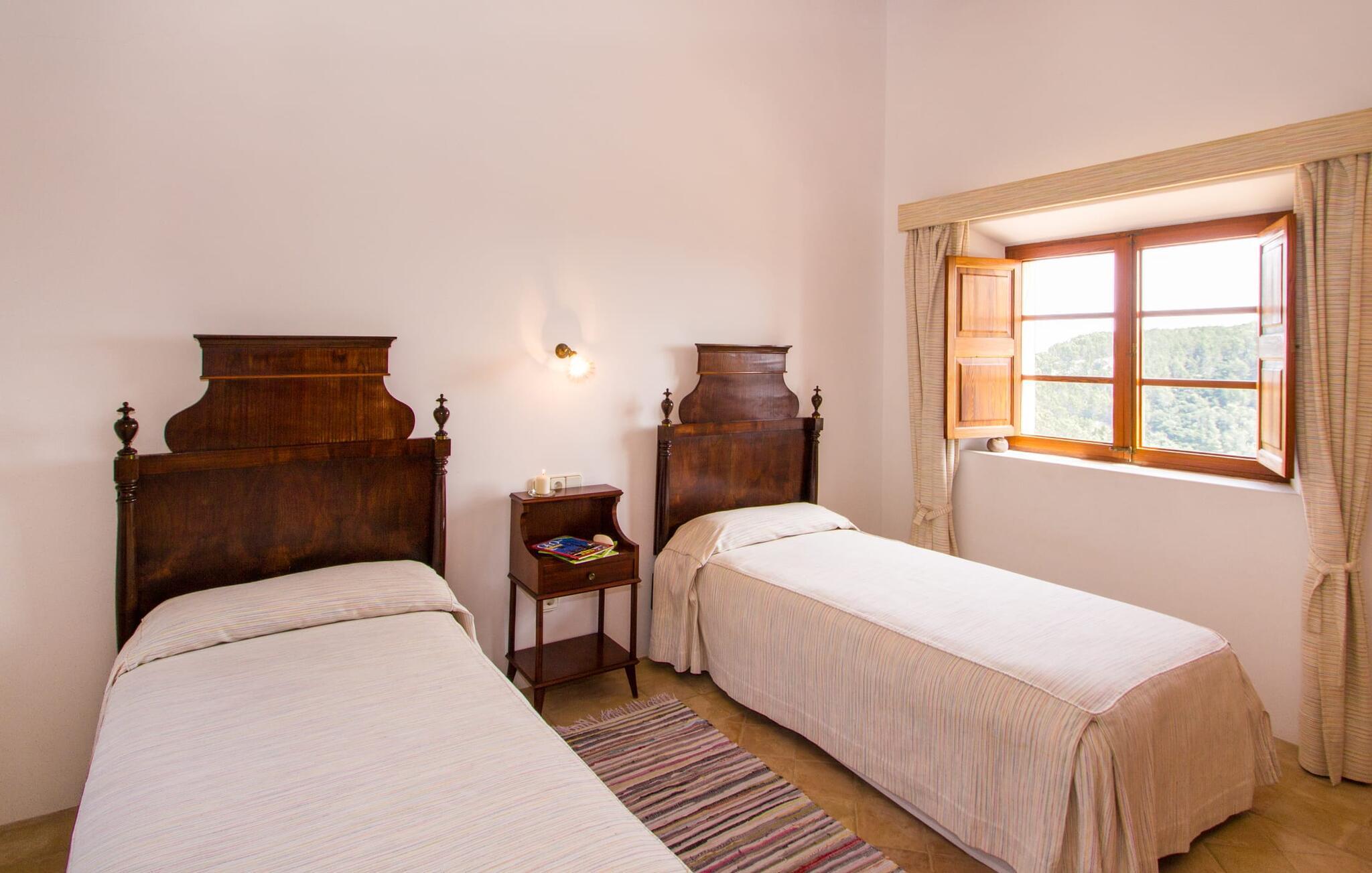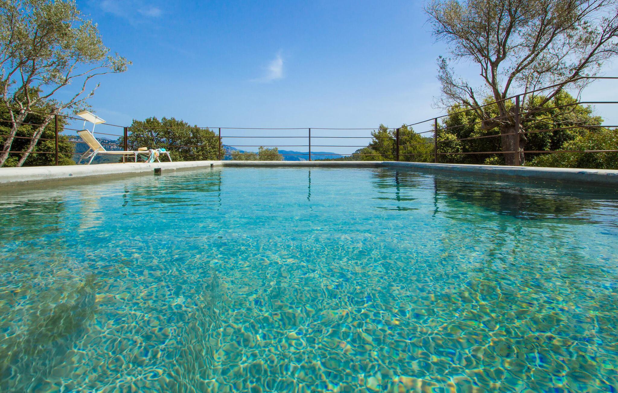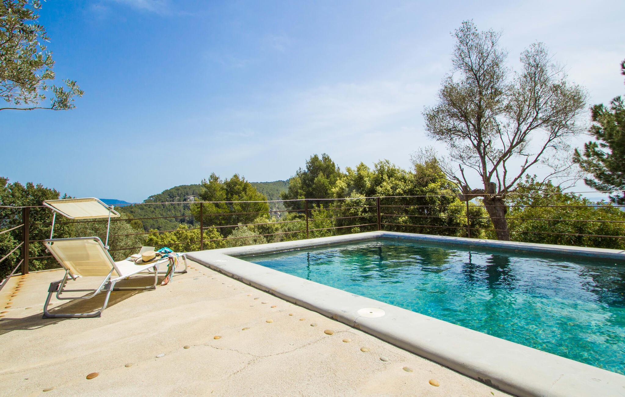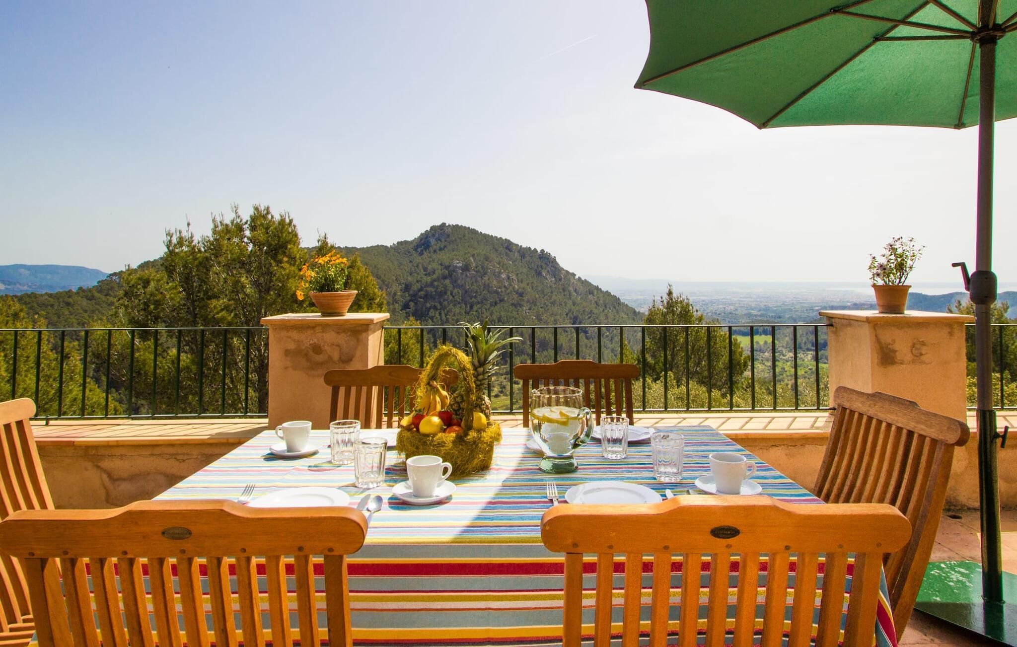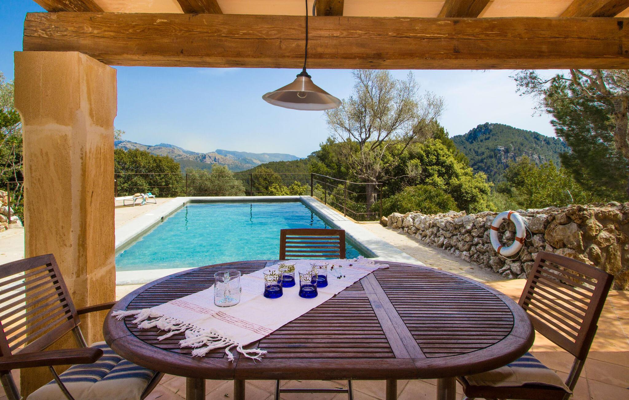 Hoch über der charmanten Kleinstadt Esporles thront die Villa „Vistas de Serra“ in völliger Ruhe. Das typisch mallorquinische Natursteinhaus fügt sich perfekt in die grüne Umgebung ein, die teilweise aus Wald besteht. Es lockt dazu, eine Weile zu bleiben und die Aussicht zu genießen. Der weitläufige Außenbereich besteht größtenteils aus Terrassen, die von kleinen Steinmauern eingefasst und mit mediterraner Flora gesäumt sind und auf denen Sie Ihre Zeit auf vielfältige und angenehme Weise verbringen können. Etwa 30 m von der Vorderseite des Hauses entfernt und etwas tiefer liegt der einladende Poolbereich, der über einen stufenförmigen Fußweg erreichbar ist und mit einer atemberaubenden, einzigartigen Aussicht gesegnet ist. Das 9 m lange Becken ist leicht zugänglich und hat eine Tiefe zwischen 1,2 und 2,20 m. An heißen Tagen ist dies ein herrlicher Ort, um sich abzukühlen. Für diejenigen, die den ganzen Tag über nichts anderes tun möchten, als sich zu entspannen und die Sonne zu genießen, stehen bequeme Liegestühle zur Verfügung. Wenn Sie sich vor übermäßiger UV-Strahlung schützen möchten, können Sie sich natürlich einfach unter einen der hier draußen stehenden Sonnenschirme setzen oder sich einen Platz im überdachten Teil dieses Außenbereichs suchen. Hier finden Sie das Außenbad und eine Essgruppe, außerdem gibt es hier draußen einen Kühlschrank, sodass Sie immer ein kühles Getränk zur Hand haben. Die lange Panoramaterrasse direkt am Haus ist ein großartiger Ort, um zusammenzusitzen und den Luxus dieser atemberaubend schönen Lage zu genießen. In der Ferne kann man sogar ein wenig vom Meer sehen. Wenn Sie etwas Zeit übrig haben, entspannen Sie sich einfach unter dem Pavillon bei einem guten Drink und vergessen Sie alle Sorgen. Auf dieser Ebene befindet sich auch der überdachte Grillbereich mit Esstisch, Spüle und Holzofen. Es ist der perfekte Ort für lange Grillabende, bei denen Sie alle Arten frischer lokaler Lebensmittel grillen können. Direkt neben dem Haus befinden sich zwei schattige Parkplätze für den Mietwagen.