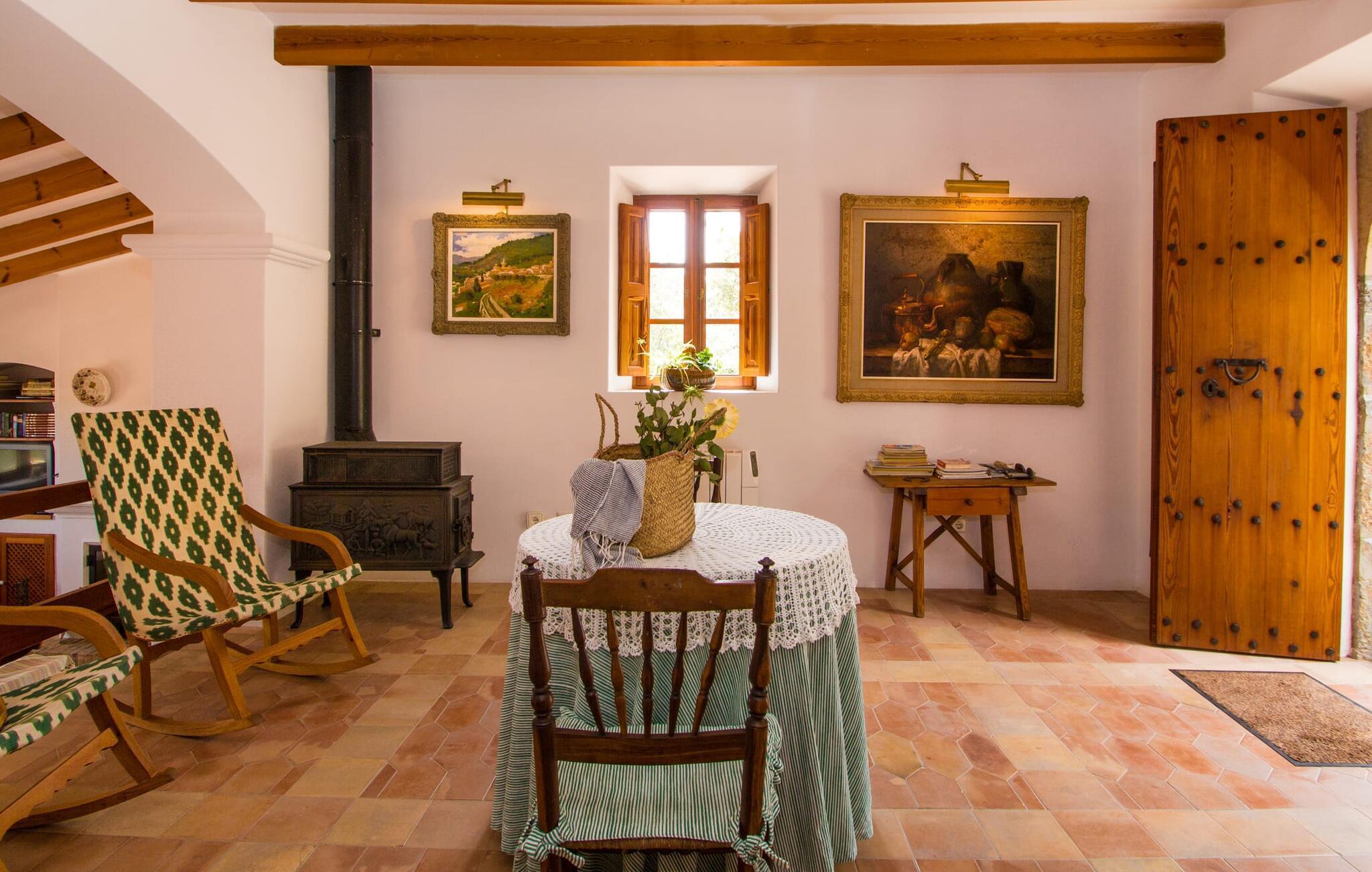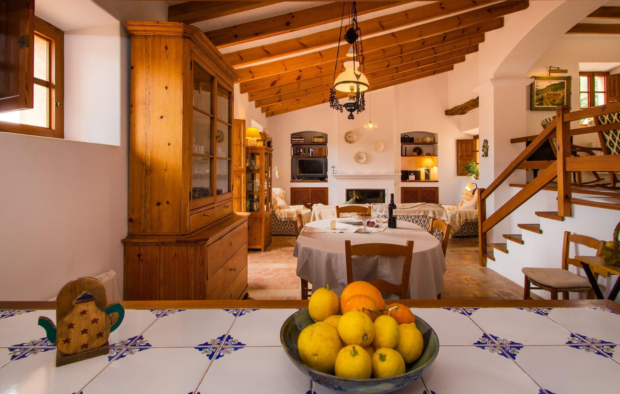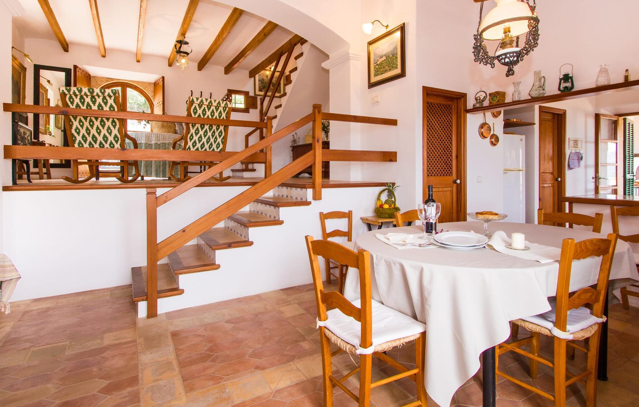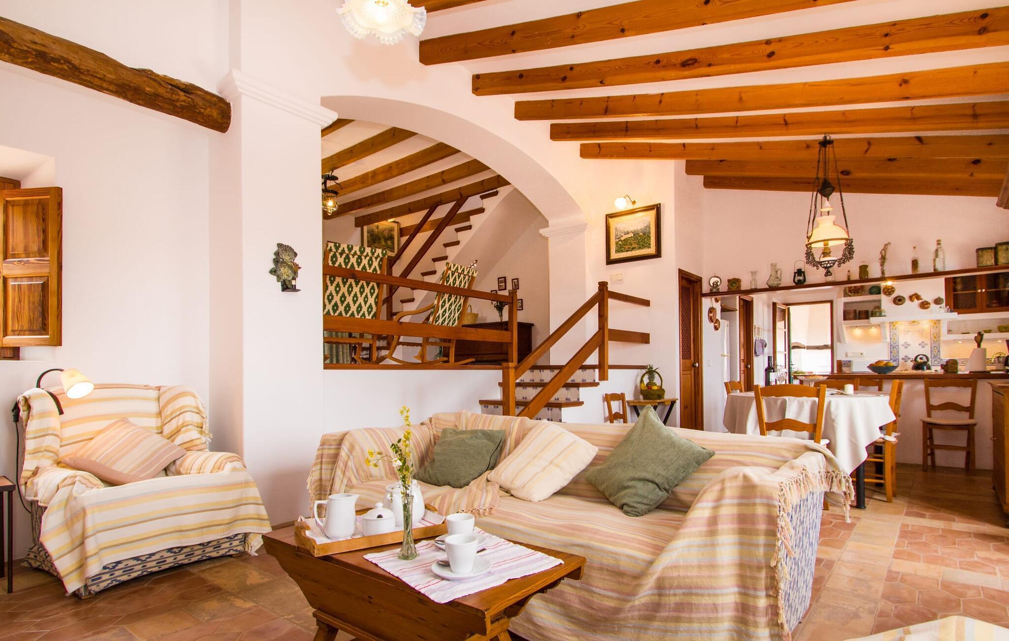 Dieses charmante alte Haus wurde so restauriert, dass es seinen ursprünglichen Charakter und sein ursprüngliches Ambiente bewahrt hat. Traditionelle Möbel und Dekorationsstücke schaffen hier eine authentische Atmosphäre, die es Ihnen ermöglicht, das echte Mallorca wirklich zu erleben. Große Räume laden zum Entspannen und Ausnutzen der 240 m² ein. Vom ebenerdigen Eingangsbereich, der mit zwei klassischen Schaukelstühlen geschmückt ist, geht es über ein paar Stufen hinunter in ein rundum gemütliches Wohn-/Esszimmer mit offener Küche. Entspannen Sie sich auf den bequemen Sofas mit einem guten Buch oder schauen Sie sich einen guten Film an oder setzen Sie sich an den runden Esstisch und genießen Sie gelegentlich drinnen eine köstliche Mahlzeit. Die Küche ist durch eine Theke vom größeren Bereich getrennt und mit allem ausgestattet, was Sie für den Urlaubsalltag benötigen, darunter ein Wasserkocher und eine Filterkaffeemaschine. Von diesem Zimmer aus haben Sie auch bequemen Zugang zur riesigen Terrasse, die fast rund um das Haus verläuft. Ein Schlafzimmer und ein Badezimmer mit Dusche befinden sich auf der gleichen Ebene wie der Eingang zum Haus, zwei weitere Schlafzimmer und ein Badezimmer befinden sich im Obergeschoss. Damit Sie gut schlafen können, stehen Ihnen hier zwei Betten in der Größe 2,00 x 1,80 m und zwei weitere in der Größe 1,90 x 0,90 zur Verfügung. Die Schlafzimmer sind alle auf ihre eigene Art und Weise eingerichtet, haben jedoch einen traditionellen Stil gemeinsam, der ihnen eine einladende Atmosphäre und sogar einen Hauch von Romantik verleiht. Dieses gemütliche, rustikale Design kommt auch in den Badezimmern voll zur Geltung. Sie müssen weder ein Bügeleisen noch einen Haartrockner einpacken; Nutzen Sie einfach die hier verfügbaren.