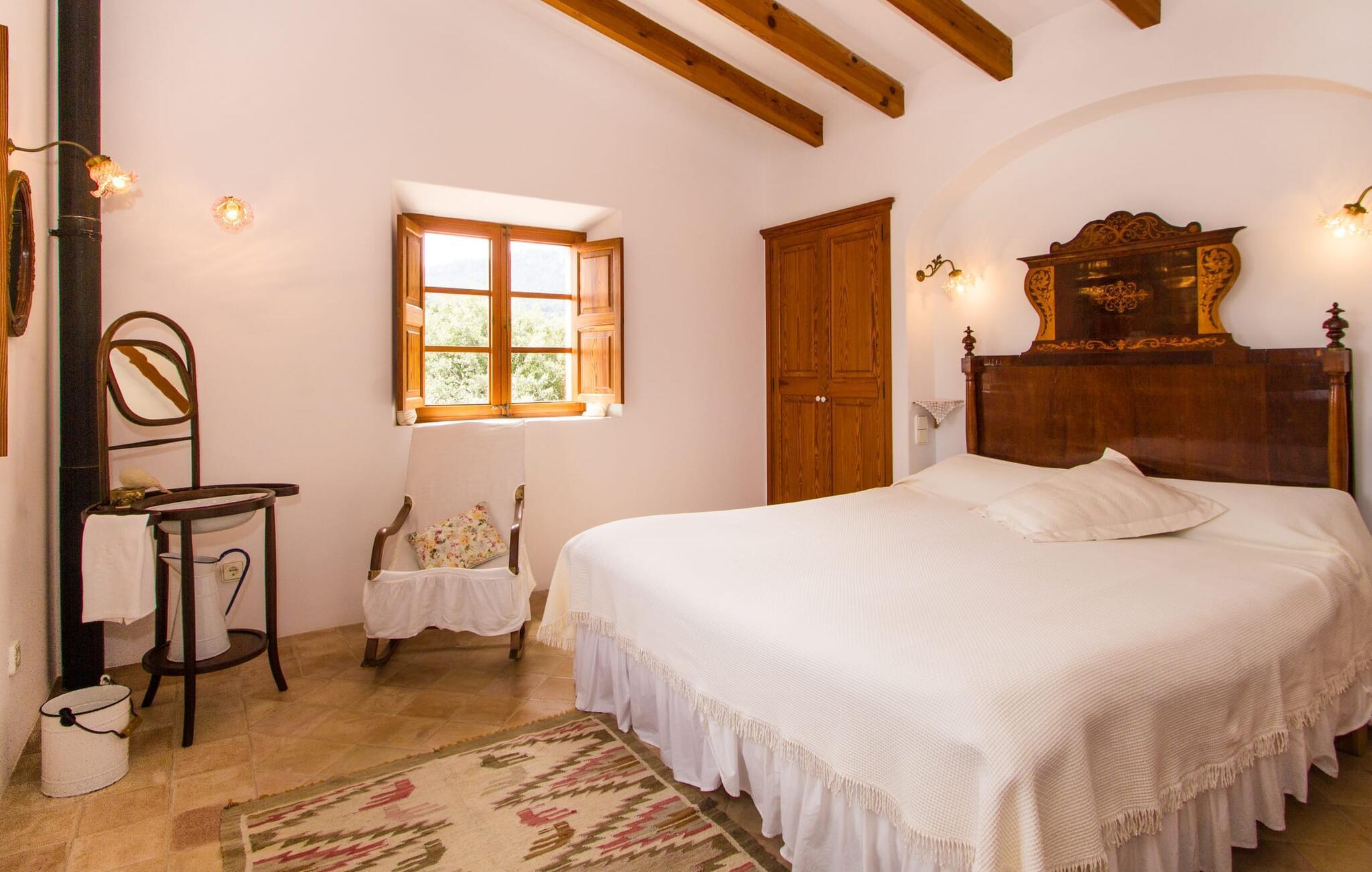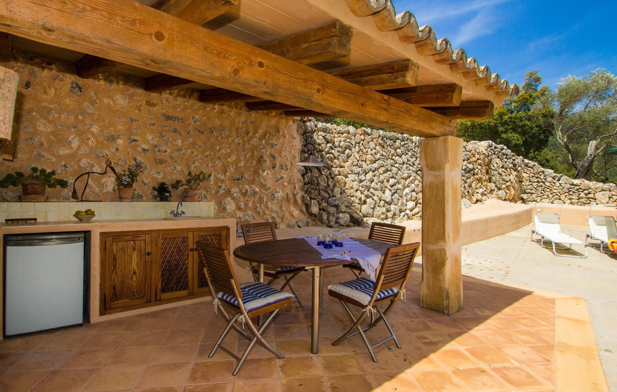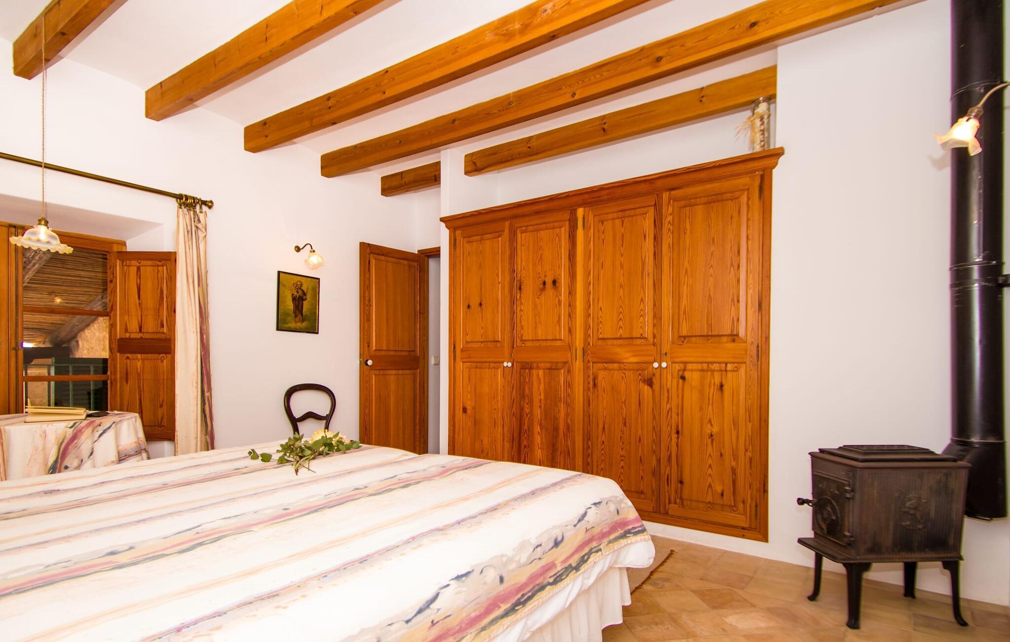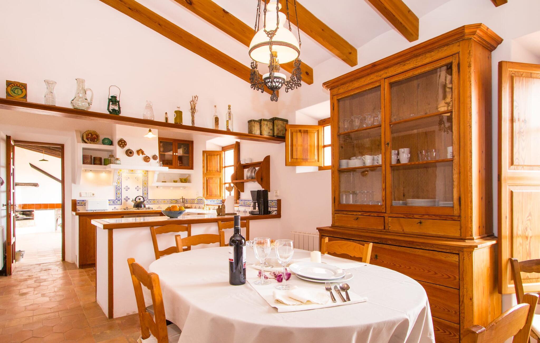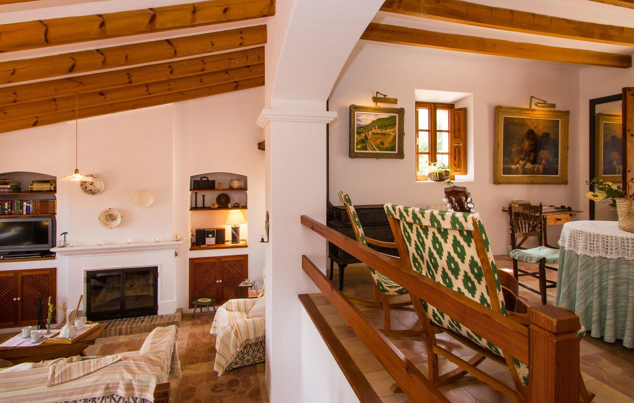 Dieses charmante alte Haus wurde so restauriert, dass es seinen ursprünglichen Charakter und sein ursprüngliches Ambiente bewahrt hat. Traditionelle Möbel und Dekorationsstücke schaffen hier eine authentische Atmosphäre, die es Ihnen ermöglicht, das echte Mallorca wirklich zu erleben. Große Räume laden zum Entspannen und Ausnutzen der 240 m² ein. Vom ebenerdigen Eingangsbereich, der mit zwei klassischen Schaukelstühlen geschmückt ist, geht es über ein paar Stufen hinunter in ein rundum gemütliches Wohn-/Esszimmer mit offener Küche. Entspannen Sie sich auf den bequemen Sofas mit einem guten Buch oder schauen Sie sich einen guten Film an oder setzen Sie sich an den runden Esstisch und genießen Sie gelegentlich drinnen eine köstliche Mahlzeit. Die Küche ist durch eine Theke vom größeren Bereich getrennt und mit allem ausgestattet, was Sie für den Urlaubsalltag benötigen, darunter ein Wasserkocher und eine Filterkaffeemaschine. Von diesem Zimmer aus haben Sie auch bequemen Zugang zur riesigen Terrasse, die fast rund um das Haus verläuft. Ein Schlafzimmer und ein Badezimmer mit Dusche befinden sich auf der gleichen Ebene wie der Eingang zum Haus, zwei weitere Schlafzimmer und ein Badezimmer befinden sich im Obergeschoss. Damit Sie gut schlafen können, stehen Ihnen hier zwei Betten in der Größe 2,00 x 1,80 m und zwei weitere in der Größe 1,90 x 0,90 zur Verfügung. Die Schlafzimmer sind alle auf ihre eigene Art und Weise eingerichtet, haben jedoch einen traditionellen Stil gemeinsam, der ihnen eine einladende Atmosphäre und sogar einen Hauch von Romantik verleiht. Dieses gemütliche, rustikale Design kommt auch in den Badezimmern voll zur Geltung. Sie müssen weder ein Bügeleisen noch einen Haartrockner einpacken; Nutzen Sie einfach die hier verfügbaren.