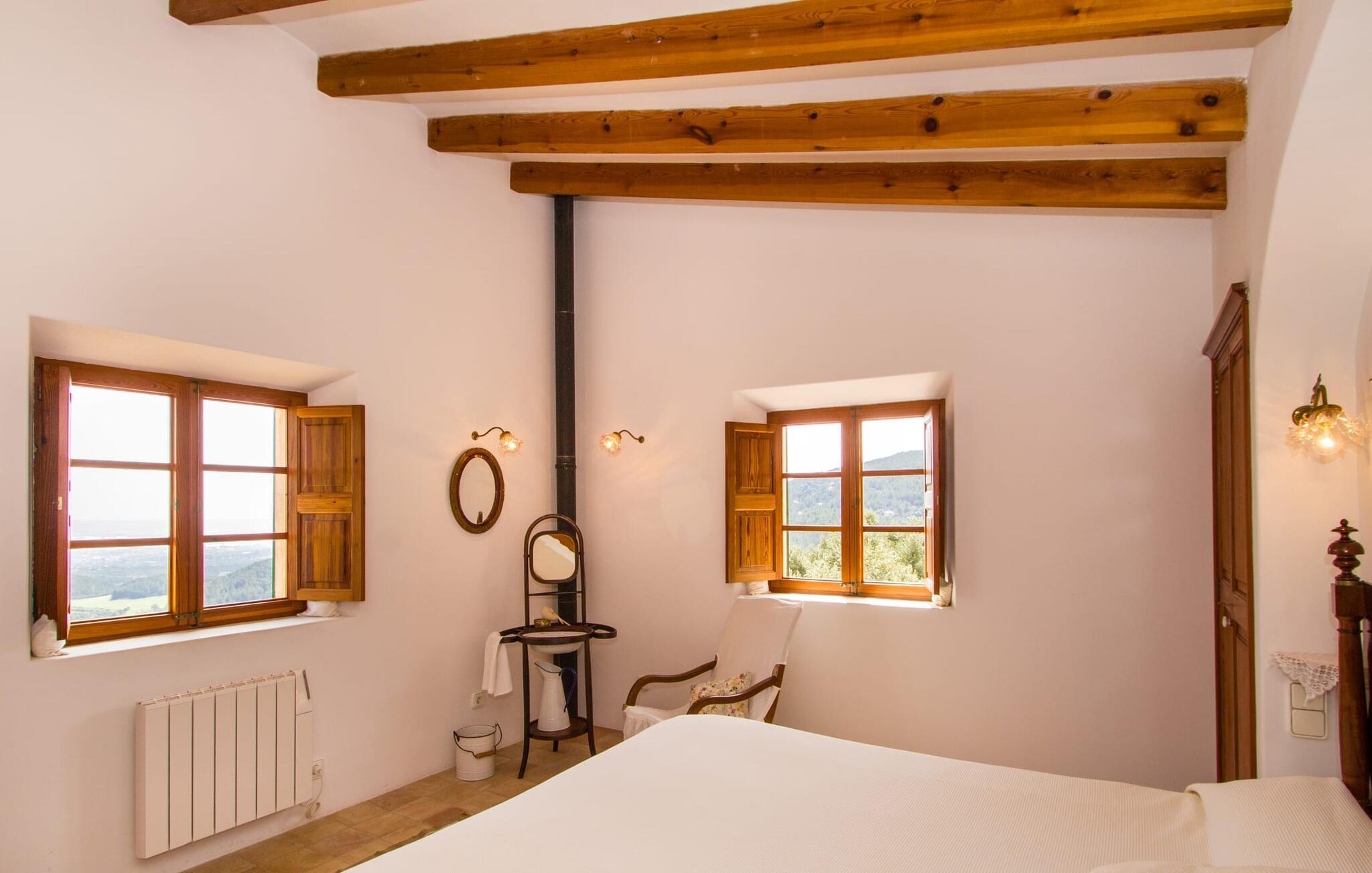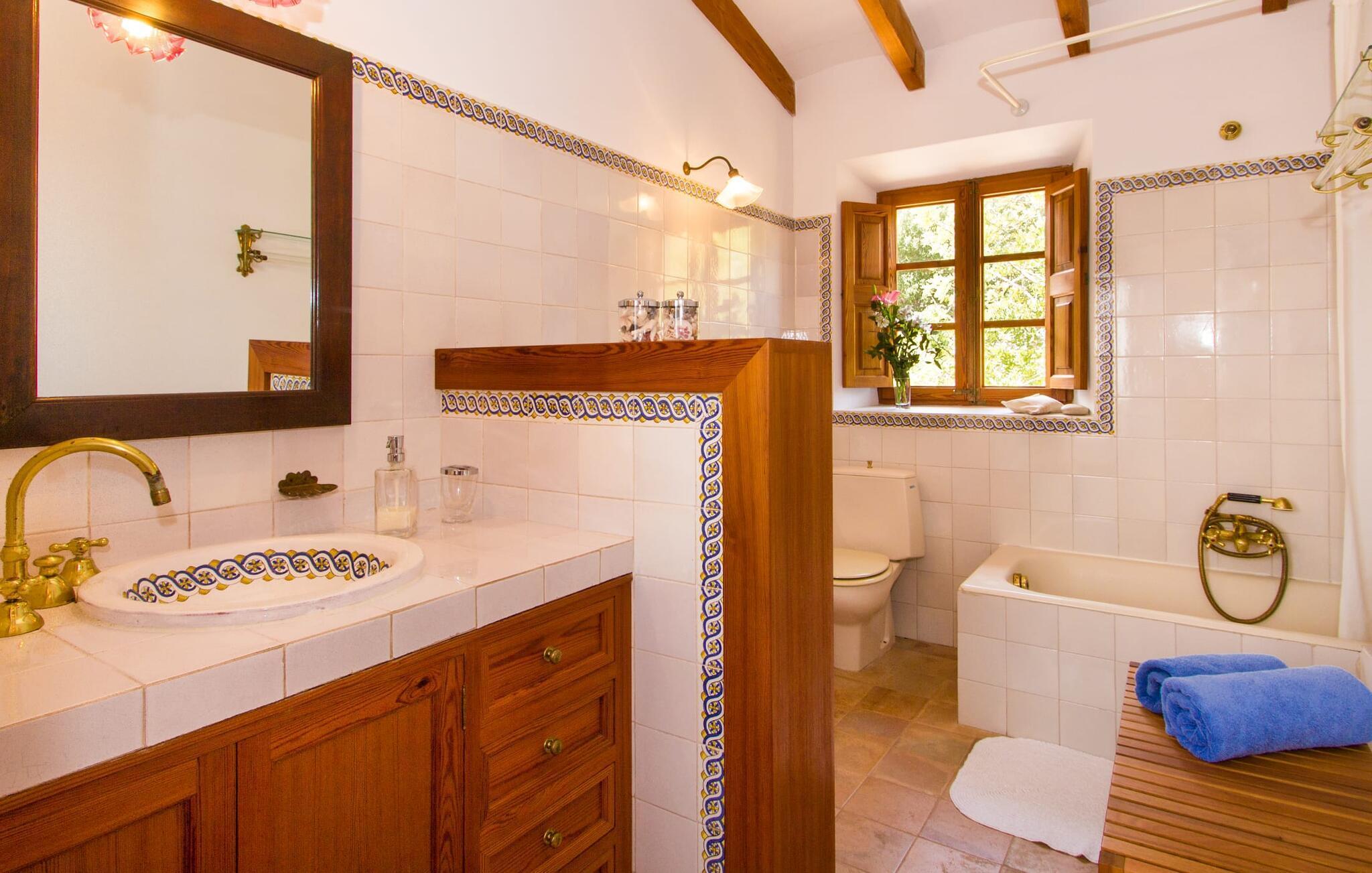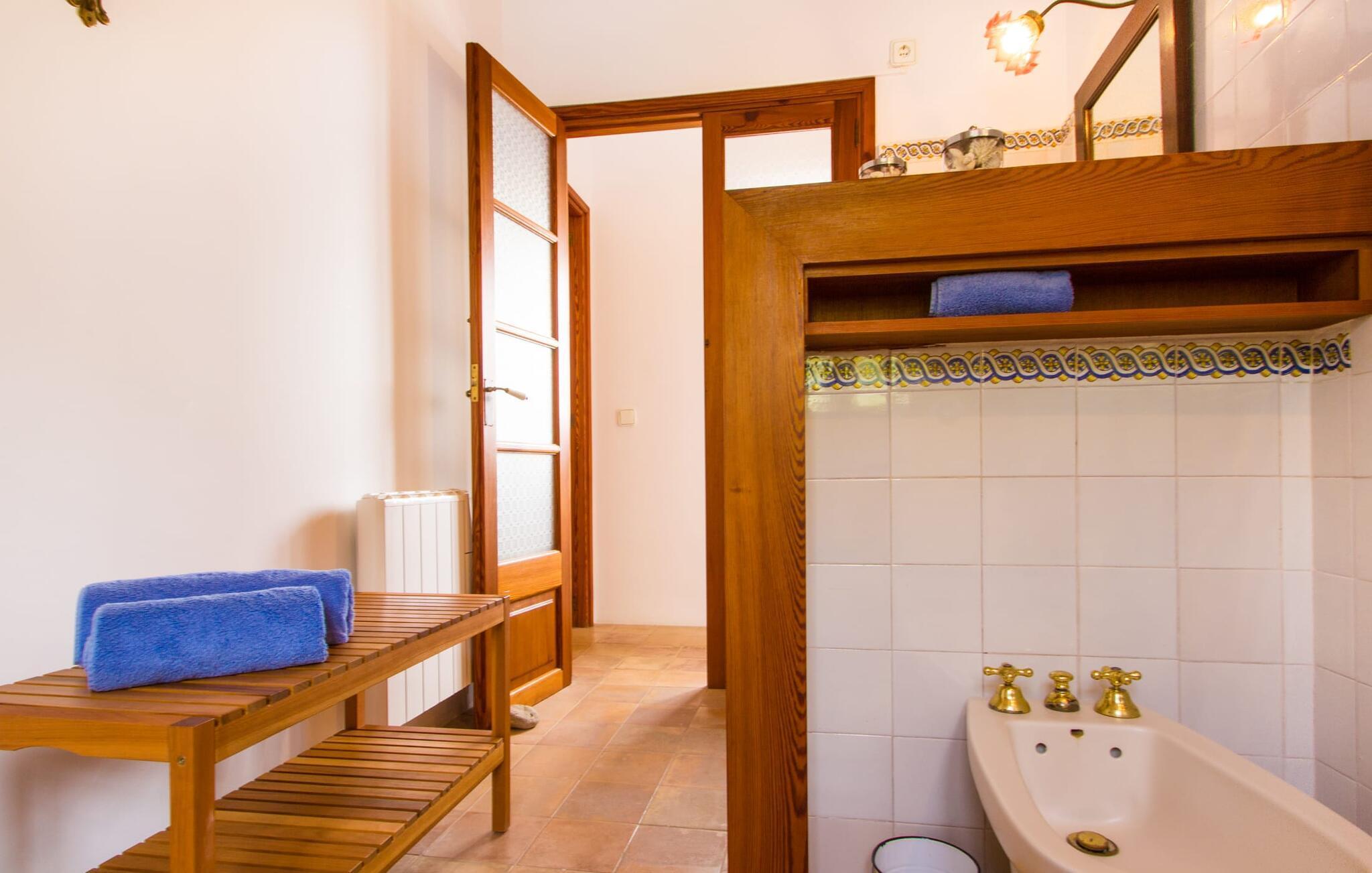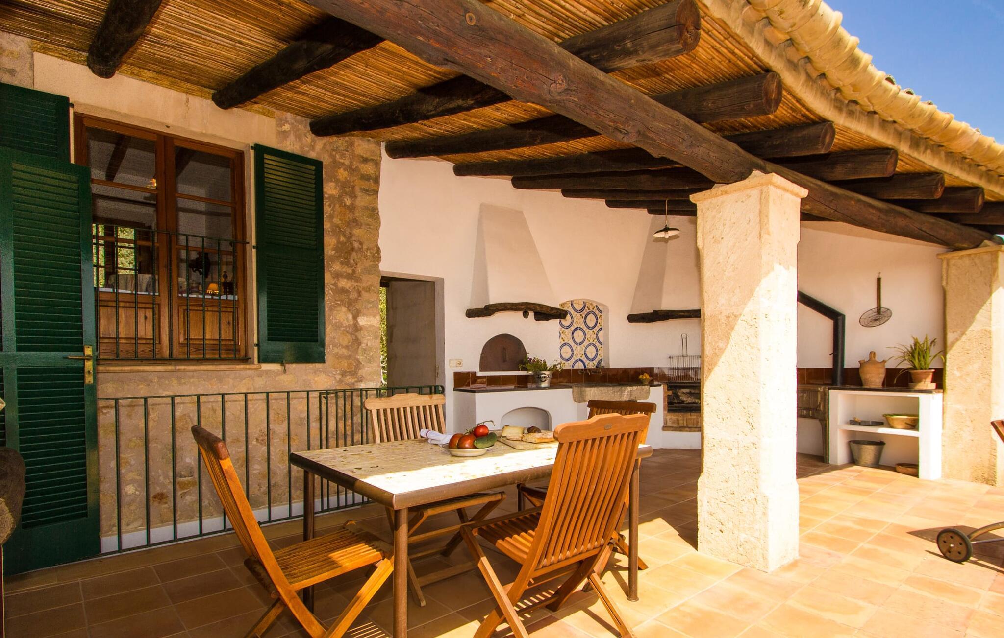 Dieses charmante alte Haus wurde so restauriert, dass es seinen ursprünglichen Charakter und sein ursprüngliches Ambiente bewahrt hat. Traditionelle Möbel und Dekorationsstücke schaffen hier eine authentische Atmosphäre, die es Ihnen ermöglicht, das echte Mallorca wirklich zu erleben. Große Räume laden zum Entspannen und Ausnutzen der 240 m² ein. Vom ebenerdigen Eingangsbereich, der mit zwei klassischen Schaukelstühlen geschmückt ist, geht es über ein paar Stufen hinunter in ein rundum gemütliches Wohn-/Esszimmer mit offener Küche. Entspannen Sie sich auf den bequemen Sofas mit einem guten Buch oder schauen Sie sich einen guten Film an oder setzen Sie sich an den runden Esstisch und genießen Sie gelegentlich drinnen eine köstliche Mahlzeit. Die Küche ist durch eine Theke vom größeren Bereich getrennt und mit allem ausgestattet, was Sie für den Urlaubsalltag benötigen, darunter ein Wasserkocher und eine Filterkaffeemaschine. Von diesem Zimmer aus haben Sie auch bequemen Zugang zur riesigen Terrasse, die fast rund um das Haus verläuft. Ein Schlafzimmer und ein Badezimmer mit Dusche befinden sich auf der gleichen Ebene wie der Eingang zum Haus, zwei weitere Schlafzimmer und ein Badezimmer befinden sich im Obergeschoss. Damit Sie gut schlafen können, stehen Ihnen hier zwei Betten in der Größe 2,00 x 1,80 m und zwei weitere in der Größe 1,90 x 0,90 zur Verfügung. Die Schlafzimmer sind alle auf ihre eigene Art und Weise eingerichtet, haben jedoch einen traditionellen Stil gemeinsam, der ihnen eine einladende Atmosphäre und sogar einen Hauch von Romantik verleiht. Dieses gemütliche, rustikale Design kommt auch in den Badezimmern voll zur Geltung. Sie müssen weder ein Bügeleisen noch einen Haartrockner einpacken; Nutzen Sie einfach die hier verfügbaren.