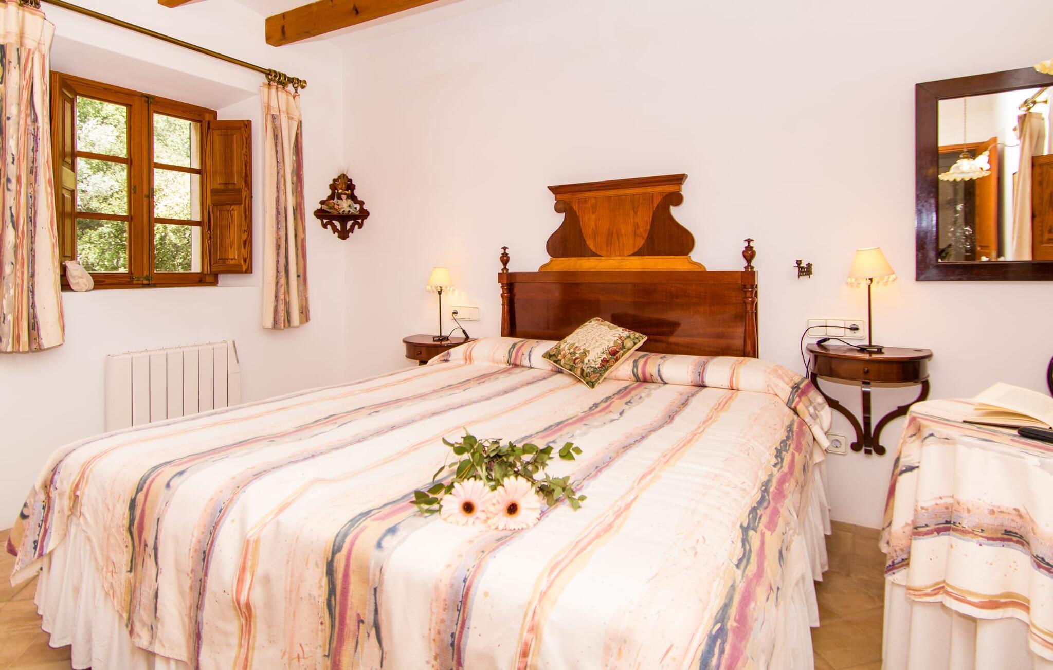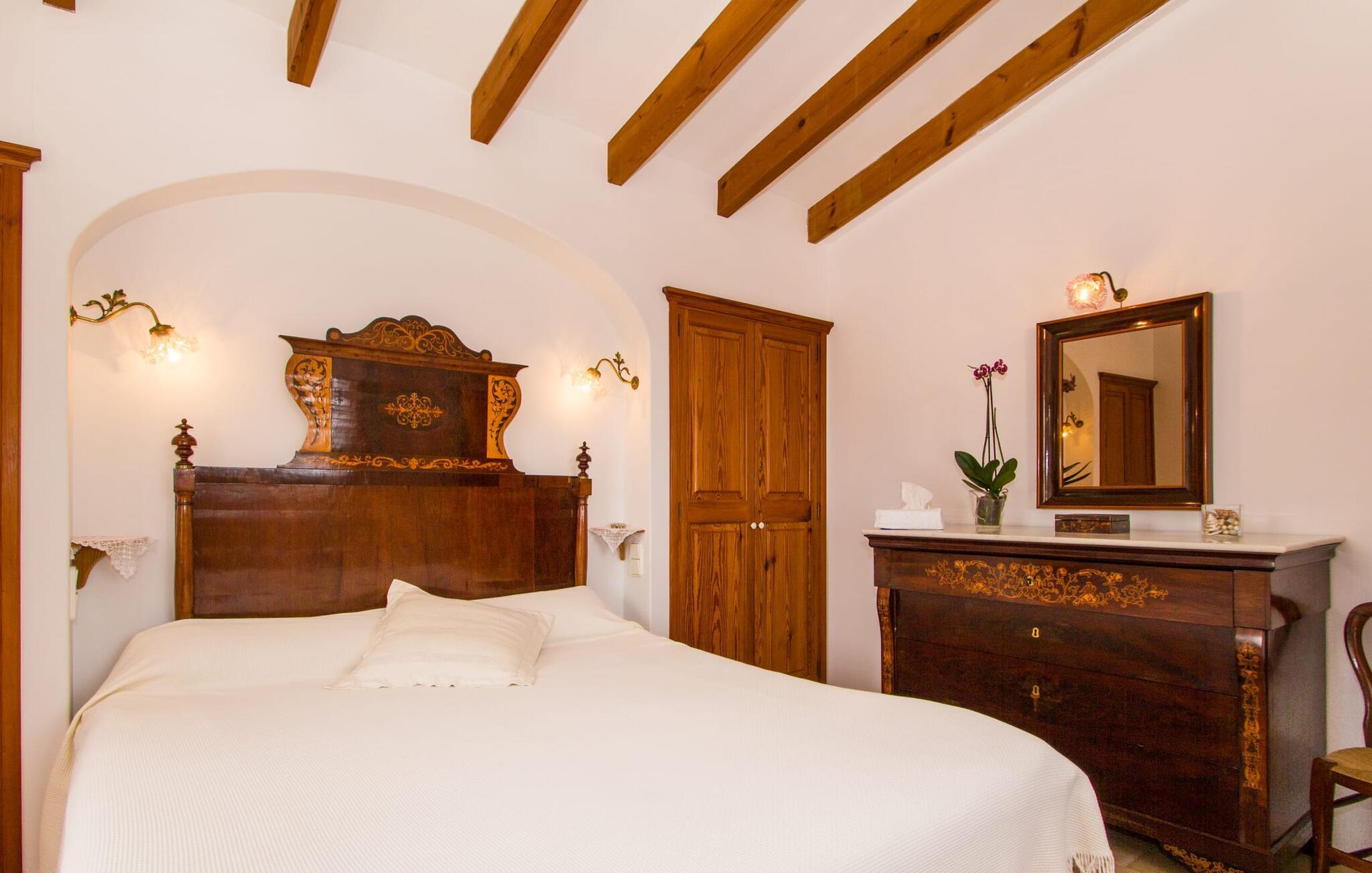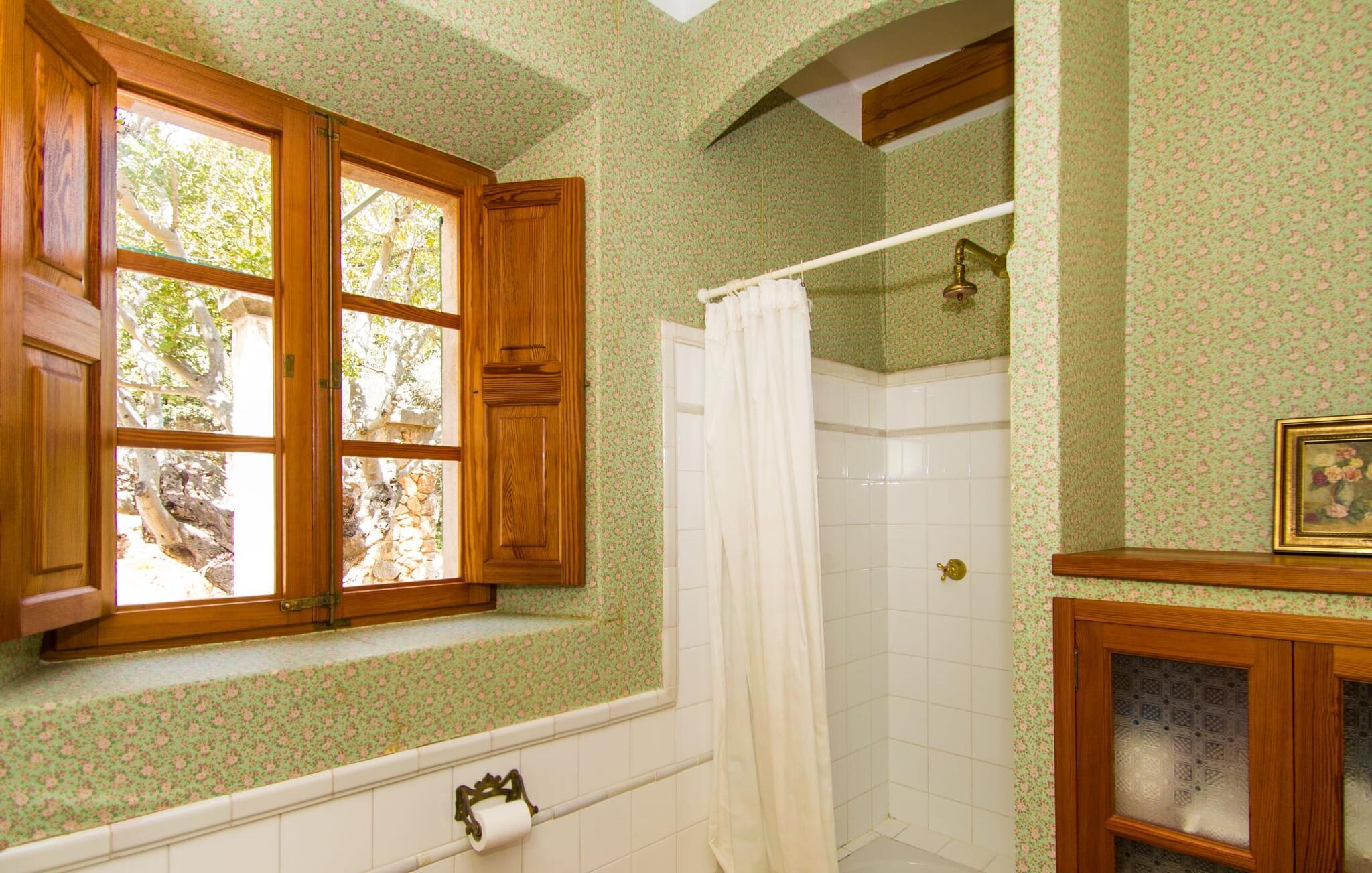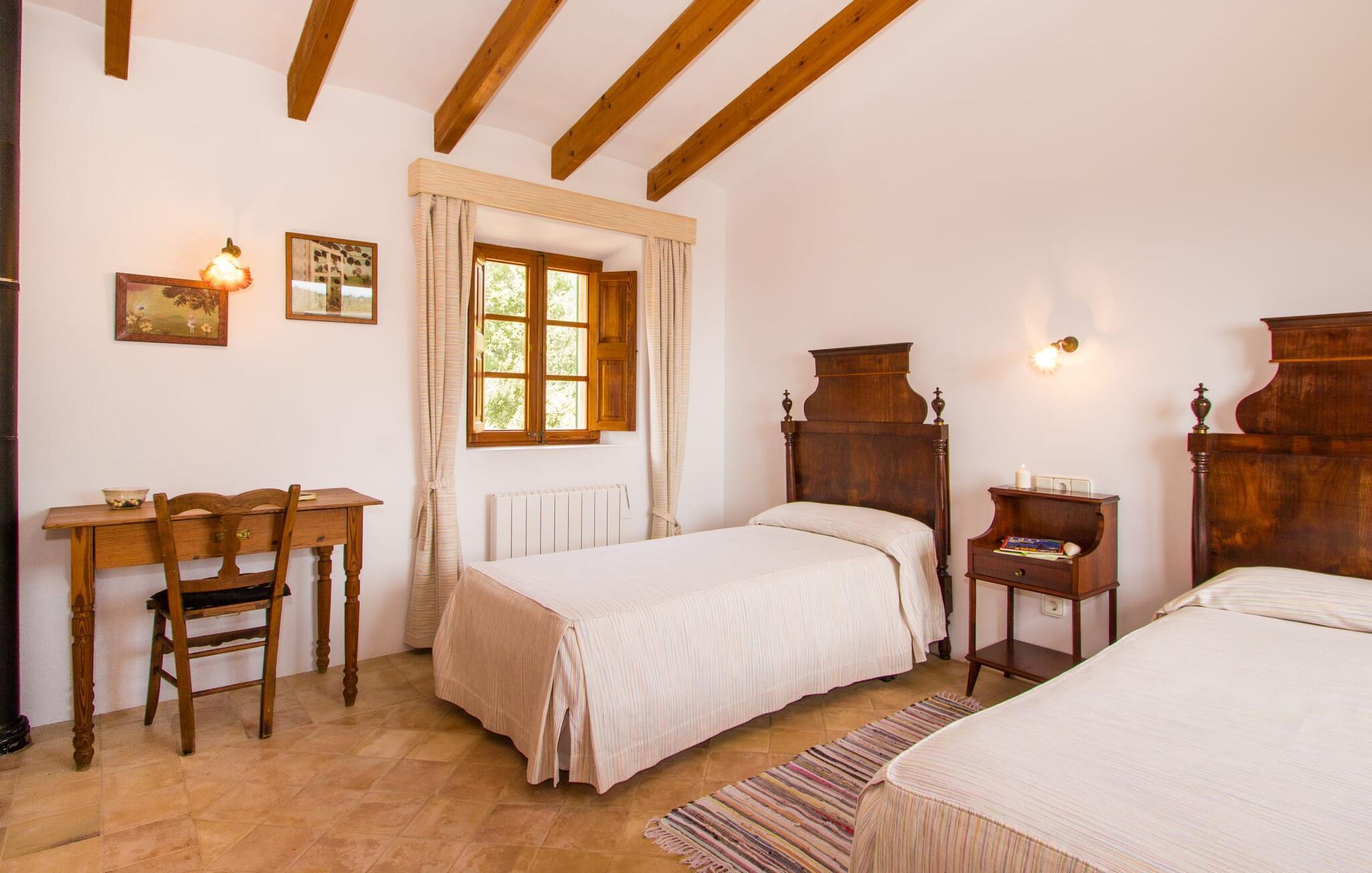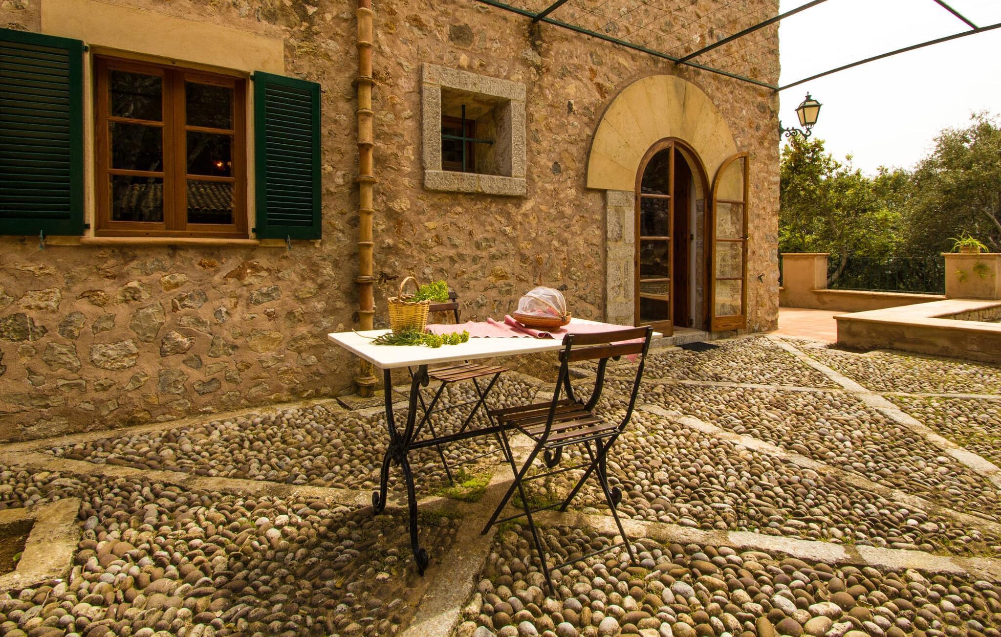 Dieses charmante alte Haus wurde so restauriert, dass es seinen ursprünglichen Charakter und sein ursprüngliches Ambiente bewahrt hat. Traditionelle Möbel und Dekorationsstücke schaffen hier eine authentische Atmosphäre, die es Ihnen ermöglicht, das echte Mallorca wirklich zu erleben. Große Räume laden zum Entspannen und Ausnutzen der 240 m² ein. Vom ebenerdigen Eingangsbereich, der mit zwei klassischen Schaukelstühlen geschmückt ist, geht es über ein paar Stufen hinunter in ein rundum gemütliches Wohn-/Esszimmer mit offener Küche. Entspannen Sie sich auf den bequemen Sofas mit einem guten Buch oder schauen Sie sich einen guten Film an oder setzen Sie sich an den runden Esstisch und genießen Sie gelegentlich drinnen eine köstliche Mahlzeit. Die Küche ist durch eine Theke vom größeren Bereich getrennt und mit allem ausgestattet, was Sie für den Urlaubsalltag benötigen, darunter ein Wasserkocher und eine Filterkaffeemaschine. Von diesem Zimmer aus haben Sie auch bequemen Zugang zur riesigen Terrasse, die fast rund um das Haus verläuft. Ein Schlafzimmer und ein Badezimmer mit Dusche befinden sich auf der gleichen Ebene wie der Eingang zum Haus, zwei weitere Schlafzimmer und ein Badezimmer befinden sich im Obergeschoss. Damit Sie gut schlafen können, stehen Ihnen hier zwei Betten in der Größe 2,00 x 1,80 m und zwei weitere in der Größe 1,90 x 0,90 zur Verfügung. Die Schlafzimmer sind alle auf ihre eigene Art und Weise eingerichtet, haben jedoch einen traditionellen Stil gemeinsam, der ihnen eine einladende Atmosphäre und sogar einen Hauch von Romantik verleiht. Dieses gemütliche, rustikale Design kommt auch in den Badezimmern voll zur Geltung. Sie müssen weder ein Bügeleisen noch einen Haartrockner einpacken; Nutzen Sie einfach die hier verfügbaren.