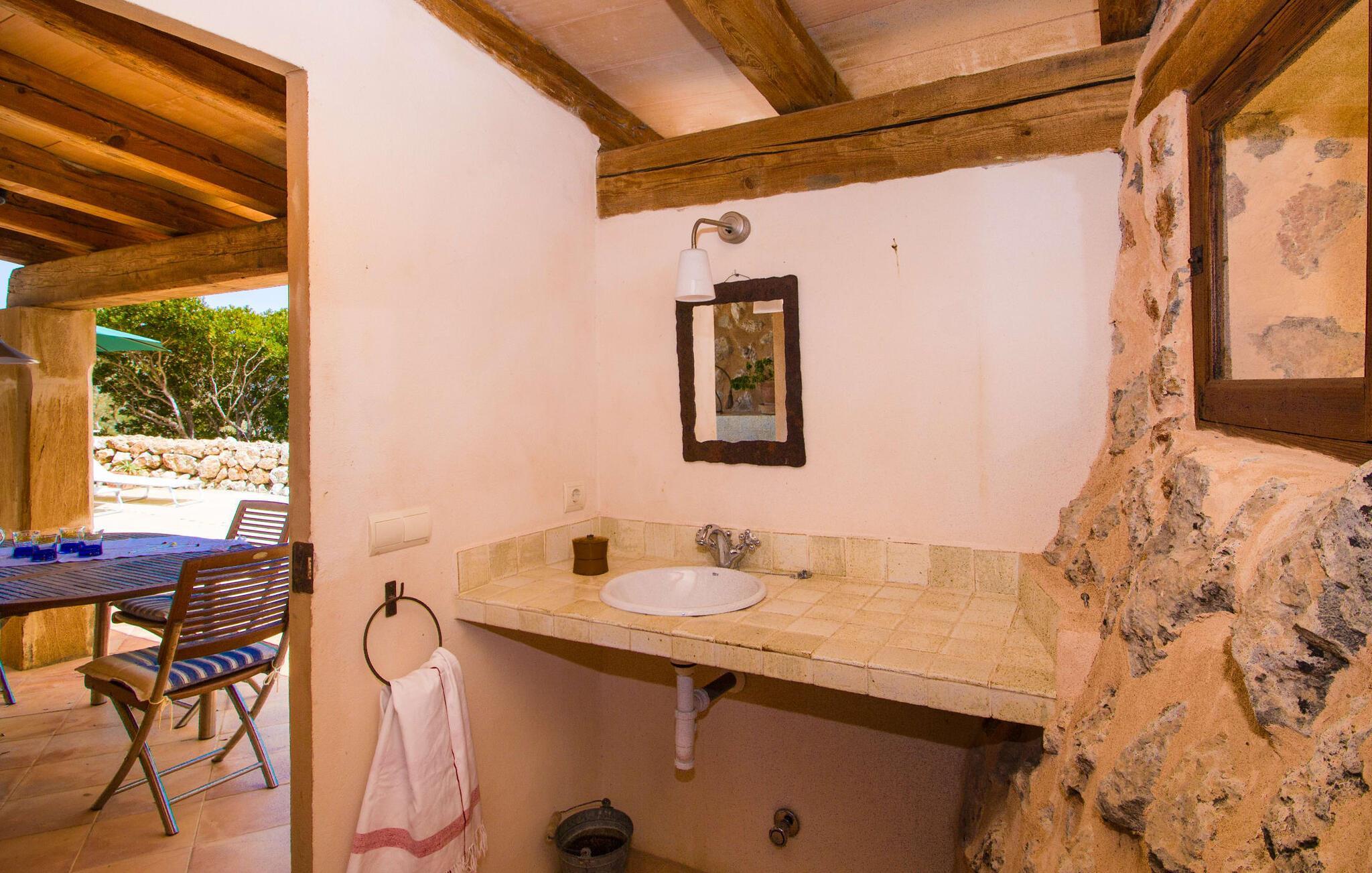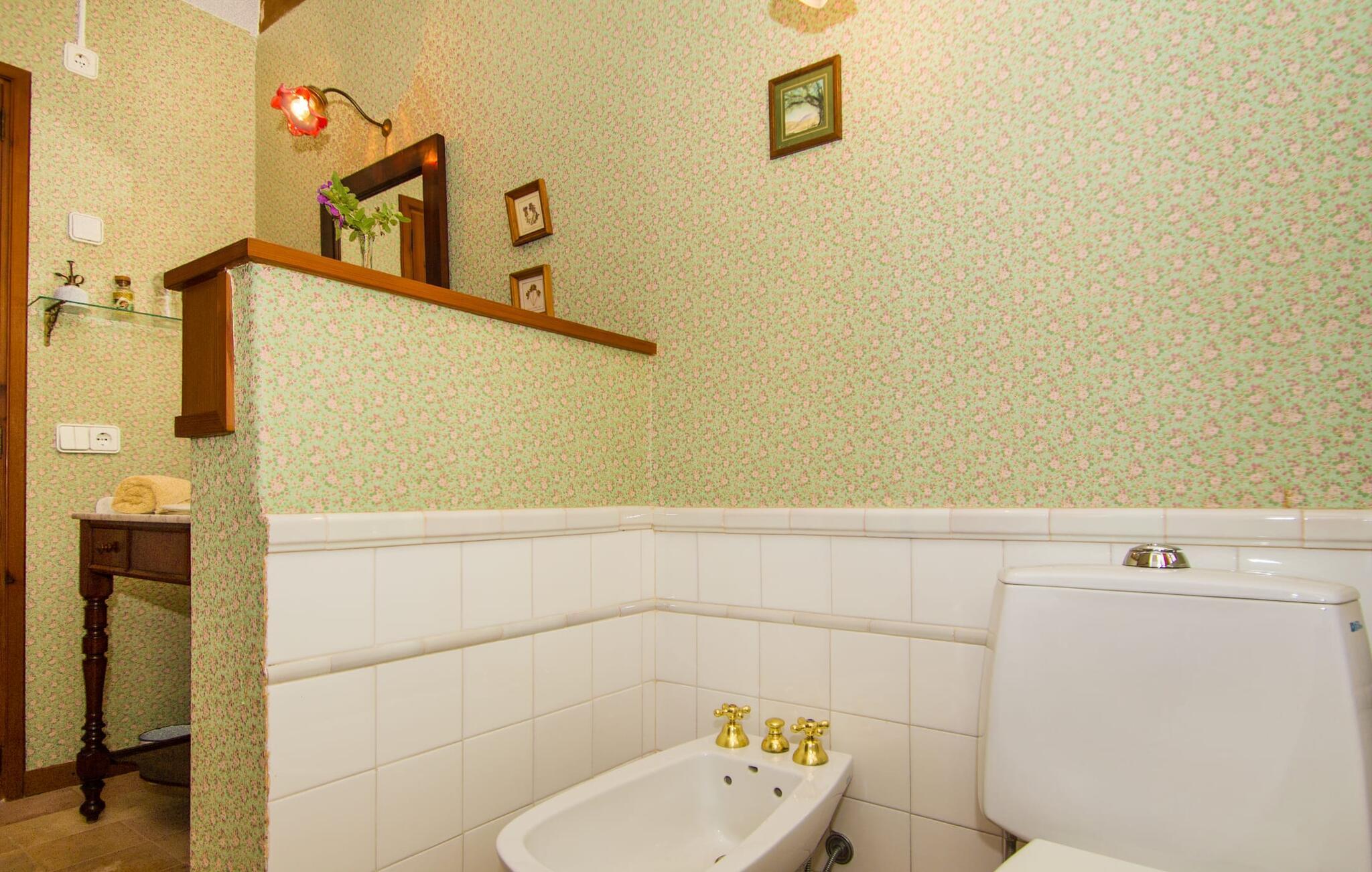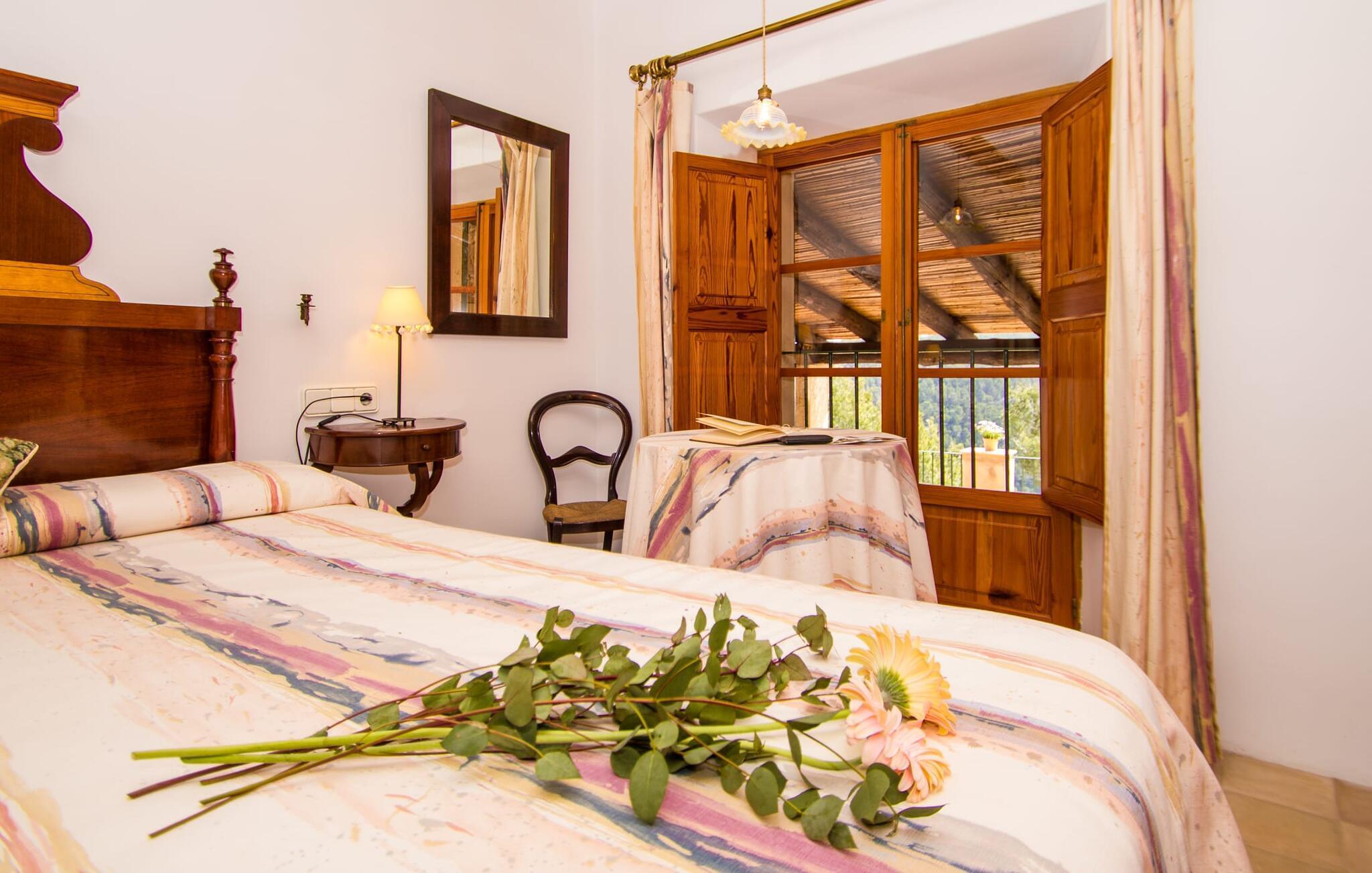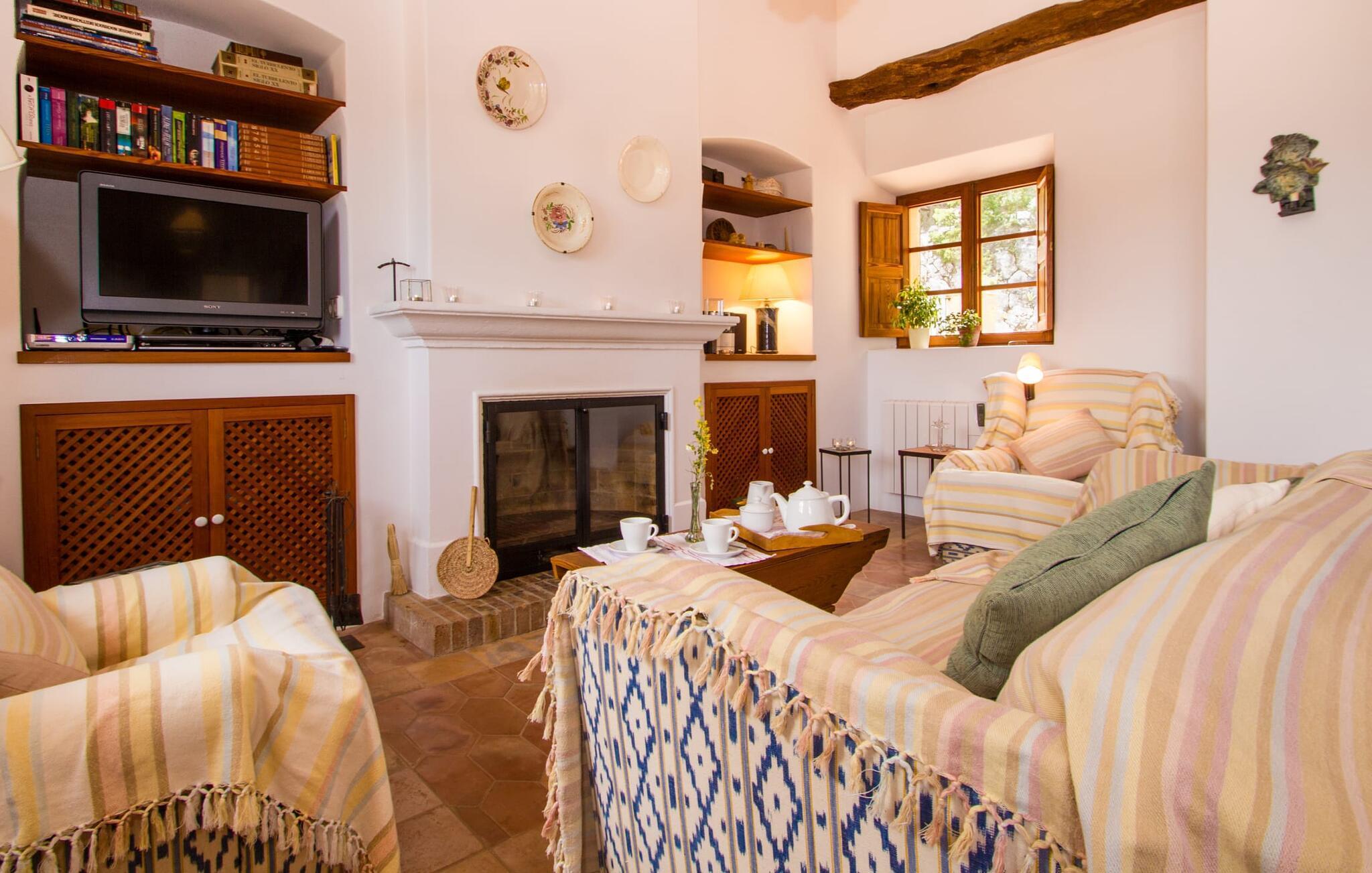 Dieses charmante alte Haus wurde so restauriert, dass es seinen ursprünglichen Charakter und sein ursprüngliches Ambiente bewahrt hat. Traditionelle Möbel und Dekorationsstücke schaffen hier eine authentische Atmosphäre, die es Ihnen ermöglicht, das echte Mallorca wirklich zu erleben. Große Räume laden zum Entspannen und Ausnutzen der 240 m² ein. Vom ebenerdigen Eingangsbereich, der mit zwei klassischen Schaukelstühlen geschmückt ist, geht es über ein paar Stufen hinunter in ein rundum gemütliches Wohn-/Esszimmer mit offener Küche. Entspannen Sie sich auf den bequemen Sofas mit einem guten Buch oder schauen Sie sich einen guten Film an oder setzen Sie sich an den runden Esstisch und genießen Sie gelegentlich drinnen eine köstliche Mahlzeit. Die Küche ist durch eine Theke vom größeren Bereich getrennt und mit allem ausgestattet, was Sie für den Urlaubsalltag benötigen, darunter ein Wasserkocher und eine Filterkaffeemaschine. Von diesem Zimmer aus haben Sie auch bequemen Zugang zur riesigen Terrasse, die fast rund um das Haus verläuft. Ein Schlafzimmer und ein Badezimmer mit Dusche befinden sich auf der gleichen Ebene wie der Eingang zum Haus, zwei weitere Schlafzimmer und ein Badezimmer befinden sich im Obergeschoss. Damit Sie gut schlafen können, stehen Ihnen hier zwei Betten in der Größe 2,00 x 1,80 m und zwei weitere in der Größe 1,90 x 0,90 zur Verfügung. Die Schlafzimmer sind alle auf ihre eigene Art und Weise eingerichtet, haben jedoch einen traditionellen Stil gemeinsam, der ihnen eine einladende Atmosphäre und sogar einen Hauch von Romantik verleiht. Dieses gemütliche, rustikale Design kommt auch in den Badezimmern voll zur Geltung. Sie müssen weder ein Bügeleisen noch einen Haartrockner einpacken; Nutzen Sie einfach die hier verfügbaren.
