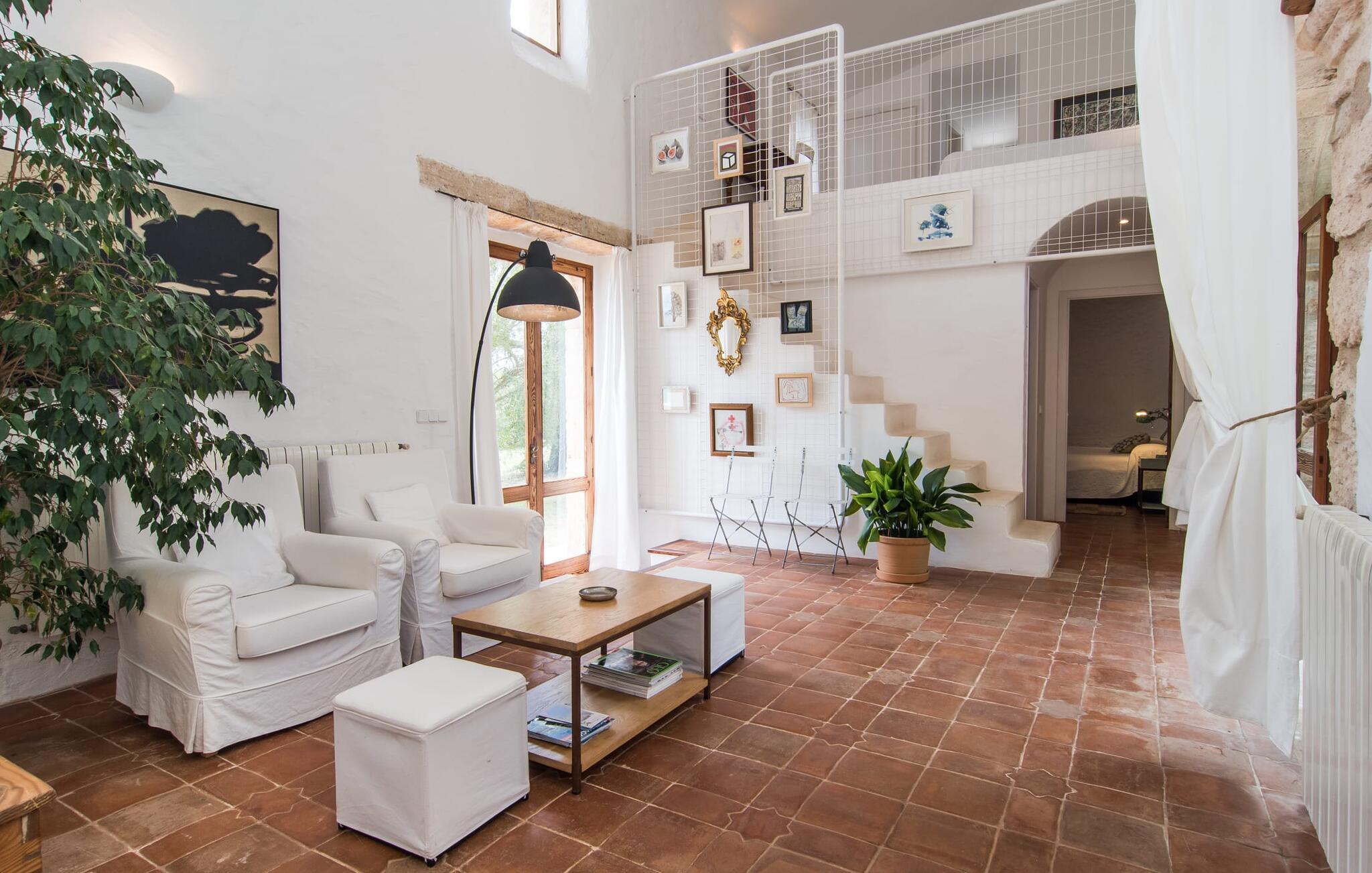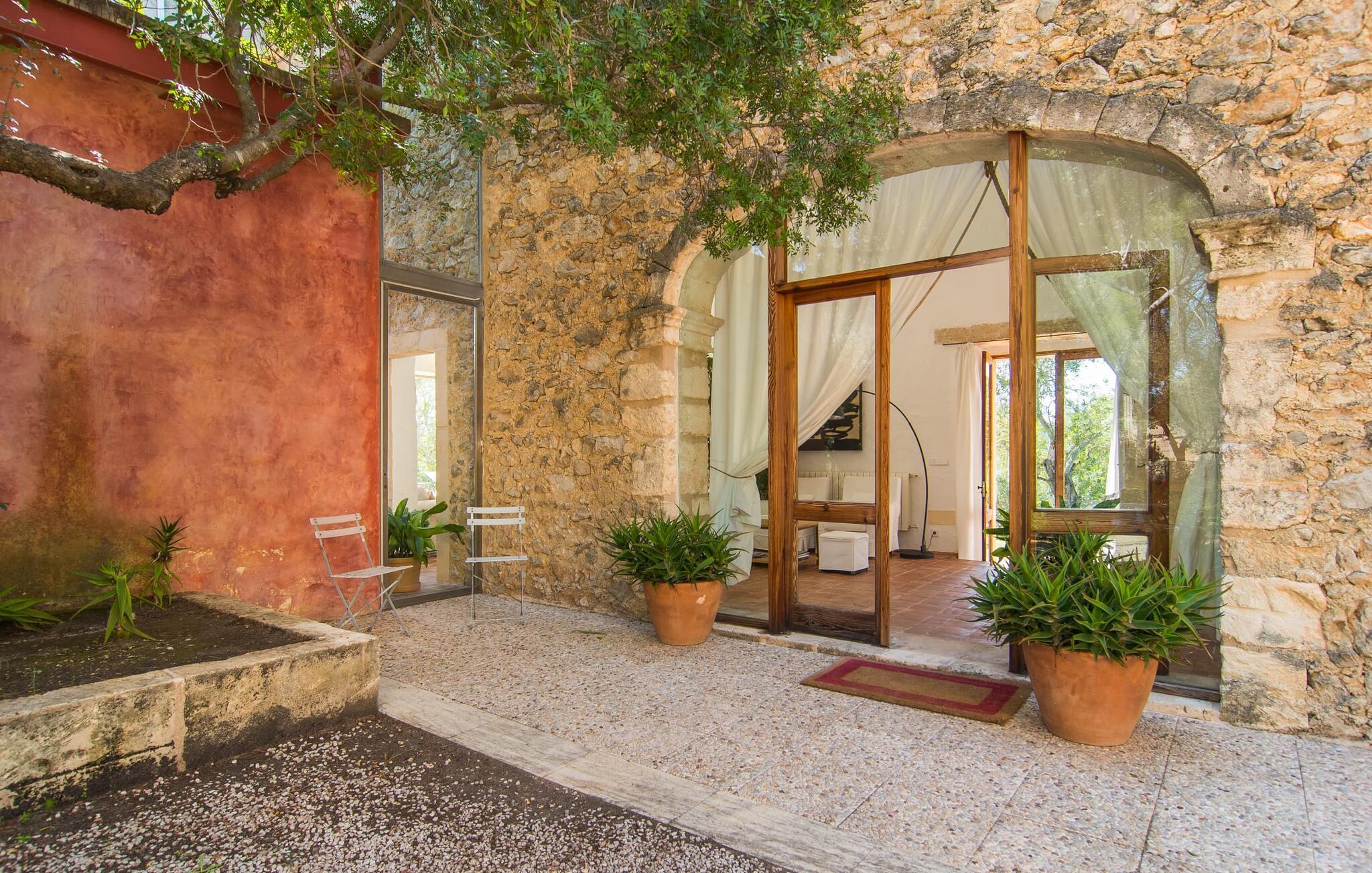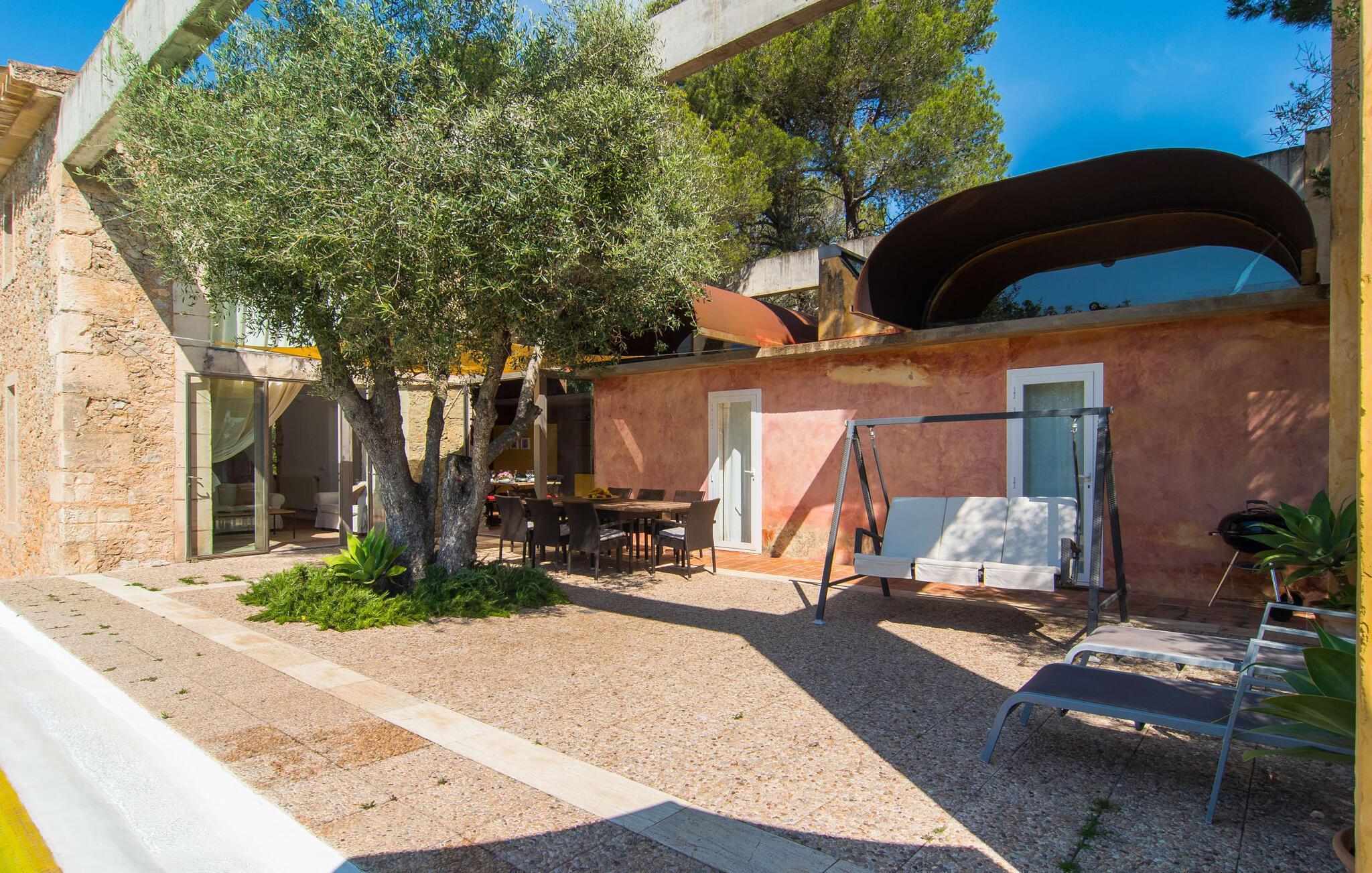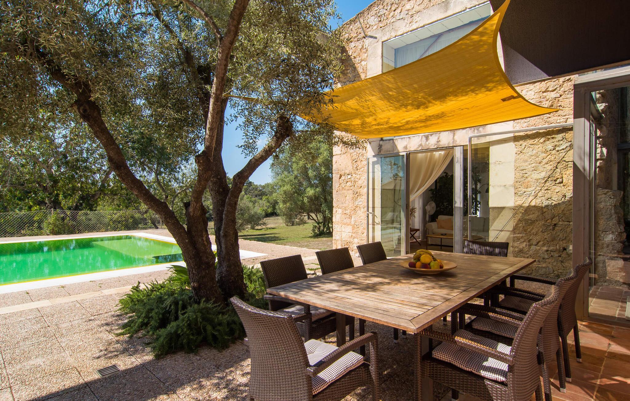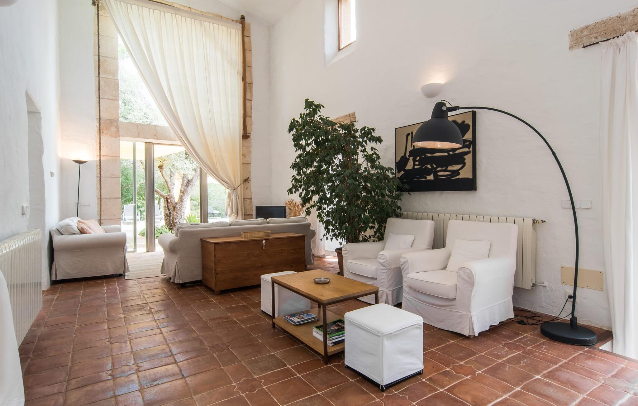 Direkt hinter dieser hübschen Villa gibt es einen Parkplatz. Es gibt keine Straßen in der Nähe und daher auch keinen Lärm oder Störungen. Die Villa „Viterbo“ befindet sich in einladender ländlicher Lage und bietet ideale Voraussetzungen für einen rundum erholsamen Urlaub. Der abgelegene Platz bietet durch die große Rasenfläche, die an einen kleinen Wald grenzt, eine sehr ruhige Umgebung, die sich besonders gut für einen schönen Urlaub eignet. Bäume und Sträucher sind auf dem Grundstück zwischen dem Pool und der Villa gepflanzt und säumen einen Teil der Terrasse; Sie versprühen viel Charme und bringen typisch mallorquinische Merkmale viel näher und schaffen so ein sehr romantisches und gemütliches Ambiente. Das Grundstück bietet eine atemberaubende Aussicht: Der Blick reicht über die leicht hügelige Landschaft bis zu den fernen Bergen und weiter hinaus in die typisch mallorquinische offene Landschaft, wo man gerade das Mittelmeer erkennen kann. Urlaubsvergnügen pur! Der großzügige Poolbereich mit Außendusche fügt sich harmonisch in dieses Grundstück ein. Der Pool selbst misst 8 x 8 m und ist zwischen 1,25 m und 2,25 m tief und lädt zum langsamen Eintauchen und Schwimmen ein. Der Pool ist gelb gefliest. Im direkten Sonnenlicht nimmt es wunderschöne Grün-Blau-Gelb-Töne an – einfach bezaubernd! Nach dem Schwimmen können Sie sich auf einer der zahlreichen Liegestühle, auf Wunsch unter ein paar Sonnenschirmen, etwas ausruhen und es sich auf der umlaufenden Terrasse gemütlich machen. Bei schönem Wetter sollten Sie Ihr Frühstück und Abendessen auf der Terrasse vor dem Wohnzimmer genießen. Der Charme der Villa „Viterbo“ kommt hier besonders zur Geltung. Hier können Sie rund um einen großen Esstisch mit bequemen Stühlen die Atmosphäre genießen und so viel wie möglich davon in sich aufnehmen. Besonders hervorzuheben ist die Tatsache, dass das Haus dank seines geringen Überstandes viel Sonne bietet; Allerdings bietet es auch schattige Plätzchen. Wenn Sie das Gebäude von außen betrachten, fällt Ihnen ein weiteres auffälliges Merkmal auf: Die Villa besteht aus einem traditionell restaurierten Teil, der aus altem, für die Insel typischem Stein erbaut wurde, sowie einem sehr modernen Anbau, der an eine Designervilla erinnert.