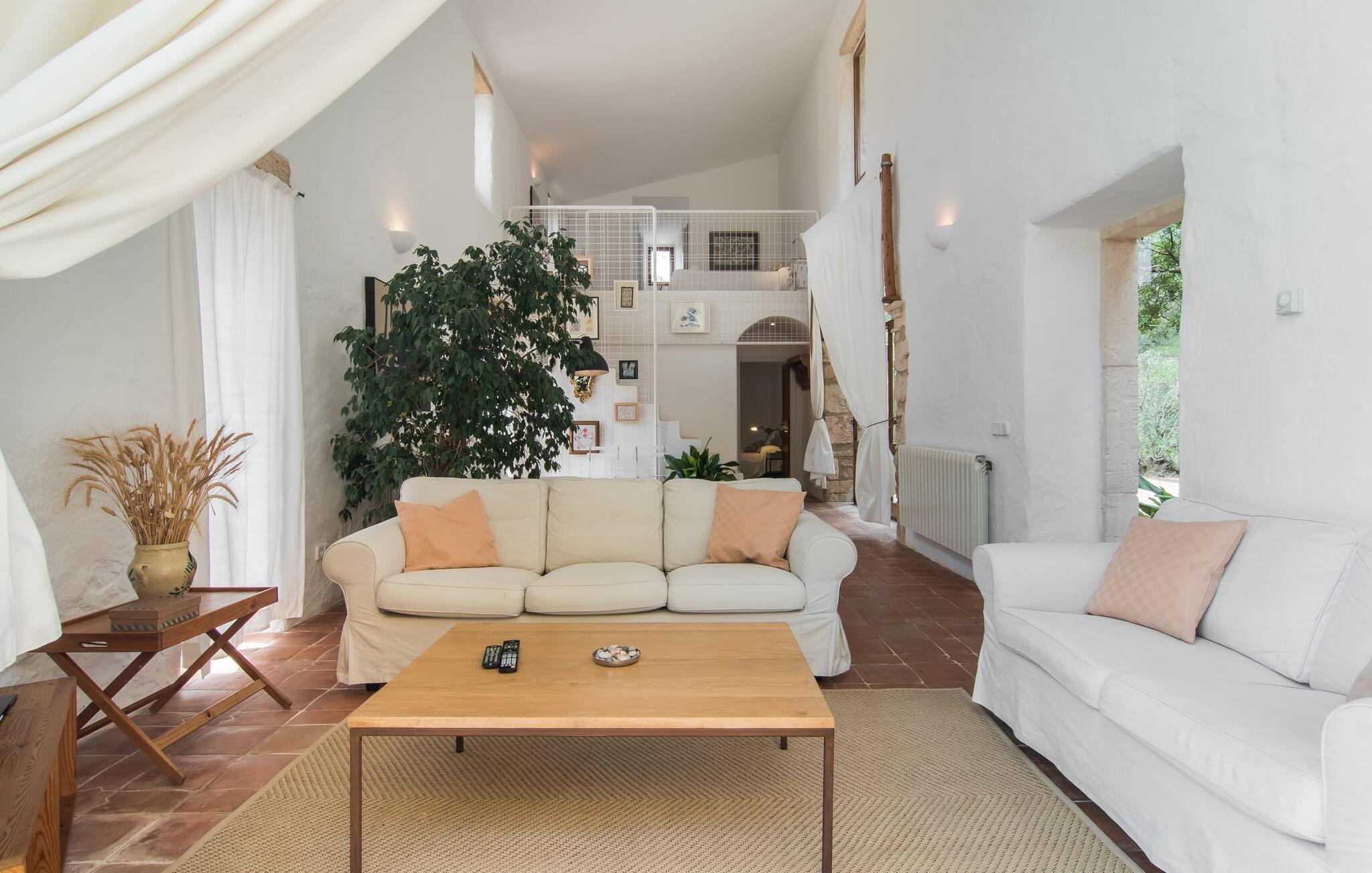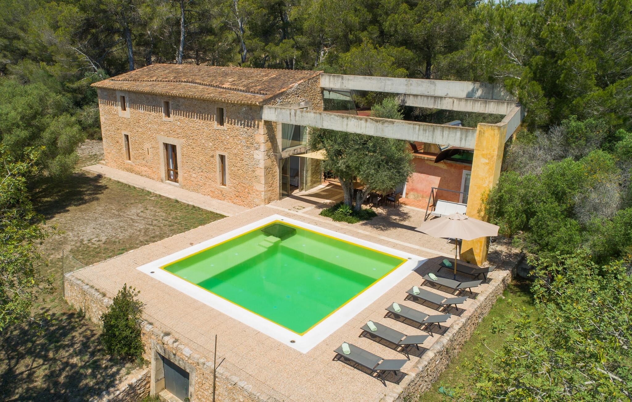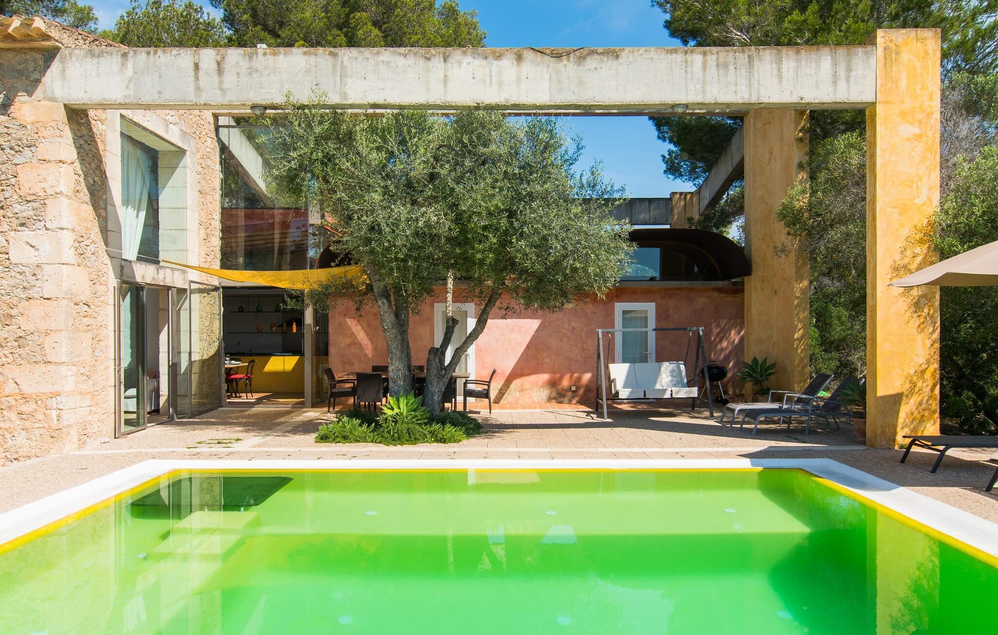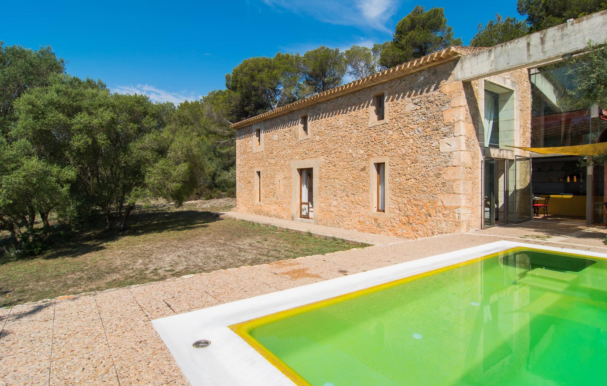 Direkt hinter dieser hübschen Villa gibt es einen Parkplatz. Es gibt keine Straßen in der Nähe und daher auch keinen Lärm oder Störungen. Die Villa „Viterbo“ befindet sich in einladender ländlicher Lage und bietet ideale Voraussetzungen für einen rundum erholsamen Urlaub. Der abgelegene Platz bietet durch die große Rasenfläche, die an einen kleinen Wald grenzt, eine sehr ruhige Umgebung, die sich besonders gut für einen schönen Urlaub eignet. Bäume und Sträucher sind auf dem Grundstück zwischen dem Pool und der Villa gepflanzt und säumen einen Teil der Terrasse; Sie versprühen viel Charme und bringen typisch mallorquinische Merkmale viel näher und schaffen so ein sehr romantisches und gemütliches Ambiente. Das Grundstück bietet eine atemberaubende Aussicht: Der Blick reicht über die leicht hügelige Landschaft bis zu den fernen Bergen und weiter hinaus in die typisch mallorquinische offene Landschaft, wo man gerade das Mittelmeer erkennen kann. Urlaubsvergnügen pur! Der großzügige Poolbereich mit Außendusche fügt sich harmonisch in dieses Grundstück ein. Der Pool selbst misst 8 x 8 m und ist zwischen 1,25 m und 2,25 m tief und lädt zum langsamen Eintauchen und Schwimmen ein. Der Pool ist gelb gefliest. Im direkten Sonnenlicht nimmt es wunderschöne Grün-Blau-Gelb-Töne an – einfach bezaubernd! Nach dem Schwimmen können Sie sich auf einer der zahlreichen Liegestühle, auf Wunsch unter ein paar Sonnenschirmen, etwas ausruhen und es sich auf der umlaufenden Terrasse gemütlich machen. Bei schönem Wetter sollten Sie Ihr Frühstück und Abendessen auf der Terrasse vor dem Wohnzimmer genießen. Der Charme der Villa „Viterbo“ kommt hier besonders zur Geltung. Hier können Sie rund um einen großen Esstisch mit bequemen Stühlen die Atmosphäre genießen und so viel wie möglich davon in sich aufnehmen. Besonders hervorzuheben ist die Tatsache, dass das Haus dank seines geringen Überstandes viel Sonne bietet; Allerdings bietet es auch schattige Plätzchen. Wenn Sie das Gebäude von außen betrachten, fällt Ihnen ein weiteres auffälliges Merkmal auf: Die Villa besteht aus einem traditionell restaurierten Teil, der aus altem, für die Insel typischem Stein erbaut wurde, sowie einem sehr modernen Anbau, der an eine Designervilla erinnert.