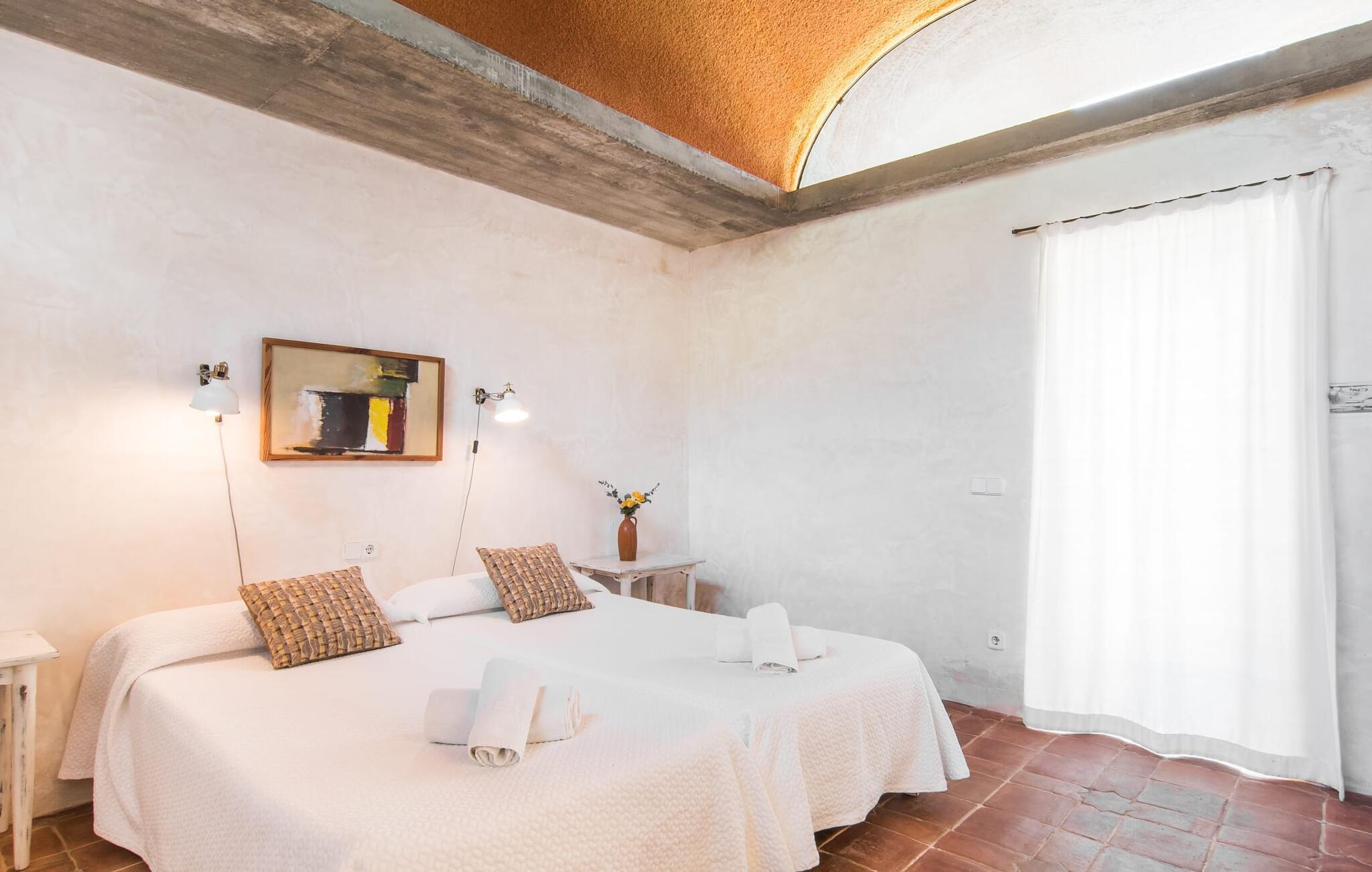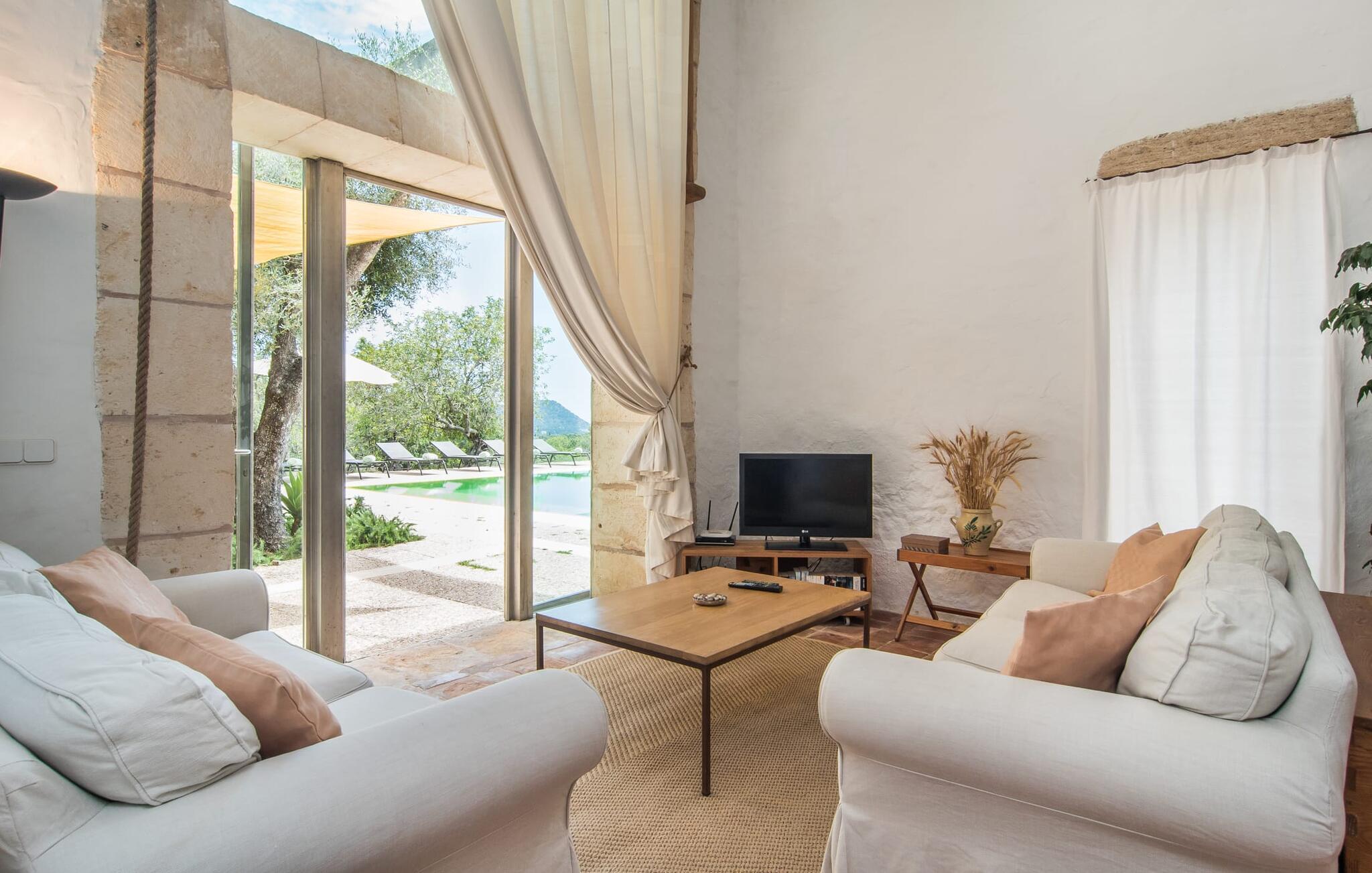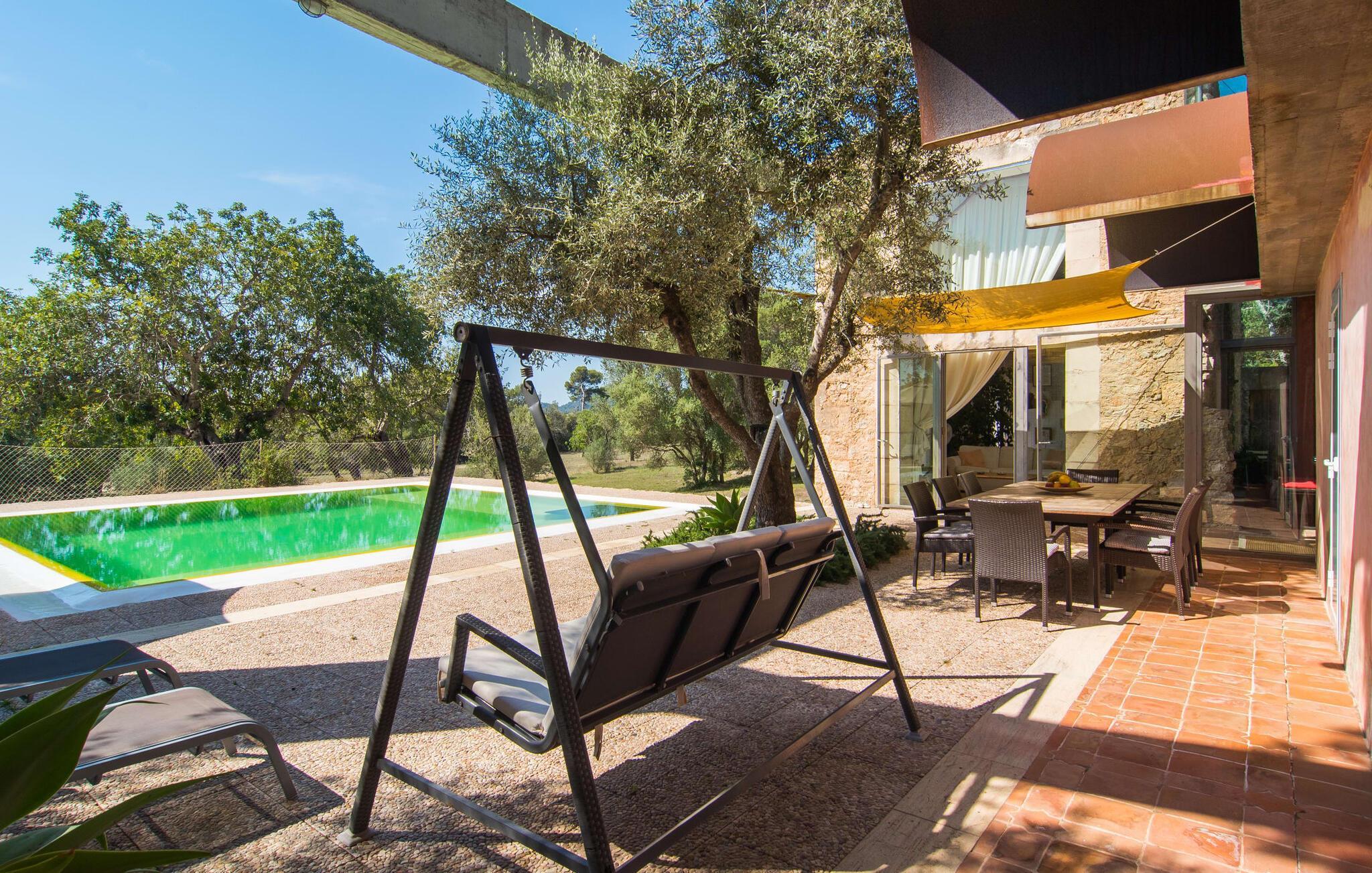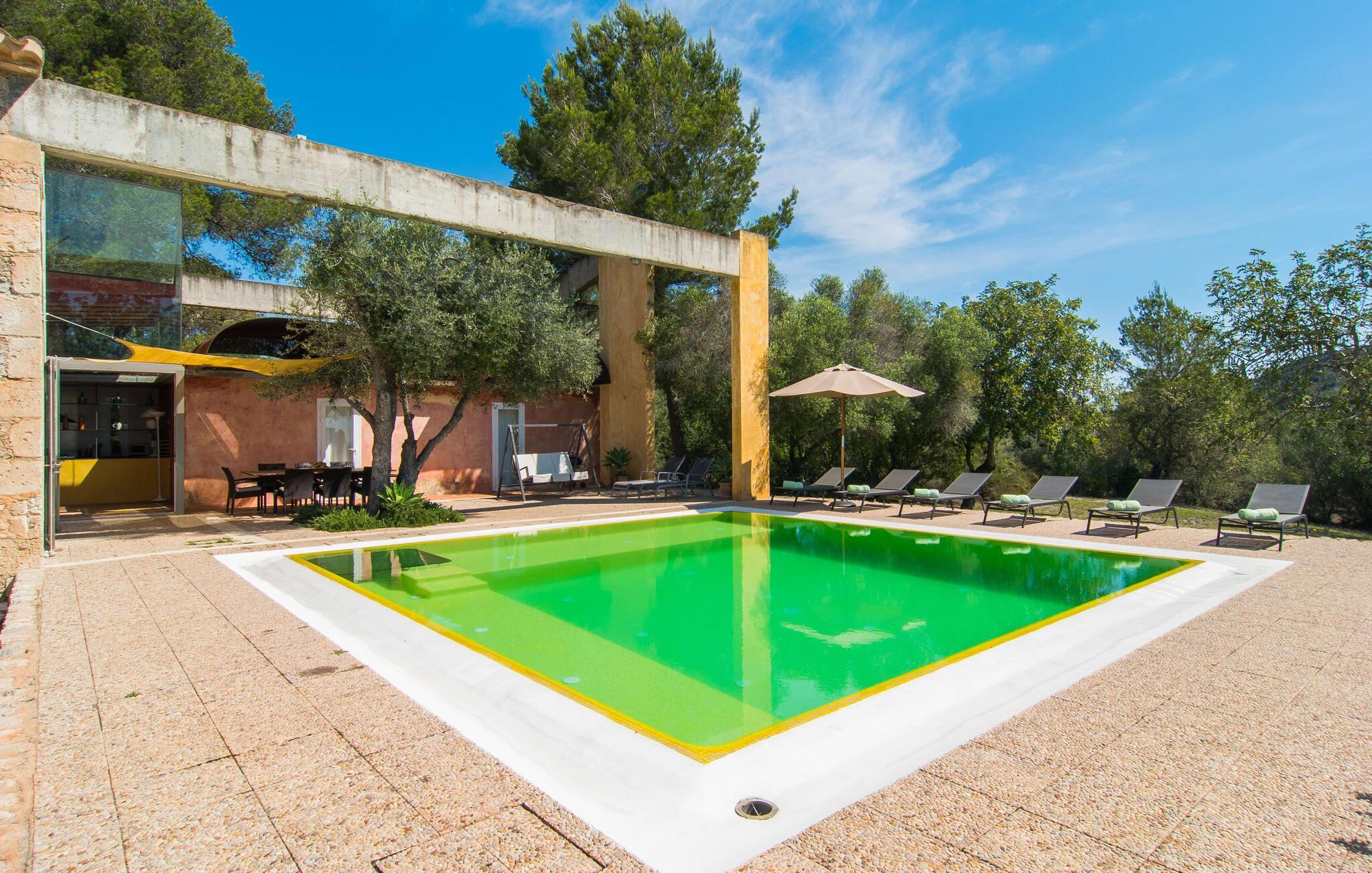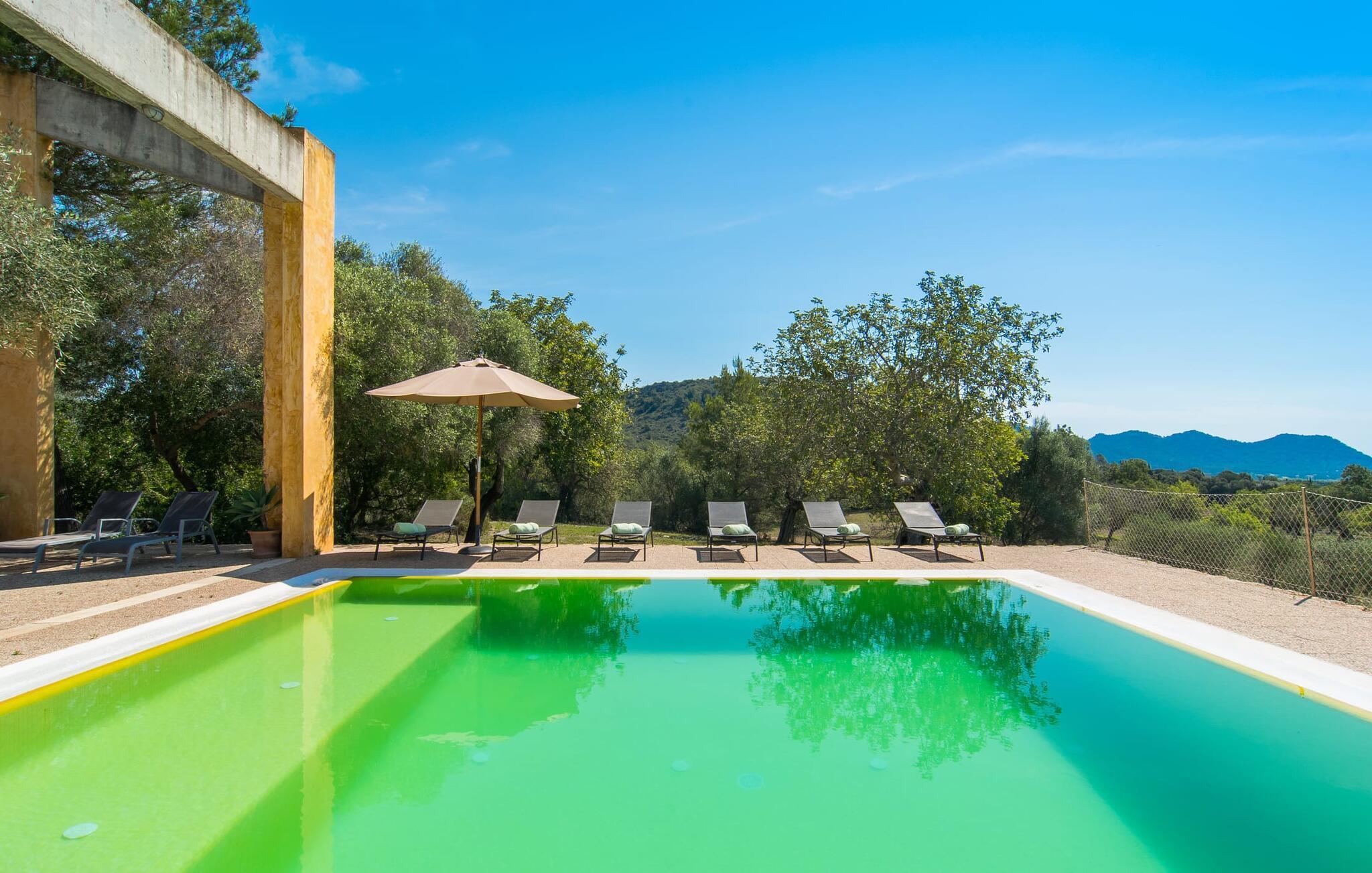 Direkt hinter dieser hübschen Villa gibt es einen Parkplatz. Es gibt keine Straßen in der Nähe und daher auch keinen Lärm oder Störungen. Die Villa „Viterbo“ befindet sich in einladender ländlicher Lage und bietet ideale Voraussetzungen für einen rundum erholsamen Urlaub. Der abgelegene Platz bietet durch die große Rasenfläche, die an einen kleinen Wald grenzt, eine sehr ruhige Umgebung, die sich besonders gut für einen schönen Urlaub eignet. Bäume und Sträucher sind auf dem Grundstück zwischen dem Pool und der Villa gepflanzt und säumen einen Teil der Terrasse; Sie versprühen viel Charme und bringen typisch mallorquinische Merkmale viel näher und schaffen so ein sehr romantisches und gemütliches Ambiente. Das Grundstück bietet eine atemberaubende Aussicht: Der Blick reicht über die leicht hügelige Landschaft bis zu den fernen Bergen und weiter hinaus in die typisch mallorquinische offene Landschaft, wo man gerade das Mittelmeer erkennen kann. Urlaubsvergnügen pur! Der großzügige Poolbereich mit Außendusche fügt sich harmonisch in dieses Grundstück ein. Der Pool selbst misst 8 x 8 m und ist zwischen 1,25 m und 2,25 m tief und lädt zum langsamen Eintauchen und Schwimmen ein. Der Pool ist gelb gefliest. Im direkten Sonnenlicht nimmt es wunderschöne Grün-Blau-Gelb-Töne an – einfach bezaubernd! Nach dem Schwimmen können Sie sich auf einer der zahlreichen Liegestühle, auf Wunsch unter ein paar Sonnenschirmen, etwas ausruhen und es sich auf der umlaufenden Terrasse gemütlich machen. Bei schönem Wetter sollten Sie Ihr Frühstück und Abendessen auf der Terrasse vor dem Wohnzimmer genießen. Der Charme der Villa „Viterbo“ kommt hier besonders zur Geltung. Hier können Sie rund um einen großen Esstisch mit bequemen Stühlen die Atmosphäre genießen und so viel wie möglich davon in sich aufnehmen. Besonders hervorzuheben ist die Tatsache, dass das Haus dank seines geringen Überstandes viel Sonne bietet; Allerdings bietet es auch schattige Plätzchen. Wenn Sie das Gebäude von außen betrachten, fällt Ihnen ein weiteres auffälliges Merkmal auf: Die Villa besteht aus einem traditionell restaurierten Teil, der aus altem, für die Insel typischem Stein erbaut wurde, sowie einem sehr modernen Anbau, der an eine Designervilla erinnert.