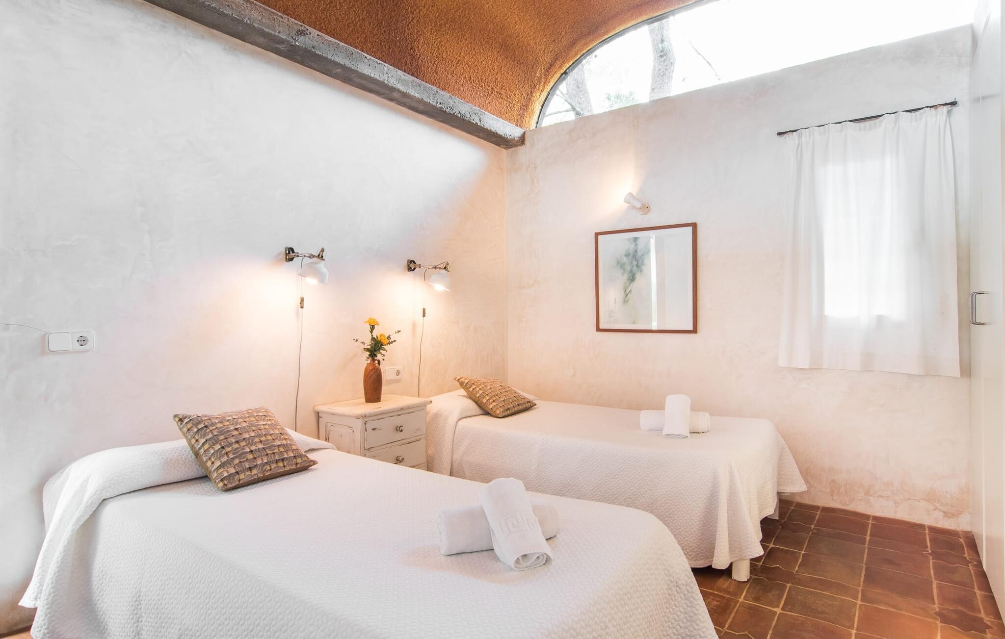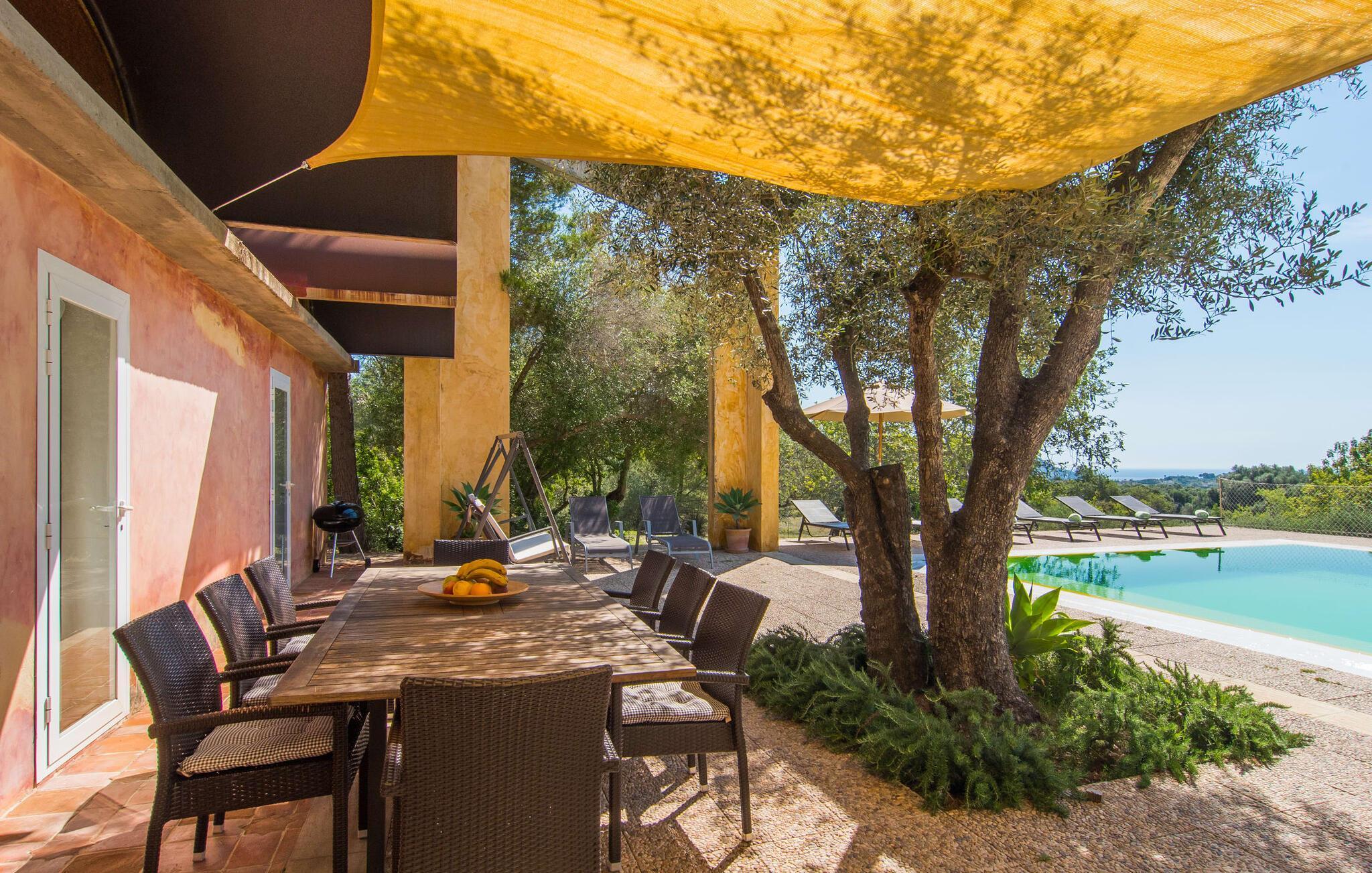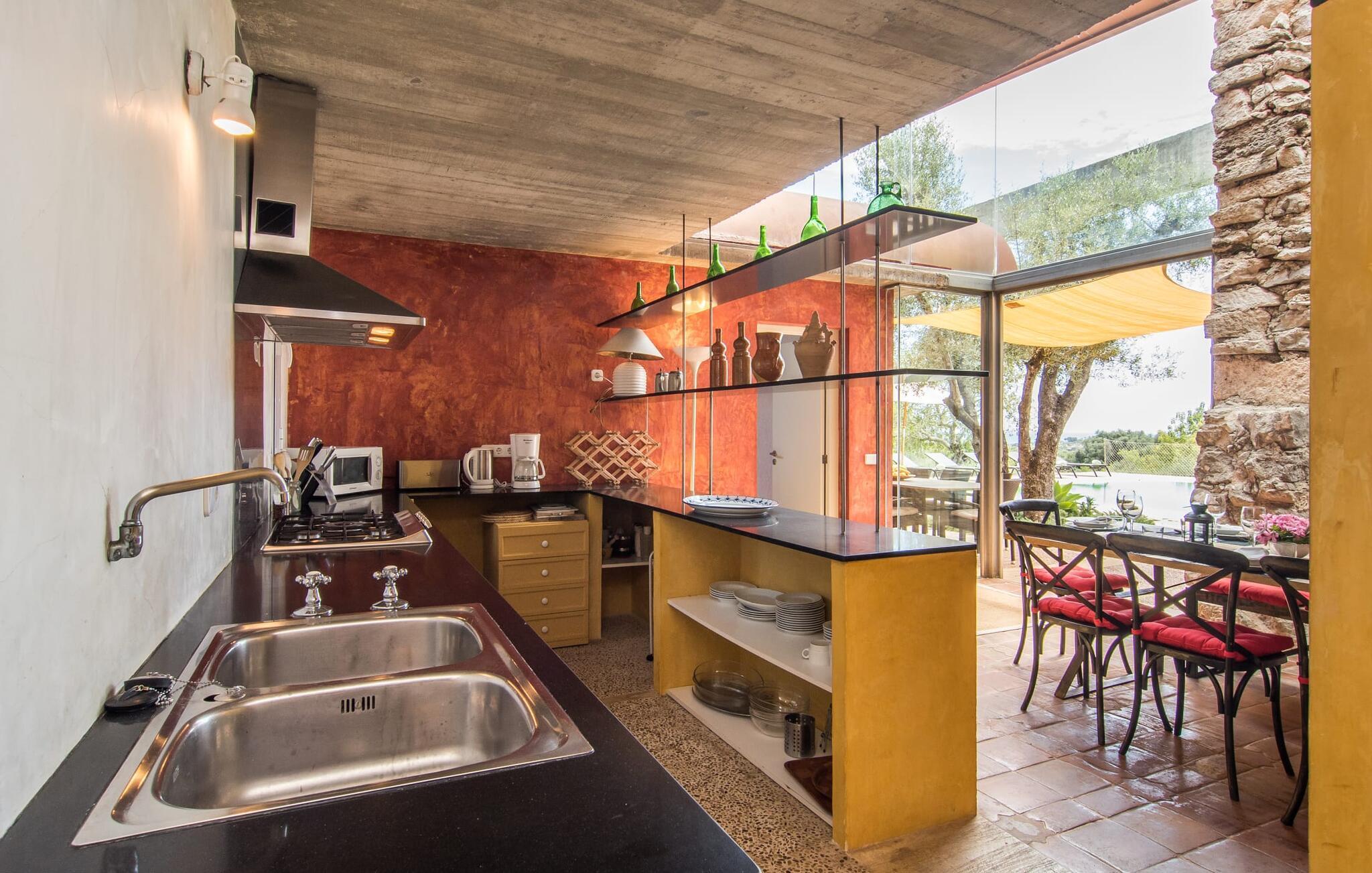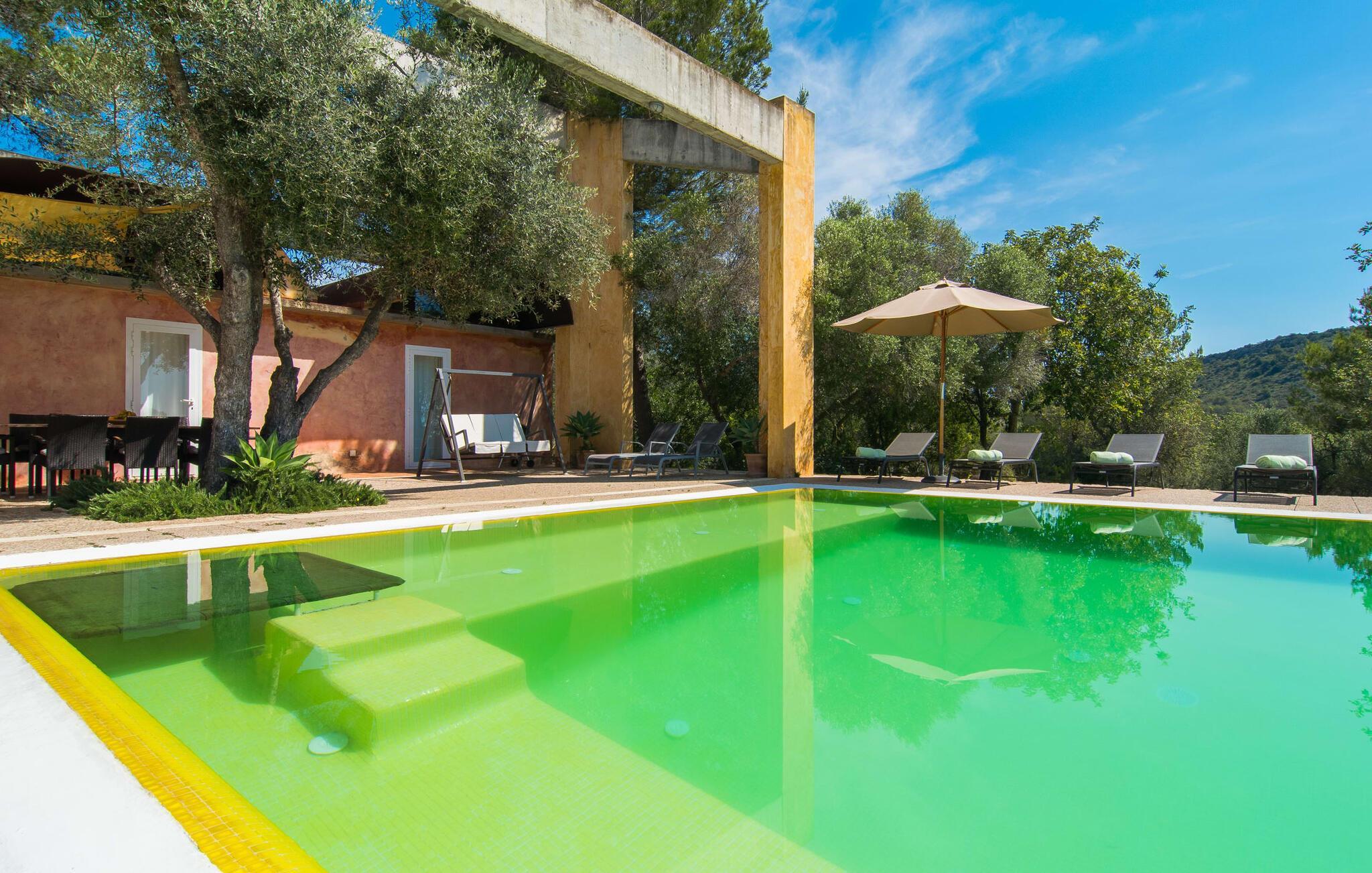 Direkt hinter dieser hübschen Villa gibt es einen Parkplatz. Es gibt keine Straßen in der Nähe und daher auch keinen Lärm oder Störungen. Die Villa „Viterbo“ befindet sich in einladender ländlicher Lage und bietet ideale Voraussetzungen für einen rundum erholsamen Urlaub. Der abgelegene Platz bietet durch die große Rasenfläche, die an einen kleinen Wald grenzt, eine sehr ruhige Umgebung, die sich besonders gut für einen schönen Urlaub eignet. Bäume und Sträucher sind auf dem Grundstück zwischen dem Pool und der Villa gepflanzt und säumen einen Teil der Terrasse; Sie versprühen viel Charme und bringen typisch mallorquinische Merkmale viel näher und schaffen so ein sehr romantisches und gemütliches Ambiente. Das Grundstück bietet eine atemberaubende Aussicht: Der Blick reicht über die leicht hügelige Landschaft bis zu den fernen Bergen und weiter hinaus in die typisch mallorquinische offene Landschaft, wo man gerade das Mittelmeer erkennen kann. Urlaubsvergnügen pur! Der großzügige Poolbereich mit Außendusche fügt sich harmonisch in dieses Grundstück ein. Der Pool selbst misst 8 x 8 m und ist zwischen 1,25 m und 2,25 m tief und lädt zum langsamen Eintauchen und Schwimmen ein. Der Pool ist gelb gefliest. Im direkten Sonnenlicht nimmt es wunderschöne Grün-Blau-Gelb-Töne an – einfach bezaubernd! Nach dem Schwimmen können Sie sich auf einer der zahlreichen Liegestühle, auf Wunsch unter ein paar Sonnenschirmen, etwas ausruhen und es sich auf der umlaufenden Terrasse gemütlich machen. Bei schönem Wetter sollten Sie Ihr Frühstück und Abendessen auf der Terrasse vor dem Wohnzimmer genießen. Der Charme der Villa „Viterbo“ kommt hier besonders zur Geltung. Hier können Sie rund um einen großen Esstisch mit bequemen Stühlen die Atmosphäre genießen und so viel wie möglich davon in sich aufnehmen. Besonders hervorzuheben ist die Tatsache, dass das Haus dank seines geringen Überstandes viel Sonne bietet; Allerdings bietet es auch schattige Plätzchen. Wenn Sie das Gebäude von außen betrachten, fällt Ihnen ein weiteres auffälliges Merkmal auf: Die Villa besteht aus einem traditionell restaurierten Teil, der aus altem, für die Insel typischem Stein erbaut wurde, sowie einem sehr modernen Anbau, der an eine Designervilla erinnert.