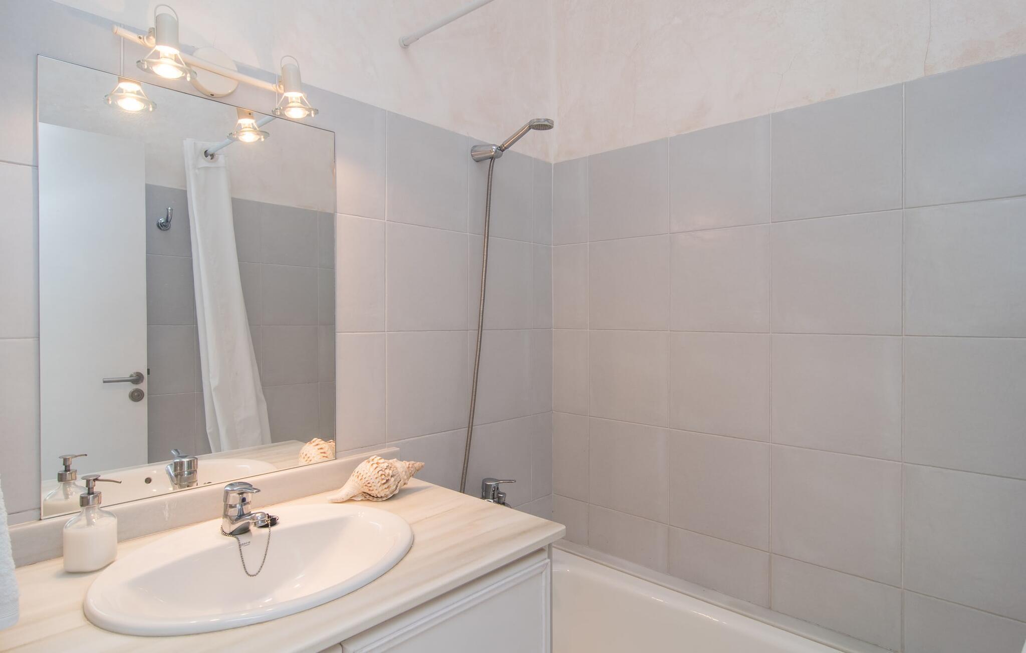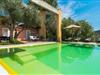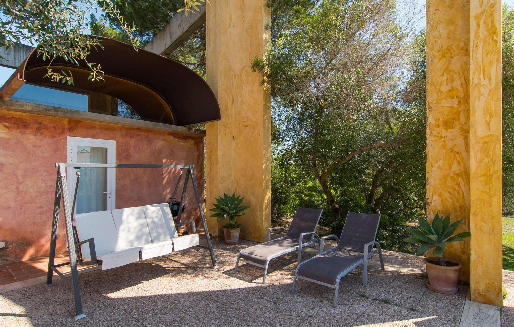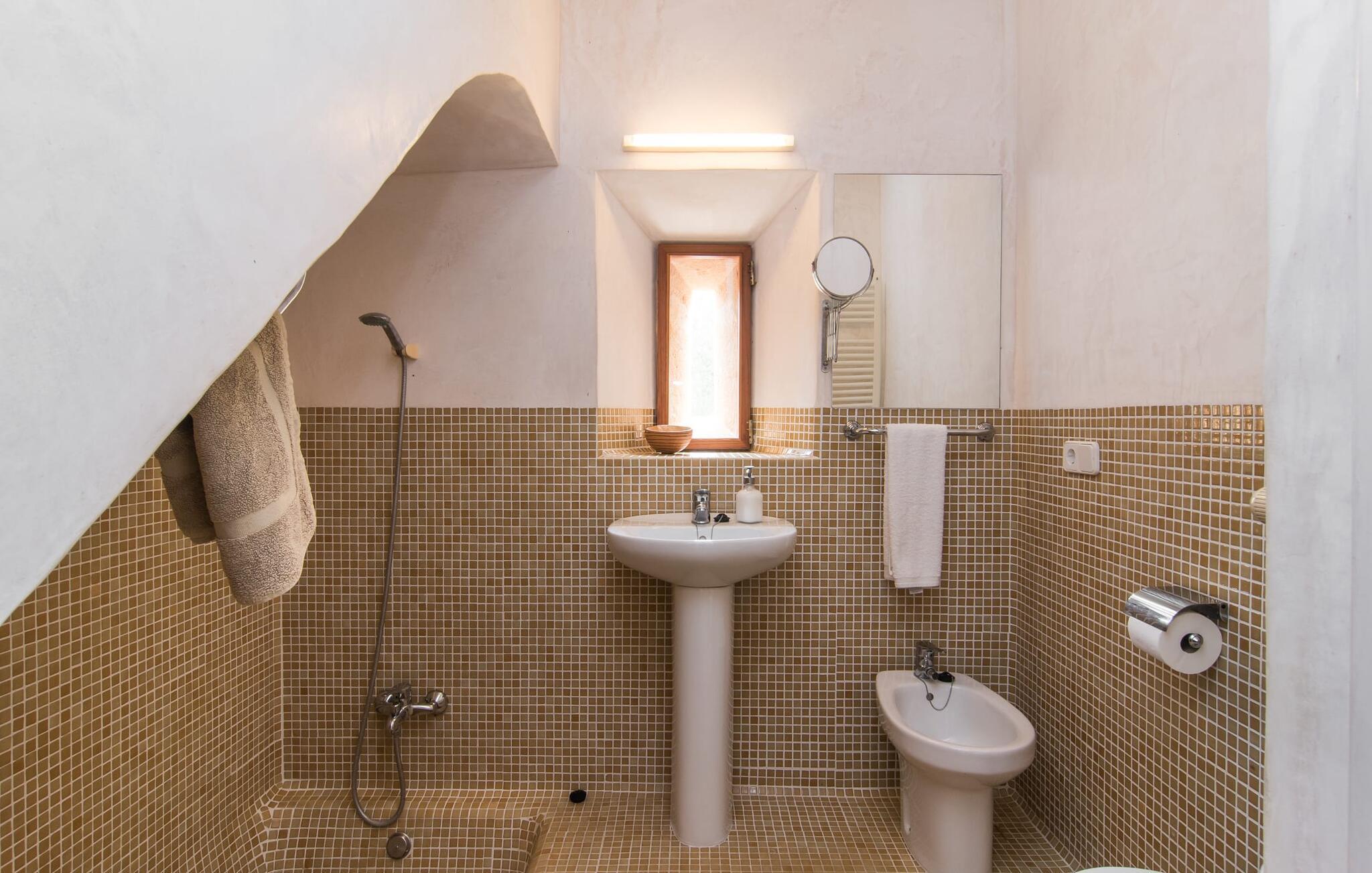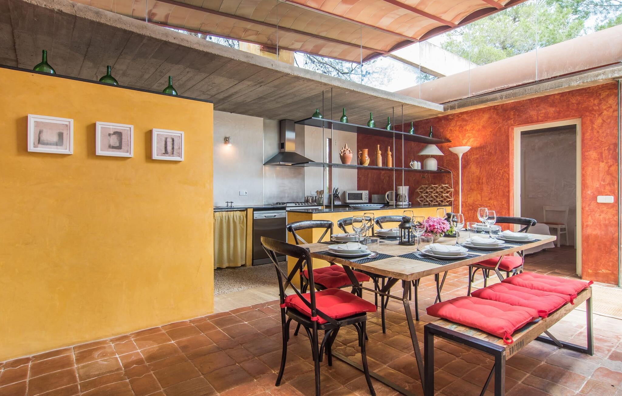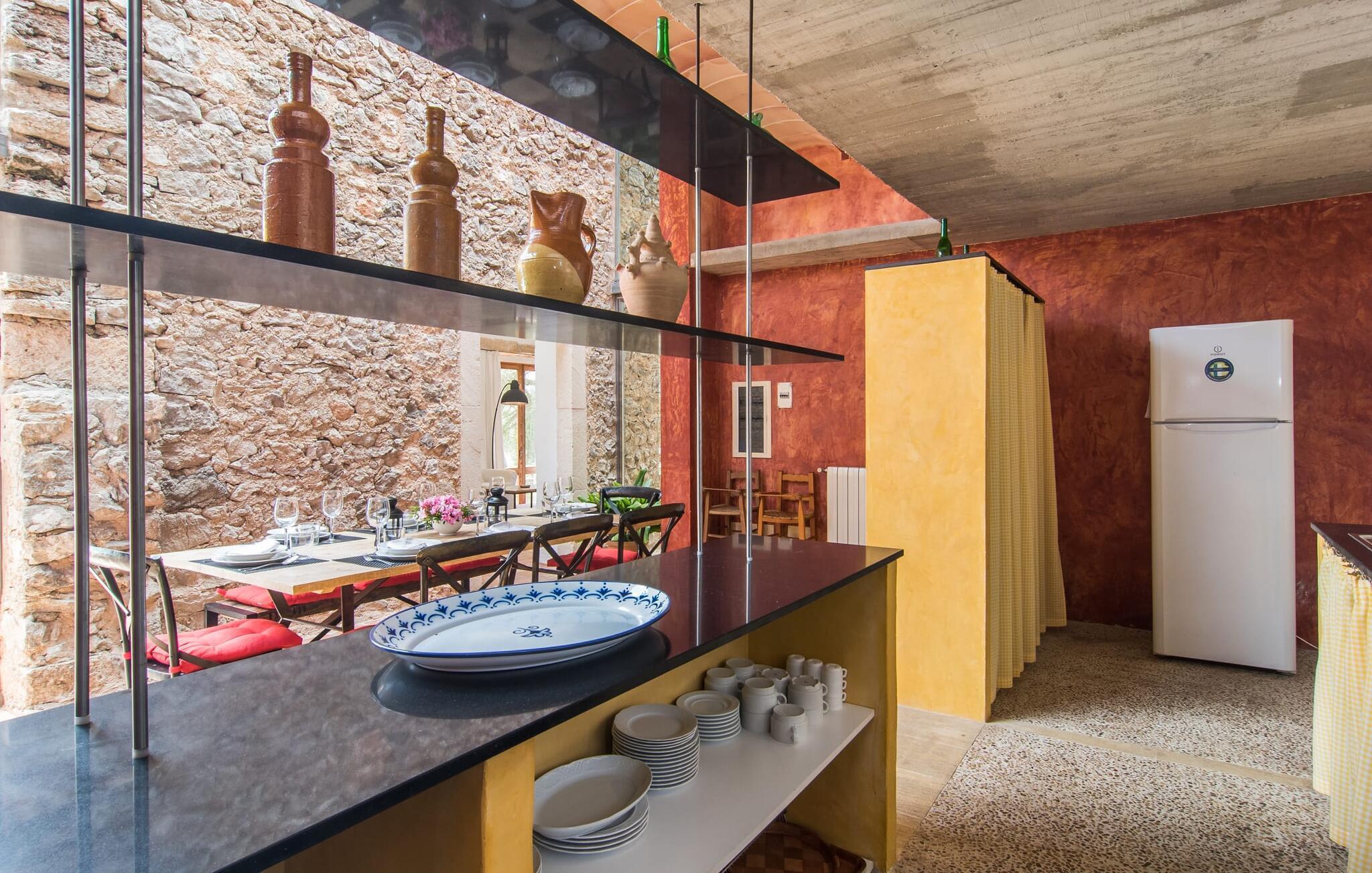 Direkt hinter dieser hübschen Villa gibt es einen Parkplatz. Es gibt keine Straßen in der Nähe und daher auch keinen Lärm oder Störungen. Die Villa „Viterbo“ befindet sich in einladender ländlicher Lage und bietet ideale Voraussetzungen für einen rundum erholsamen Urlaub. Der abgelegene Platz bietet durch die große Rasenfläche, die an einen kleinen Wald grenzt, eine sehr ruhige Umgebung, die sich besonders gut für einen schönen Urlaub eignet. Bäume und Sträucher sind auf dem Grundstück zwischen dem Pool und der Villa gepflanzt und säumen einen Teil der Terrasse; Sie versprühen viel Charme und bringen typisch mallorquinische Merkmale viel näher und schaffen so ein sehr romantisches und gemütliches Ambiente. Das Grundstück bietet eine atemberaubende Aussicht: Der Blick reicht über die leicht hügelige Landschaft bis zu den fernen Bergen und weiter hinaus in die typisch mallorquinische offene Landschaft, wo man gerade das Mittelmeer erkennen kann. Urlaubsvergnügen pur! Der großzügige Poolbereich mit Außendusche fügt sich harmonisch in dieses Grundstück ein. Der Pool selbst misst 8 x 8 m und ist zwischen 1,25 m und 2,25 m tief und lädt zum langsamen Eintauchen und Schwimmen ein. Der Pool ist gelb gefliest. Im direkten Sonnenlicht nimmt es wunderschöne Grün-Blau-Gelb-Töne an – einfach bezaubernd! Nach dem Schwimmen können Sie sich auf einer der zahlreichen Liegestühle, auf Wunsch unter ein paar Sonnenschirmen, etwas ausruhen und es sich auf der umlaufenden Terrasse gemütlich machen. Bei schönem Wetter sollten Sie Ihr Frühstück und Abendessen auf der Terrasse vor dem Wohnzimmer genießen. Der Charme der Villa „Viterbo“ kommt hier besonders zur Geltung. Hier können Sie rund um einen großen Esstisch mit bequemen Stühlen die Atmosphäre genießen und so viel wie möglich davon in sich aufnehmen. Besonders hervorzuheben ist die Tatsache, dass das Haus dank seines geringen Überstandes viel Sonne bietet; Allerdings bietet es auch schattige Plätzchen. Wenn Sie das Gebäude von außen betrachten, fällt Ihnen ein weiteres auffälliges Merkmal auf: Die Villa besteht aus einem traditionell restaurierten Teil, der aus altem, für die Insel typischem Stein erbaut wurde, sowie einem sehr modernen Anbau, der an eine Designervilla erinnert.
