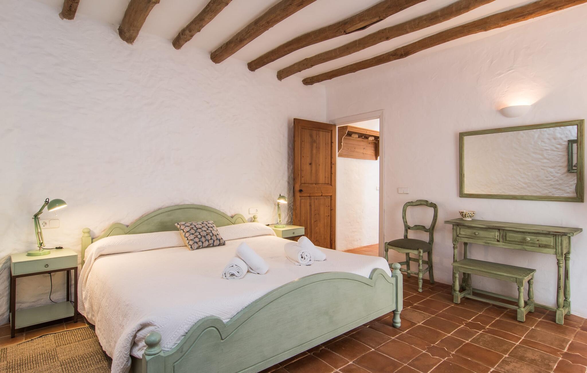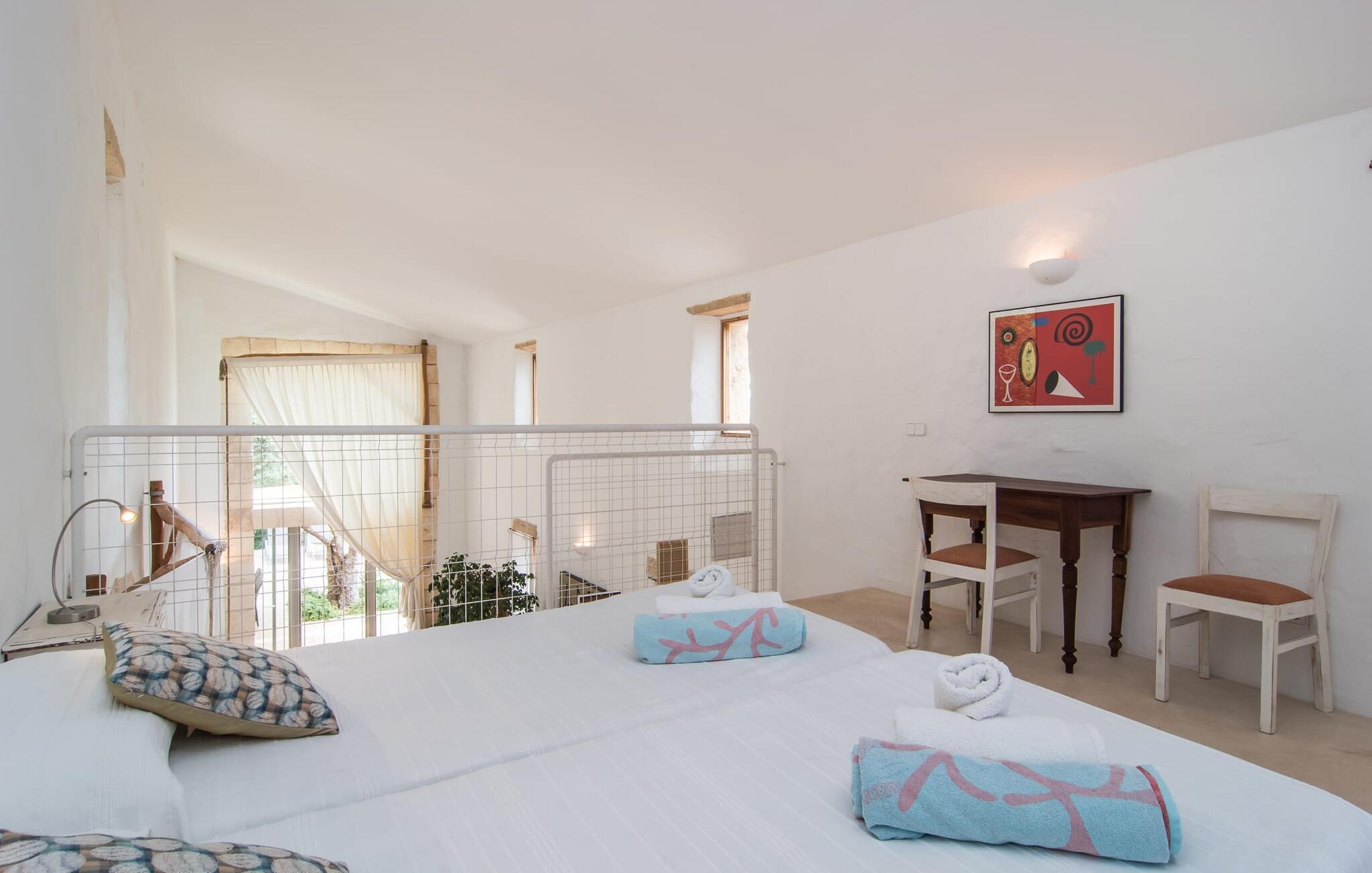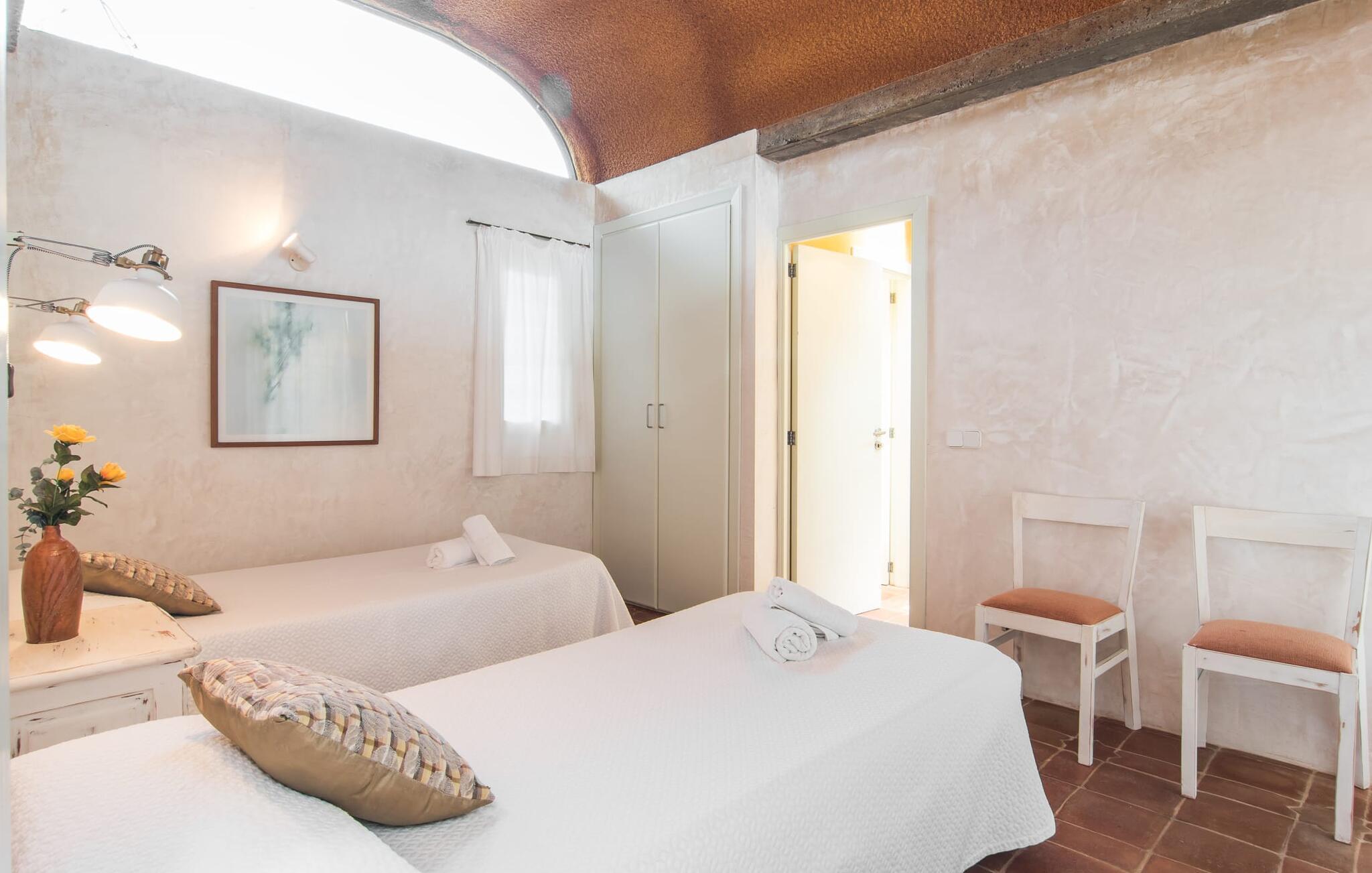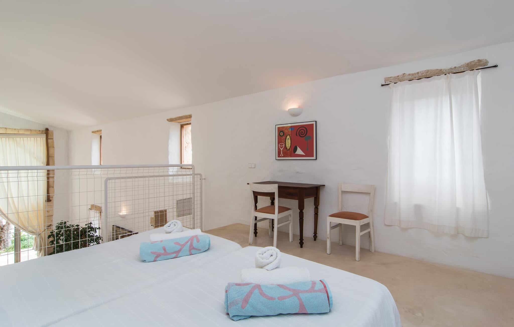 Im Morgen- und Abendsonnenlicht spiegelt sich hier der geschäftige Charakter der Insel wider. Rechts neben dem Wohnzimmer befindet sich ein geräumiges, attraktives Schlafzimmer mit angrenzendem Badezimmer. Eine offene Treppe verbindet das Wohnzimmer mit dem ersten Stock. Hier gibt es einen offenen Bereich mit einem weiteren gemütlichen Schlafzimmer und Badezimmer. Zurück im Wohnzimmer gelangt man in den modernen Anbau, in dem sich die Küche und zwei weitere Schlafzimmer mit jeweils zwei Betten und einem weiteren Badezimmer befinden. Die vier Doppelzimmer sind alle gemütlich eingerichtet und verfügen über einen teilweise offenen Dachbalkon, der eine ganz natürliche Atmosphäre schafft und zum erholsamen Schlaf einlädt. Die drei Badezimmer sind alle gefliest, mit Duschen ausgestattet und in einem funktionalen, aufgeräumten Stil eingerichtet. An kühleren Frühlings- und Herbsttagen spendet die Heizung wohlige Wärme.