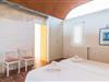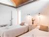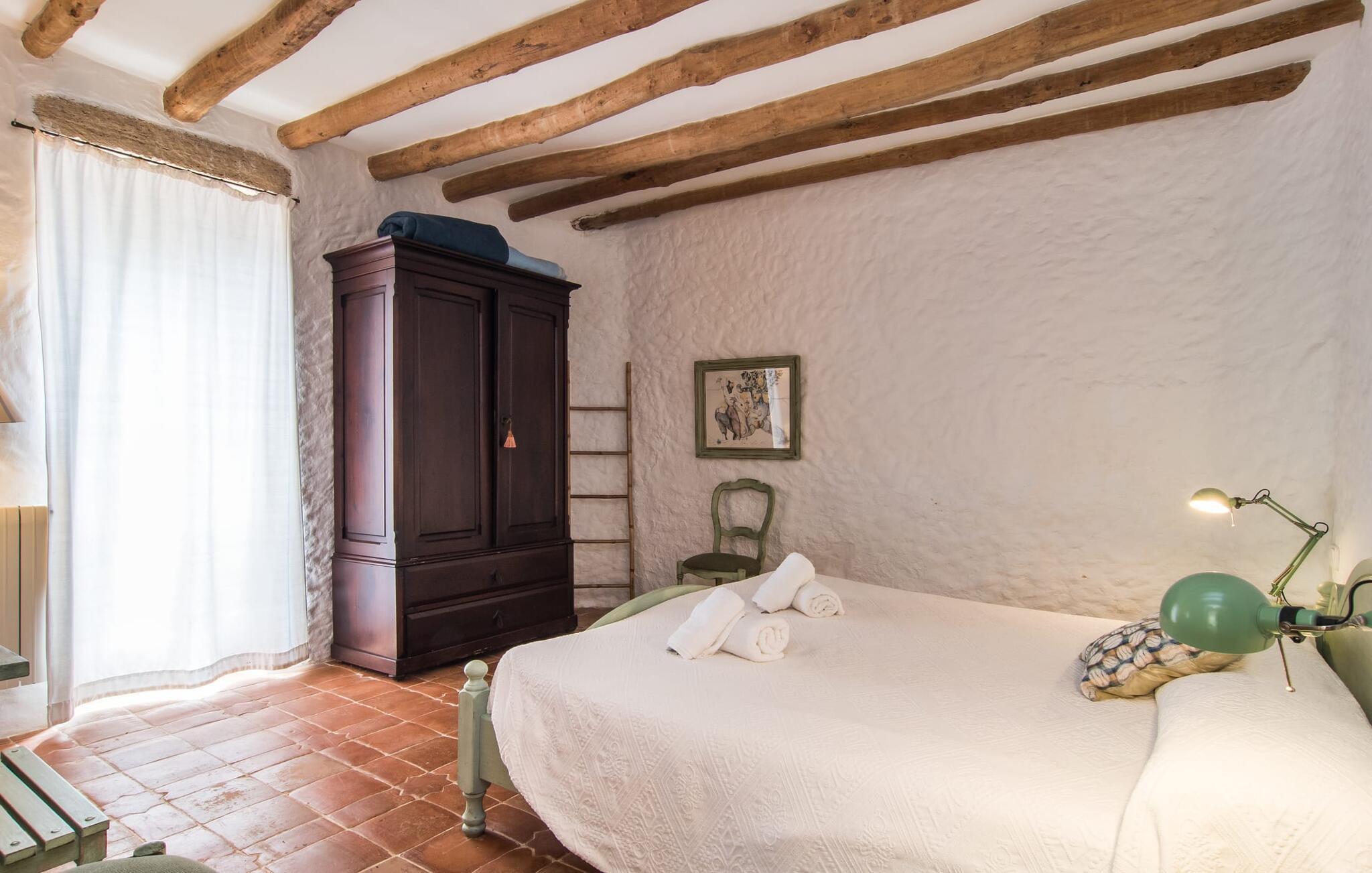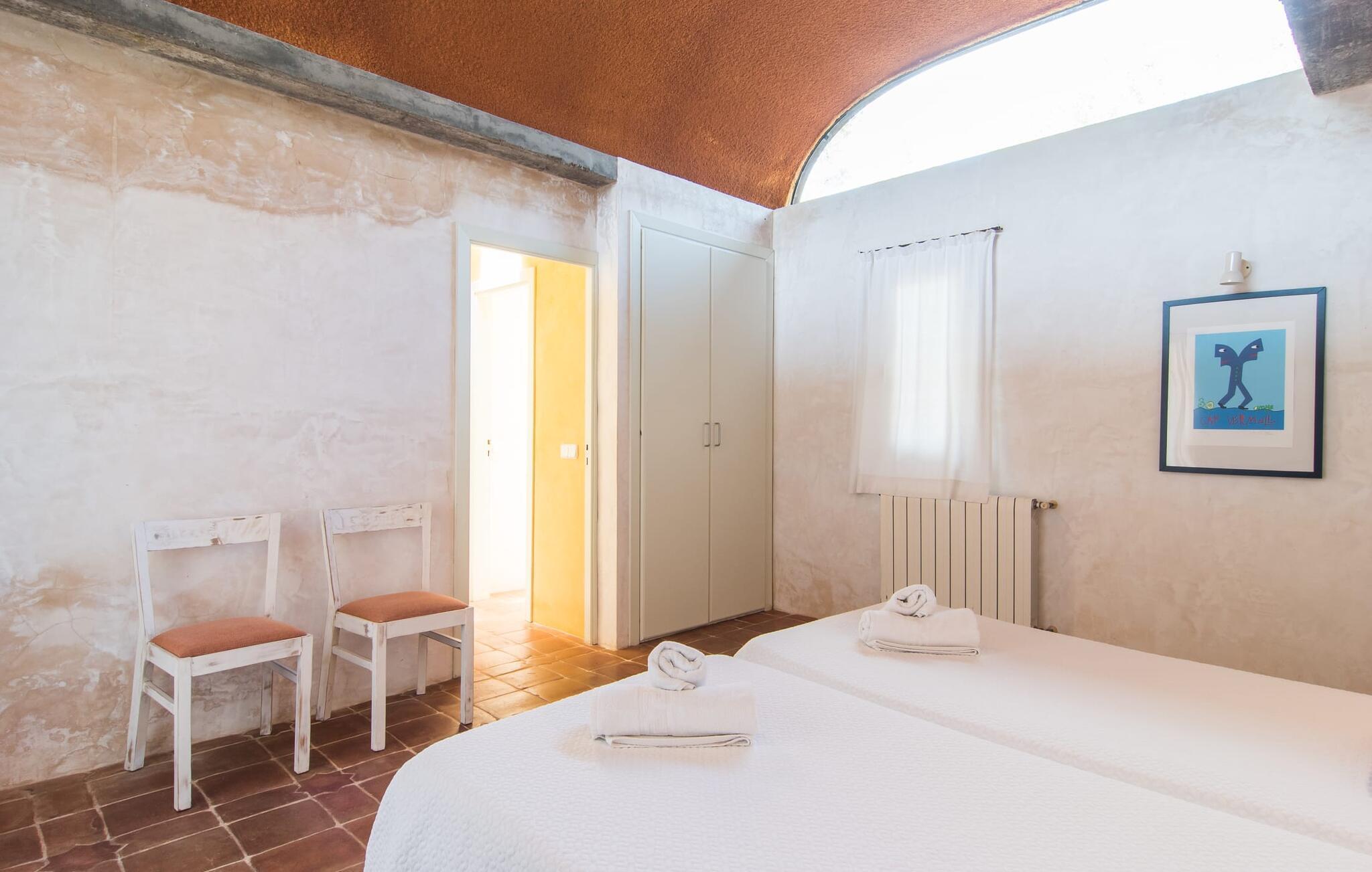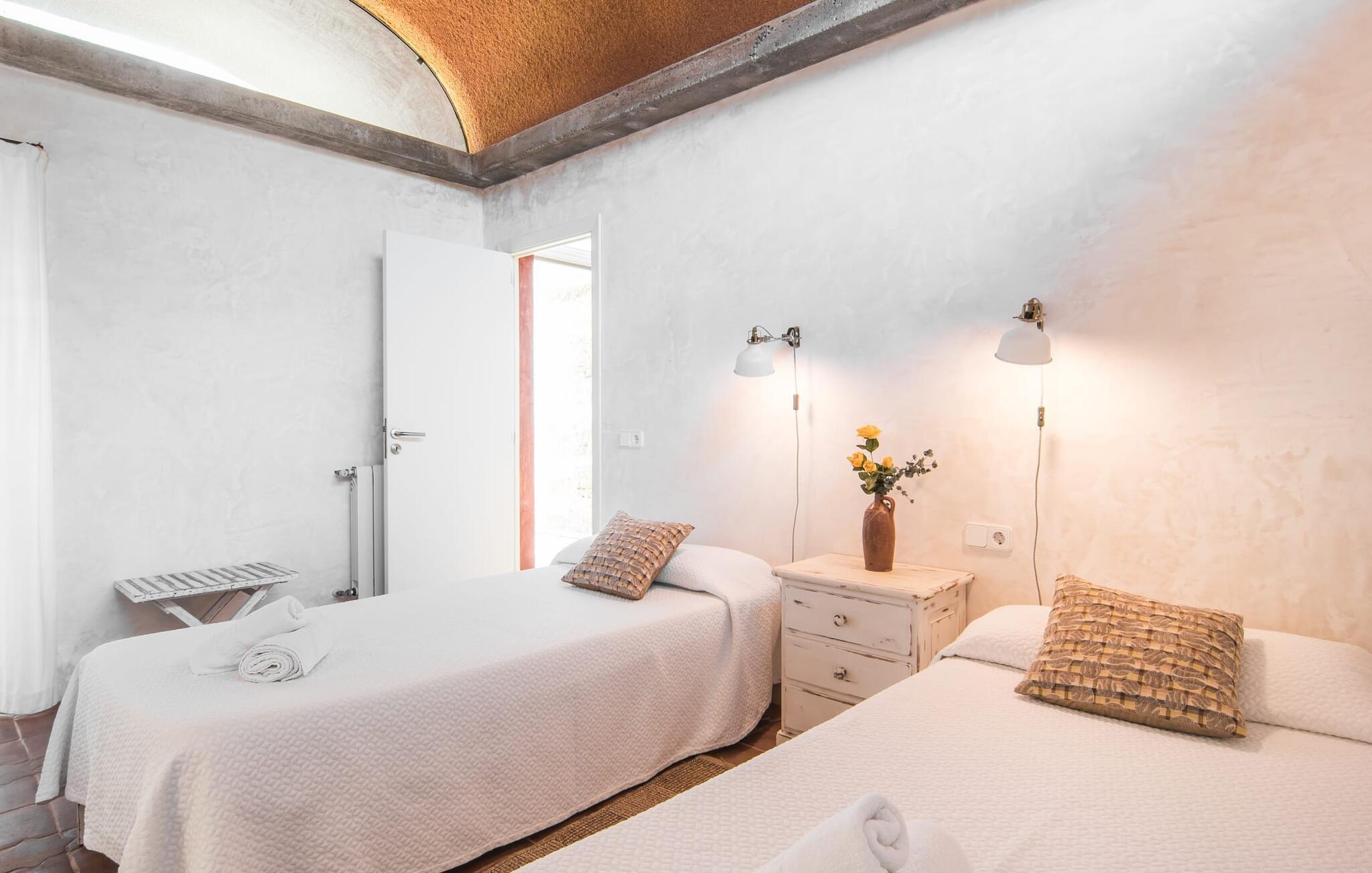 Im Morgen- und Abendsonnenlicht spiegelt sich hier der geschäftige Charakter der Insel wider. Rechts neben dem Wohnzimmer befindet sich ein geräumiges, attraktives Schlafzimmer mit angrenzendem Badezimmer. Eine offene Treppe verbindet das Wohnzimmer mit dem ersten Stock. Hier gibt es einen offenen Bereich mit einem weiteren gemütlichen Schlafzimmer und Badezimmer. Zurück im Wohnzimmer gelangt man in den modernen Anbau, in dem sich die Küche und zwei weitere Schlafzimmer mit jeweils zwei Betten und einem weiteren Badezimmer befinden. Die vier Doppelzimmer sind alle gemütlich eingerichtet und verfügen über einen teilweise offenen Dachbalkon, der eine ganz natürliche Atmosphäre schafft und zum erholsamen Schlaf einlädt. Die drei Badezimmer sind alle gefliest, mit Duschen ausgestattet und in einem funktionalen, aufgeräumten Stil eingerichtet. An kühleren Frühlings- und Herbsttagen spendet die Heizung wohlige Wärme.