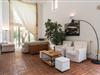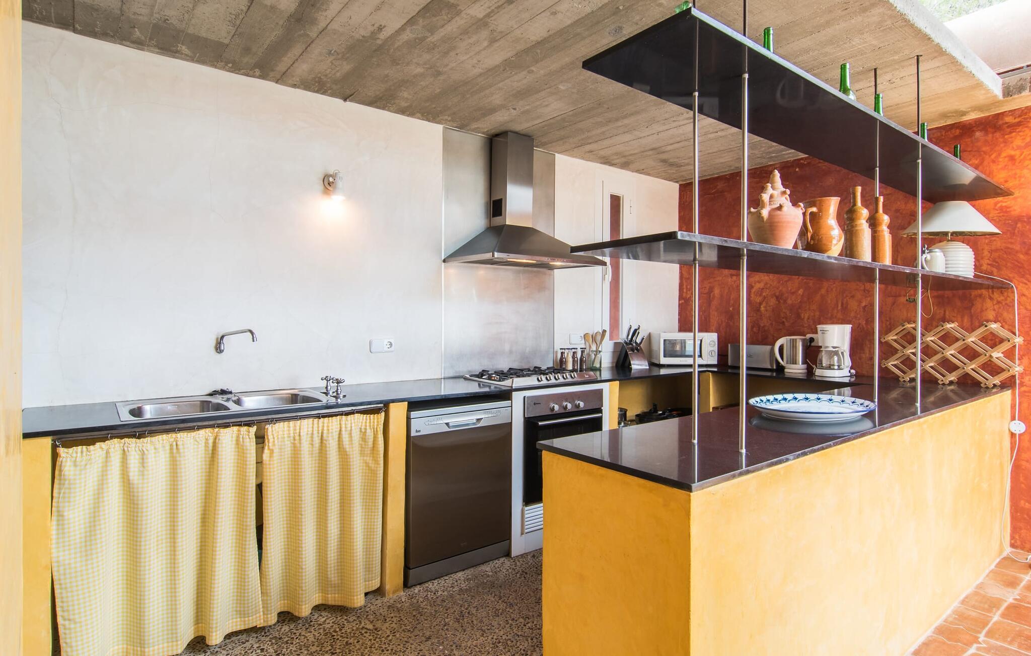Betritt man die Villa von der Terrasse aus durch den großen Torbogen, empfängt man das große, helle Wohnzimmer mit seiner geschmackvollen und wohnlichen Einrichtung, ein hübscher Raum zum Verweilen. Der Einrichtungsstil ist sehr hell und das Design minimalistisch. Erwähnenswert sind die großen Fenster und die breiten Glasterrassentüren, durch die viel Licht und Atmosphäre in die Villa strömen. Helle bodenlange Vorhänge bringen Gemütlichkeit in diesen wunderbaren Raum. Der Raum verfügt außerdem über eine hohe Decke, die das großzügige Raumgefühl unterstreicht. Die Böden in fast allen Räumen sind mit erdfarbenen Fliesen ausgelegt. Zusammen mit den großen, gut positionierten Pflanzen sorgt dies für eine durchgehend mediterrane Atmosphäre. Die sehr interessant gestaltete offene Küche, komplett ausgestattet mit moderner Technik, lässt keine Wünsche offen. Hier treffen zwei moderne Baustile aufeinander – der traditionelle und der moderne – und ergeben ein besonders ansprechendes und farbenfrohes Ergebnis. Wie lecker ist der erste Morgenkaffee aus der Kaffeemaschine!