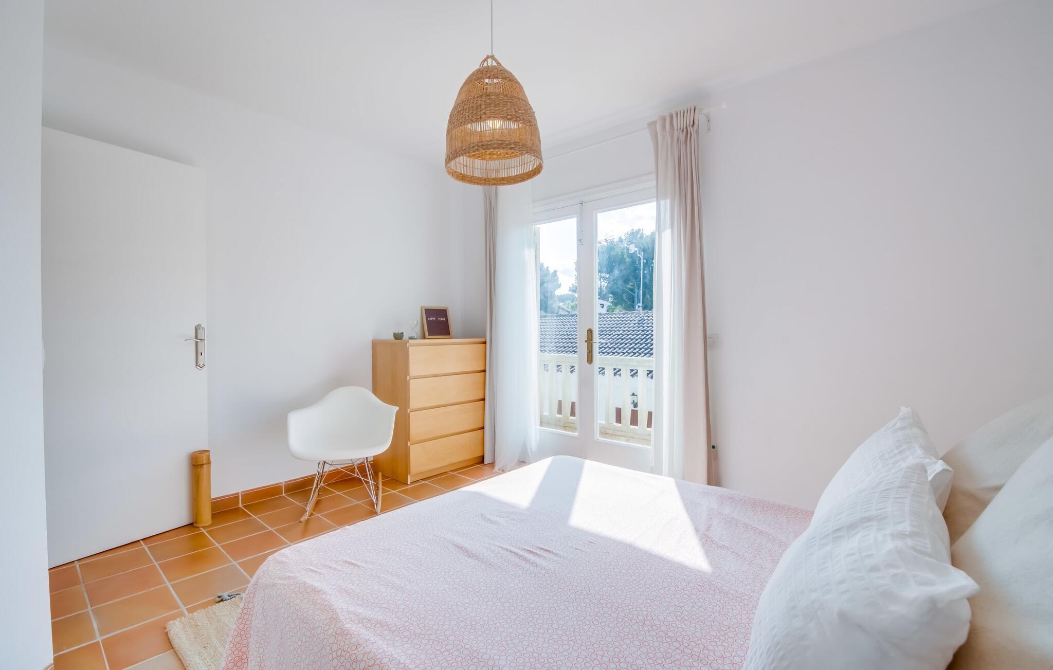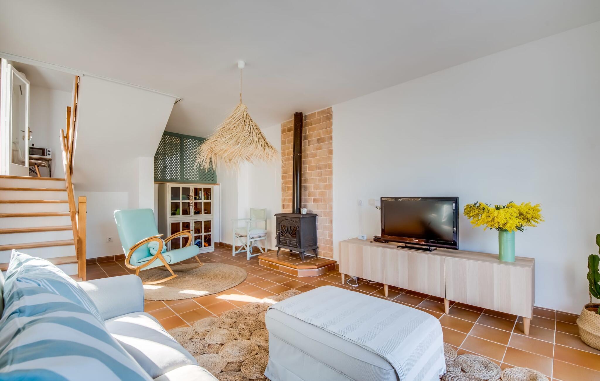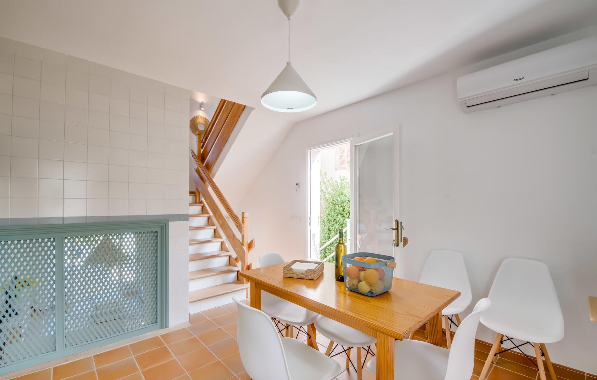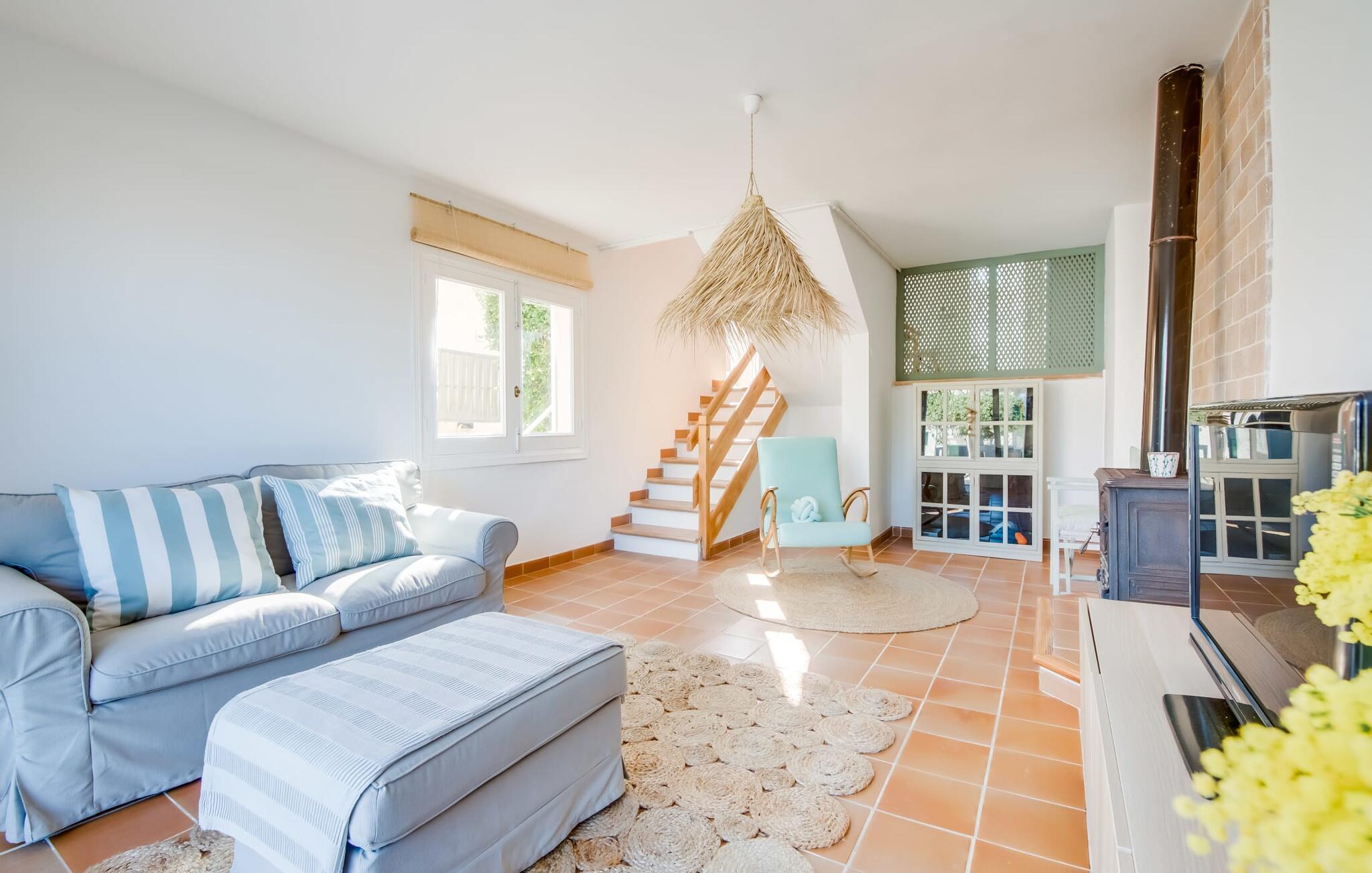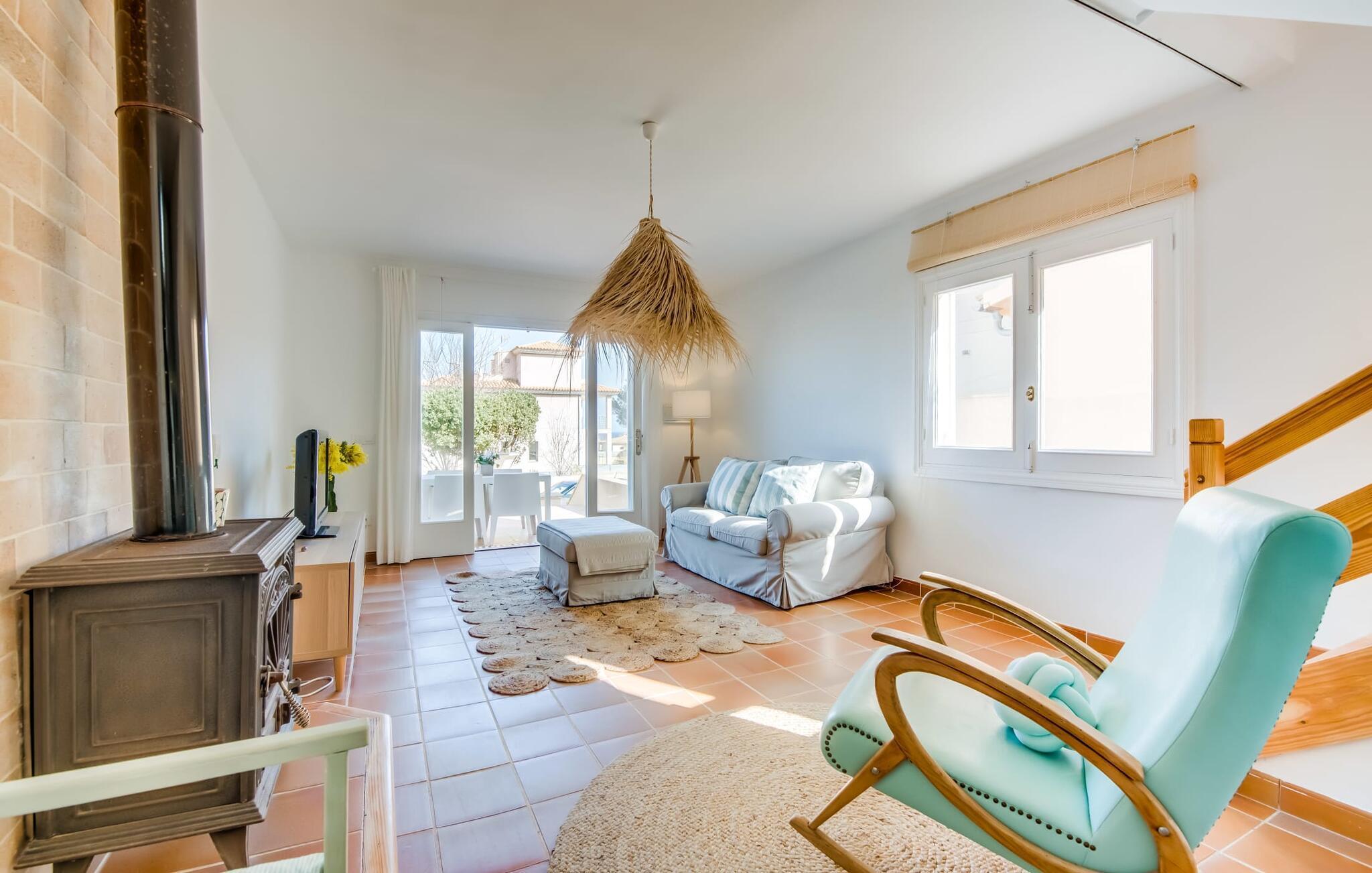 Ein raumhohes Fenster zur Terrasse lässt viel Licht ins Haus und erleichtert den Wechsel zwischen Wohnen im Freien und im Innenbereich. Auch eine freundliche, trendige Einrichtung mit einem charmanten maritimen Touch macht den Aufenthalt drinnen äußerst attraktiv – auf dem Sofa lässt es sich beispielsweise gut vor dem Fernseher gemütlich machen. An kühlen Abenden zaubert ein Holzofen wohlige Wärme. Der gleichzeitige Meerblick, den Sie durch einige Fenster genießen, und die sanfte Meeresbrise, die durch die Räume weht, schaffen eine ganz besondere Atmosphäre. Dies wird durch die verschiedenen Ebenen, zwischen denen Sie sich in dieser Mallorca-Villa bewegen können, wirkungsvoll ergänzt. Vom Wohnzimmer im Erdgeschoss gelangt man in die großzügige und lichtdurchflutete Küche, die inklusive Esstisch alles für den Selbstversorger-Tag bereithält. Die anderen beiden Etagen beherbergen die drei gemütlichen Schlafzimmer und zwei Badezimmer. Auf jeden Fall ein sehr attraktives Haus für Meeresliebhaber und Urlauber, die gerne zentral wohnen!
