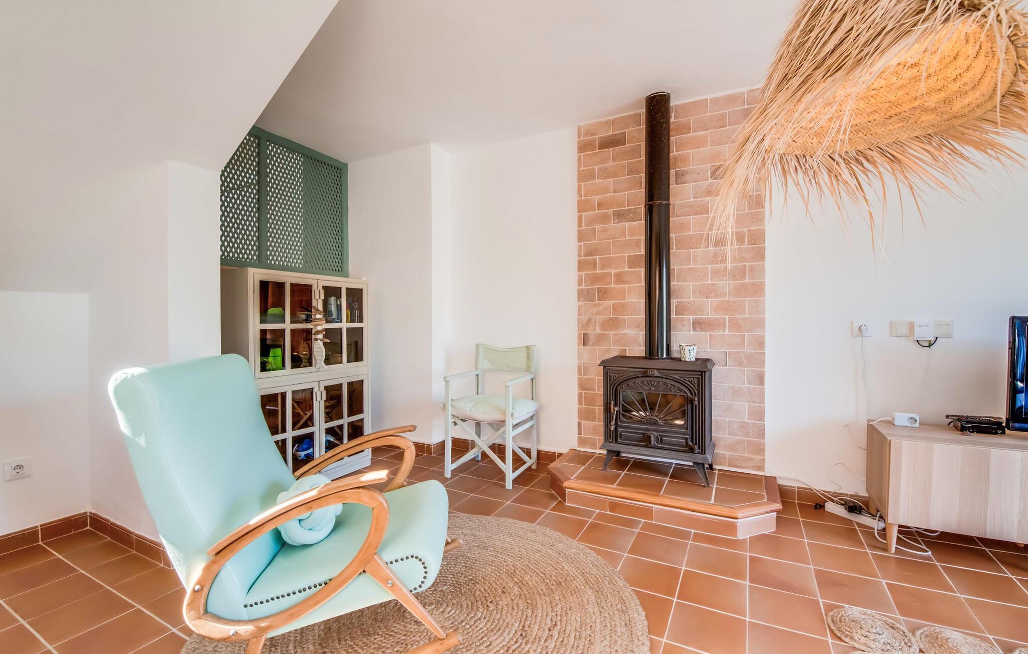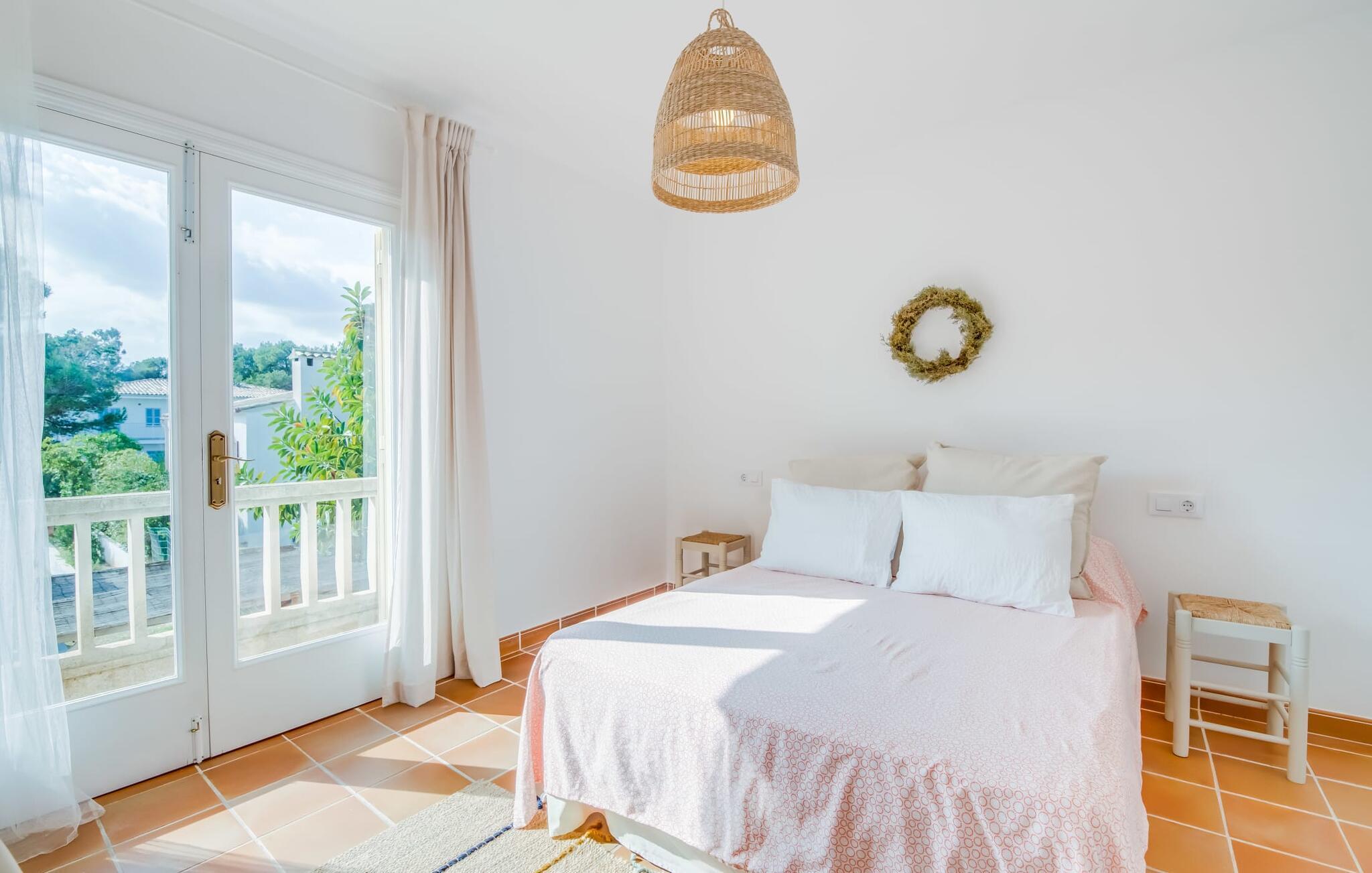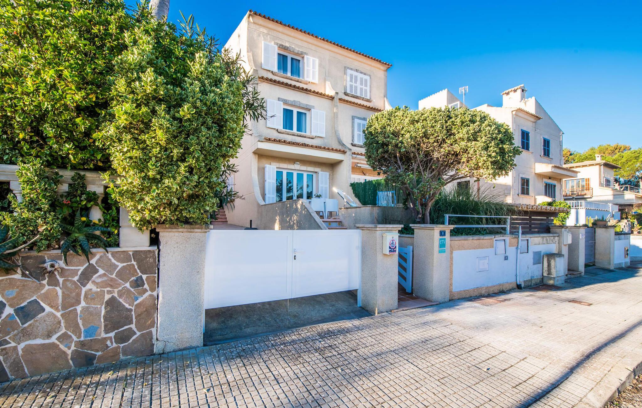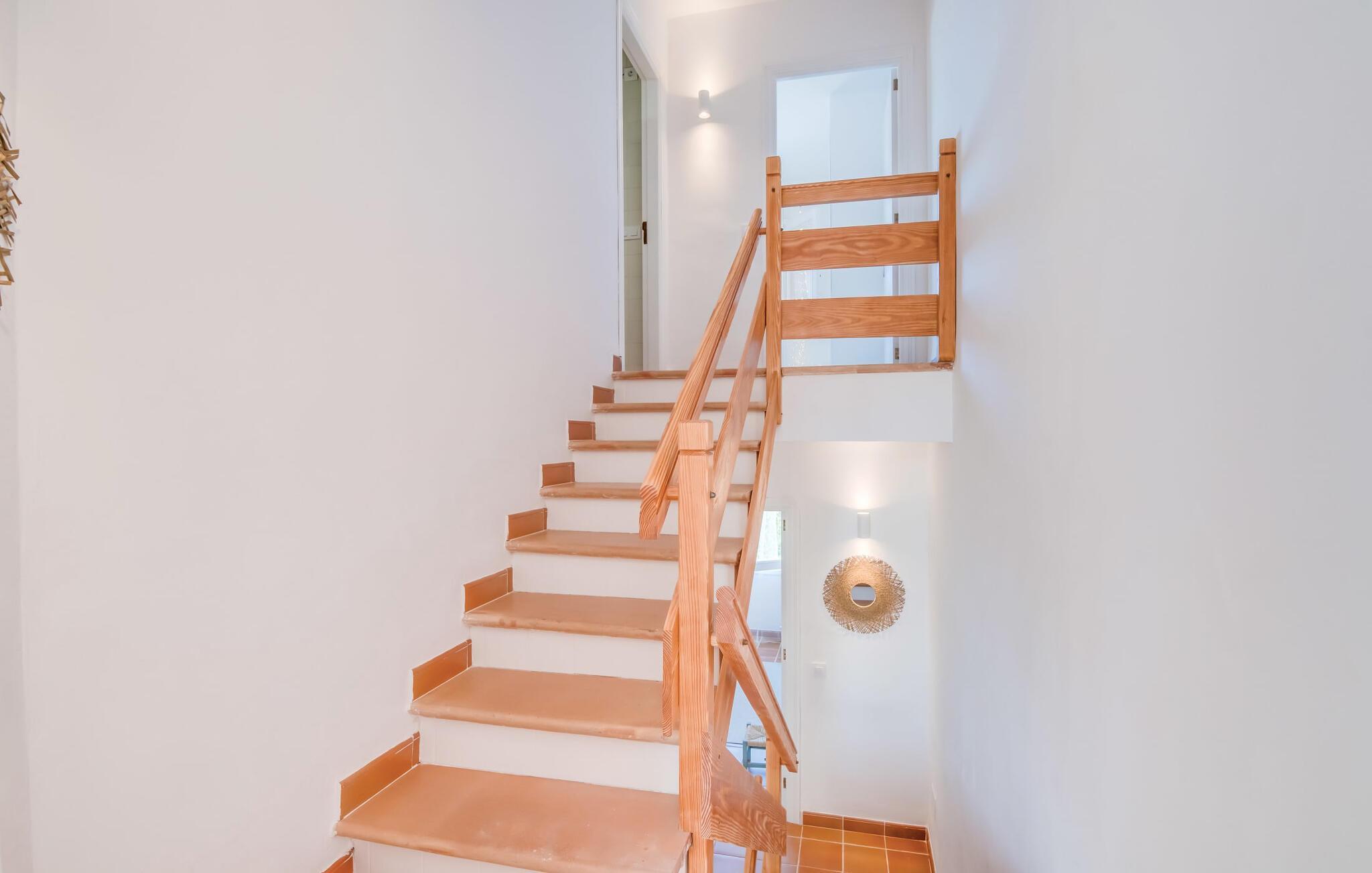 Ein raumhohes Fenster zur Terrasse lässt viel Licht ins Haus und erleichtert den Wechsel zwischen Wohnen im Freien und im Innenbereich. Auch eine freundliche, trendige Einrichtung mit einem charmanten maritimen Touch macht den Aufenthalt drinnen äußerst attraktiv – auf dem Sofa lässt es sich beispielsweise gut vor dem Fernseher gemütlich machen. An kühlen Abenden zaubert ein Holzofen wohlige Wärme. Der gleichzeitige Meerblick, den Sie durch einige Fenster genießen, und die sanfte Meeresbrise, die durch die Räume weht, schaffen eine ganz besondere Atmosphäre. Dies wird durch die verschiedenen Ebenen, zwischen denen Sie sich in dieser Mallorca-Villa bewegen können, wirkungsvoll ergänzt. Vom Wohnzimmer im Erdgeschoss gelangt man in die großzügige und lichtdurchflutete Küche, die inklusive Esstisch alles für den Selbstversorger-Tag bereithält. Die anderen beiden Etagen beherbergen die drei gemütlichen Schlafzimmer und zwei Badezimmer. Auf jeden Fall ein sehr attraktives Haus für Meeresliebhaber und Urlauber, die gerne zentral wohnen!