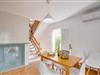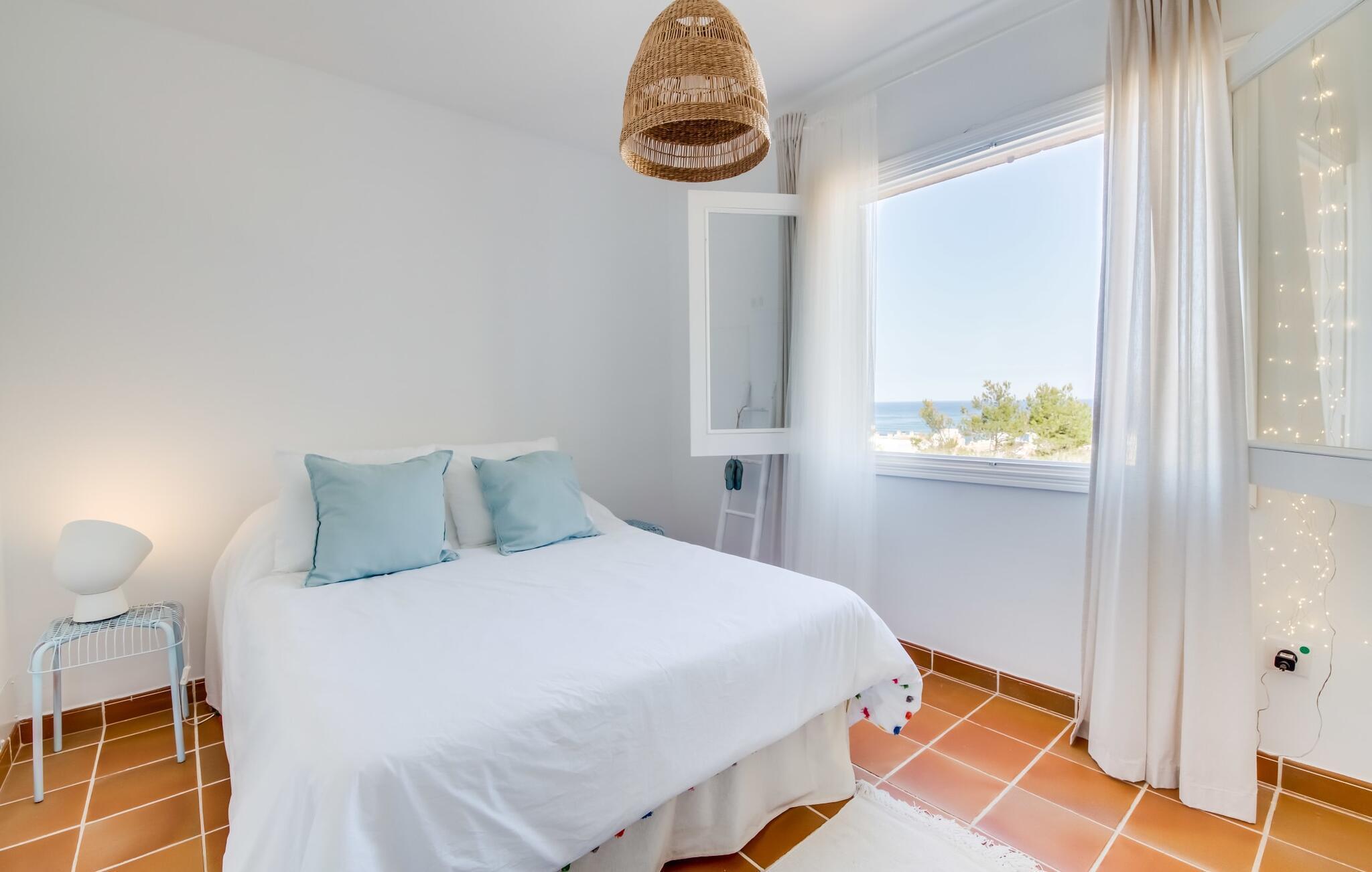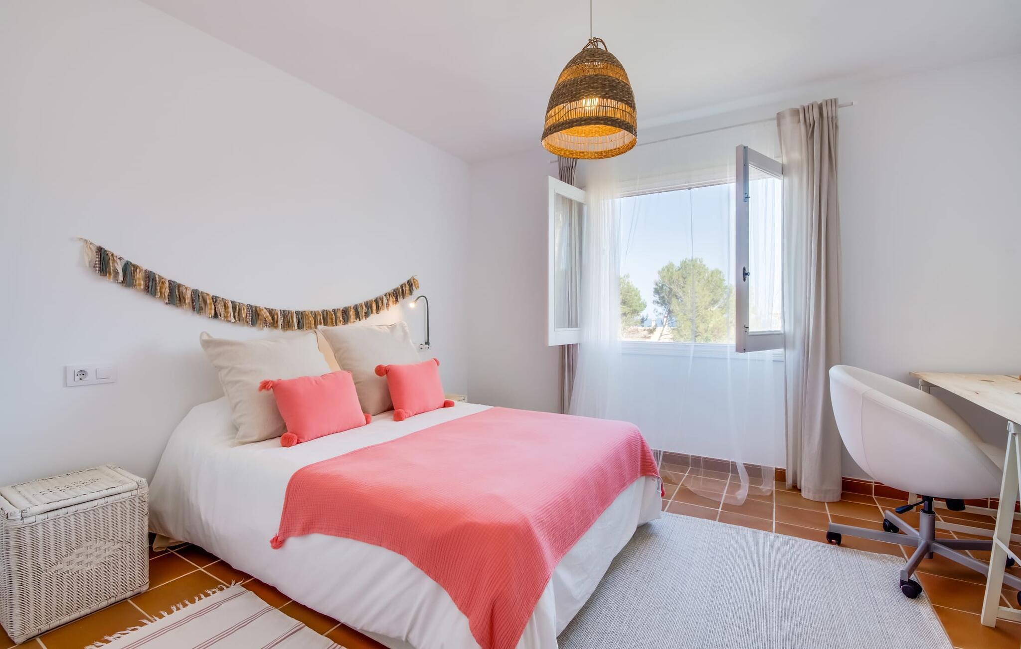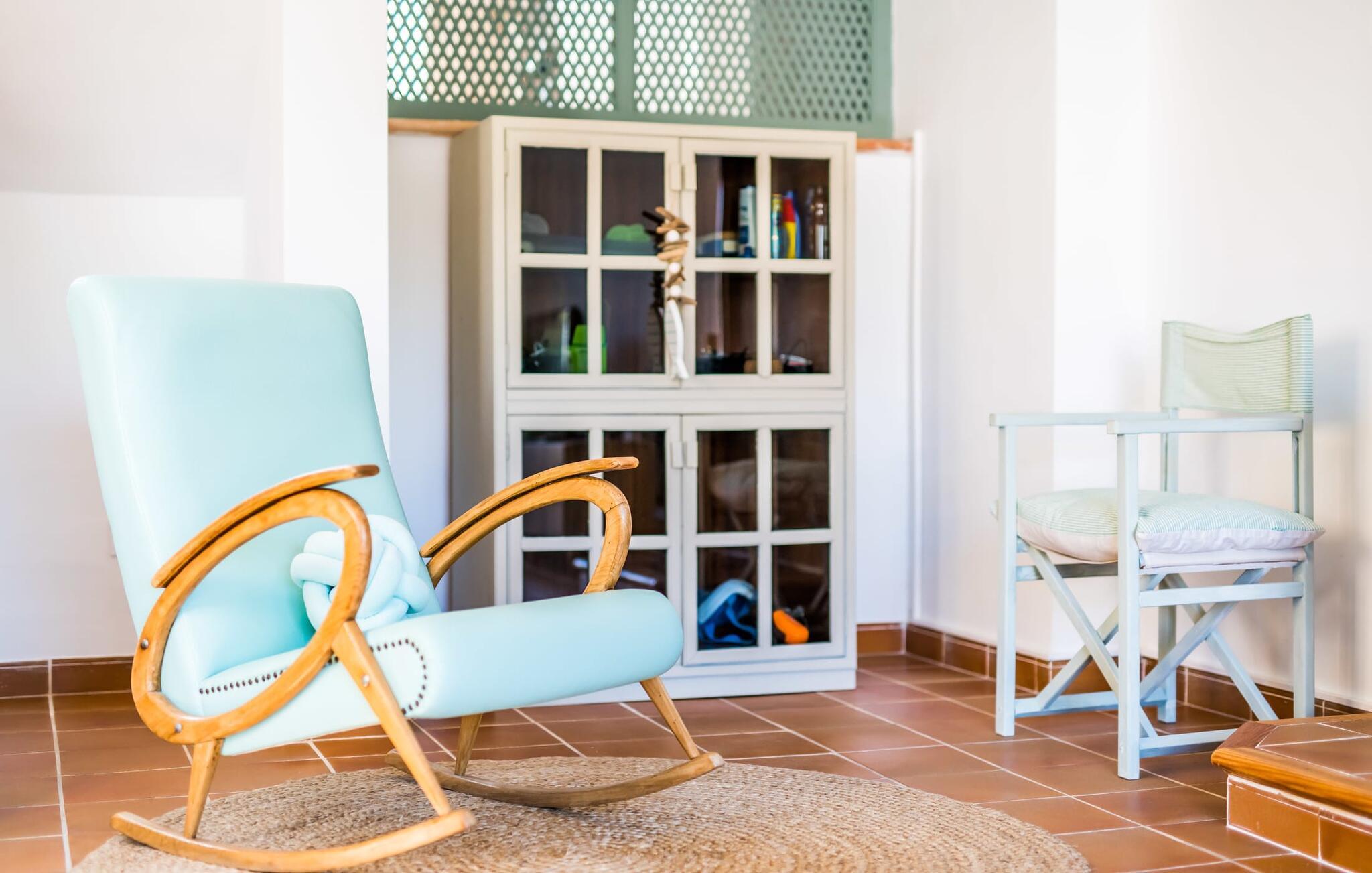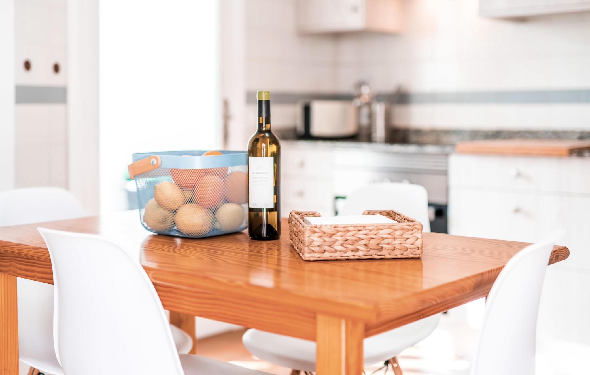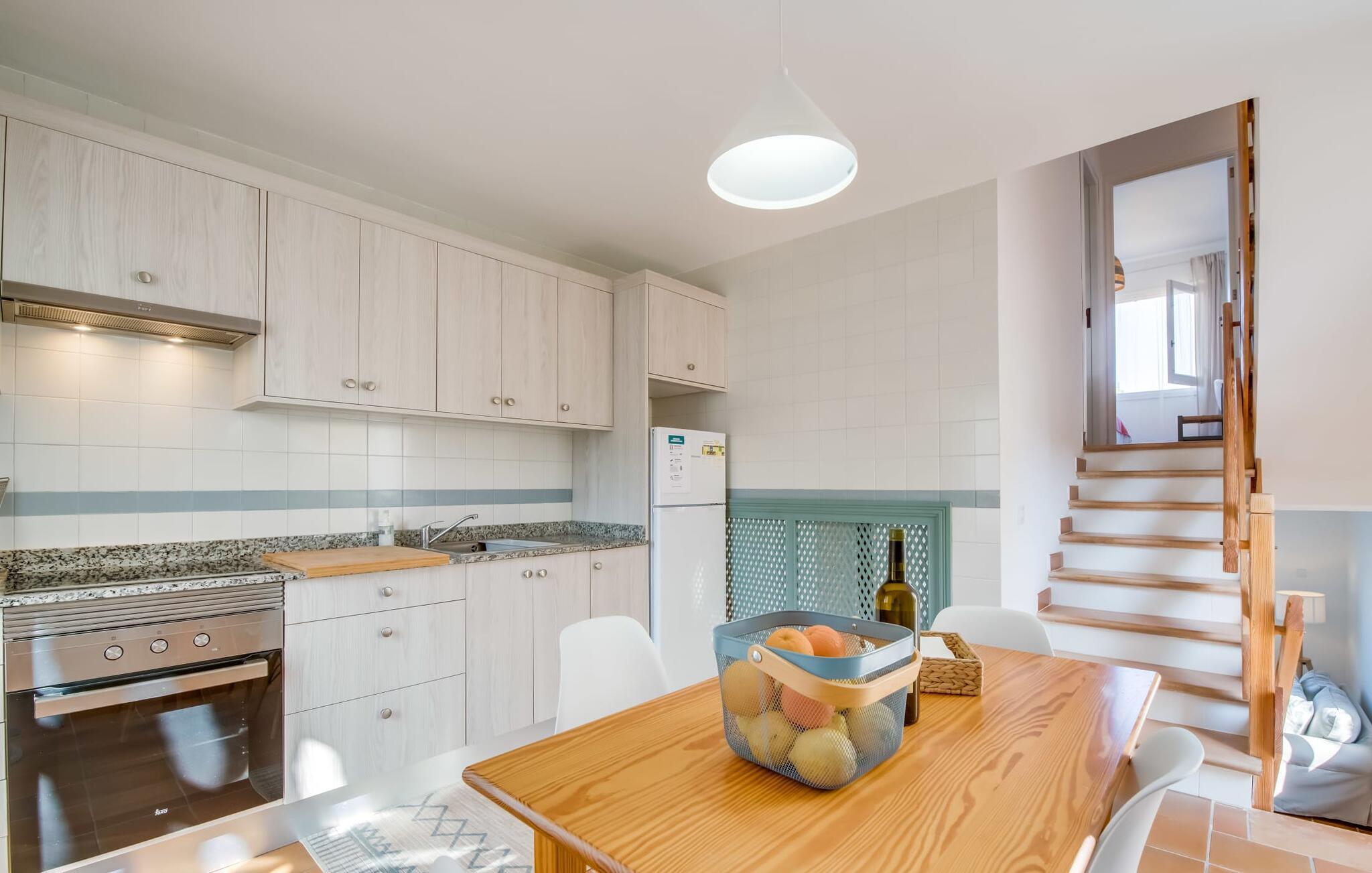 Ein raumhohes Fenster zur Terrasse lässt viel Licht ins Haus und erleichtert den Wechsel zwischen Wohnen im Freien und im Innenbereich. Auch eine freundliche, trendige Einrichtung mit einem charmanten maritimen Touch macht den Aufenthalt drinnen äußerst attraktiv – auf dem Sofa lässt es sich beispielsweise gut vor dem Fernseher gemütlich machen. An kühlen Abenden zaubert ein Holzofen wohlige Wärme. Der gleichzeitige Meerblick, den Sie durch einige Fenster genießen, und die sanfte Meeresbrise, die durch die Räume weht, schaffen eine ganz besondere Atmosphäre. Dies wird durch die verschiedenen Ebenen, zwischen denen Sie sich in dieser Mallorca-Villa bewegen können, wirkungsvoll ergänzt. Vom Wohnzimmer im Erdgeschoss gelangt man in die großzügige und lichtdurchflutete Küche, die inklusive Esstisch alles für den Selbstversorger-Tag bereithält. Die anderen beiden Etagen beherbergen die drei gemütlichen Schlafzimmer und zwei Badezimmer. Auf jeden Fall ein sehr attraktives Haus für Meeresliebhaber und Urlauber, die gerne zentral wohnen!