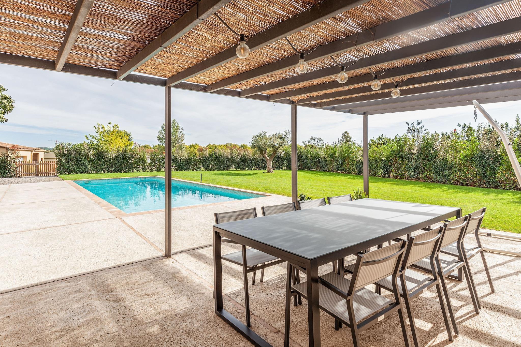 Parterre: (Eingang, Wohnzimmer(TV(Flatscreen), Esstisch, Sitzecke, Heizung, Klimaanlage), Küche(Esstisch, Kochplatte, Wasserkocher, Toaster, Dunstabzugshaube, Kaffeemaschine(cups), Backofen, Mikrowelle, Spülmaschine, Kühl-/Gefrierkombination), Schlafzimmer(Doppelbett(180 x 200 cm), Babybett, Heizung, Klimaanlage), Schlafzimmer(Einzelunterschiebebett(80 x 190 cm), Einzelunterschiebebett(80 x 190 cm), Heizung, Klimaanlage), Badezimmer(Dusche, Waschbecken, Toilette), Badezimmer(Dusche, Waschbecken, Toilette, Waschmaschine)) Badezimmer(von außen erreichbar)(Dusche, Waschbecken, Toilette), Carport, Garten(alleinige Nutzung, umzäunt, illuminiert), Gartenmöbel, Parkplatz, Liegestühle, Liegestühle, Liegestühle, Liegestühle, Pool(Gemeinschaftliche Nutzung mit dem Eigentümer, im Garten, geöffnet von Jan bis einschließlich Dez), Bügelbrett, Bügeleisen
