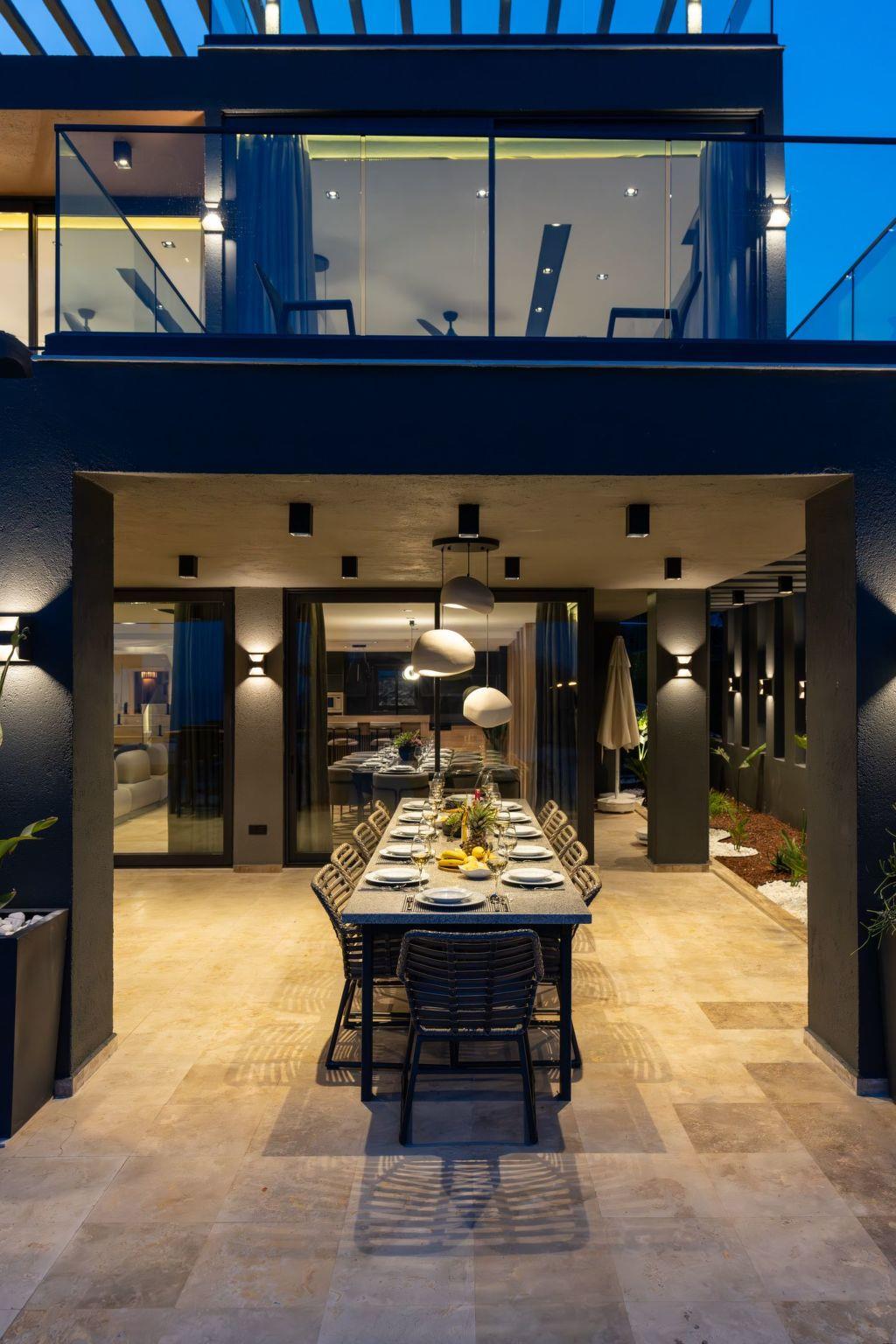 Außenbereich und Terrasse: Der Außenbereich der Villa ist ebenso beeindruckend wie das Innere. Entspannen Sie auf der weitläufigen Terrasse, nehmen Sie ein Sonnenbad auf den bequemen Liegestühlen oder genießen Sie eine Mahlzeit im Freien an der eleganten Essgruppe.