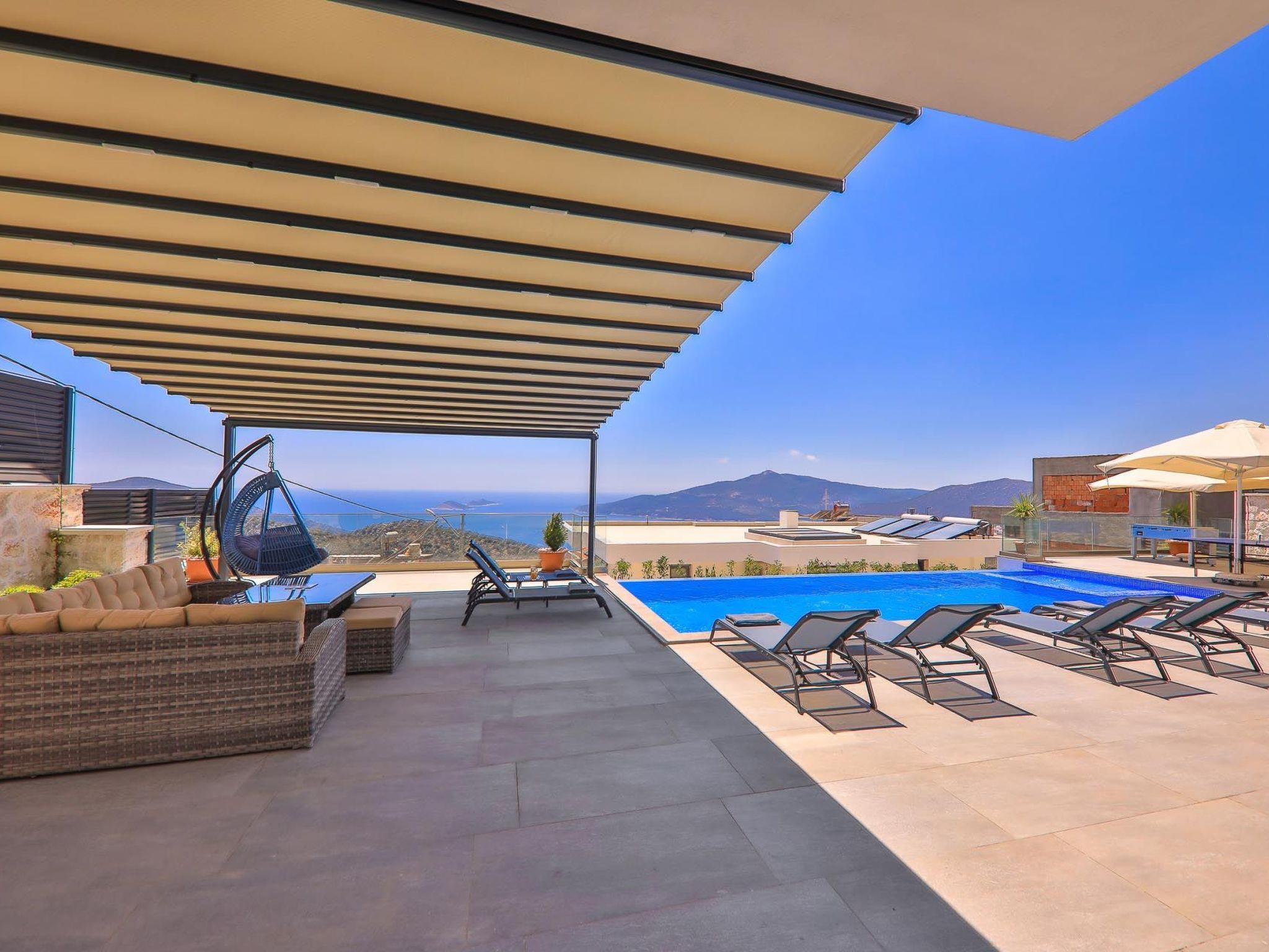 Außenbereich der Villa Fiona lädt mit seiner exklusiven Terrasse und dem eigenen Balkon zu sonnenverwöhnten Stunden ein, während der private Pool eine willkommene Abkühlung an heißen Tagen bietet. Dieser Außenbereich ist der perfekte Ort, um in völliger Privatsphäre zu entspannen, die frische Luft zu genießen und den Alltagsstress hinter sich zu lassen.