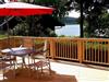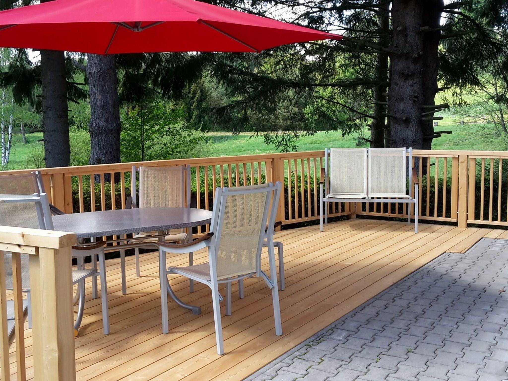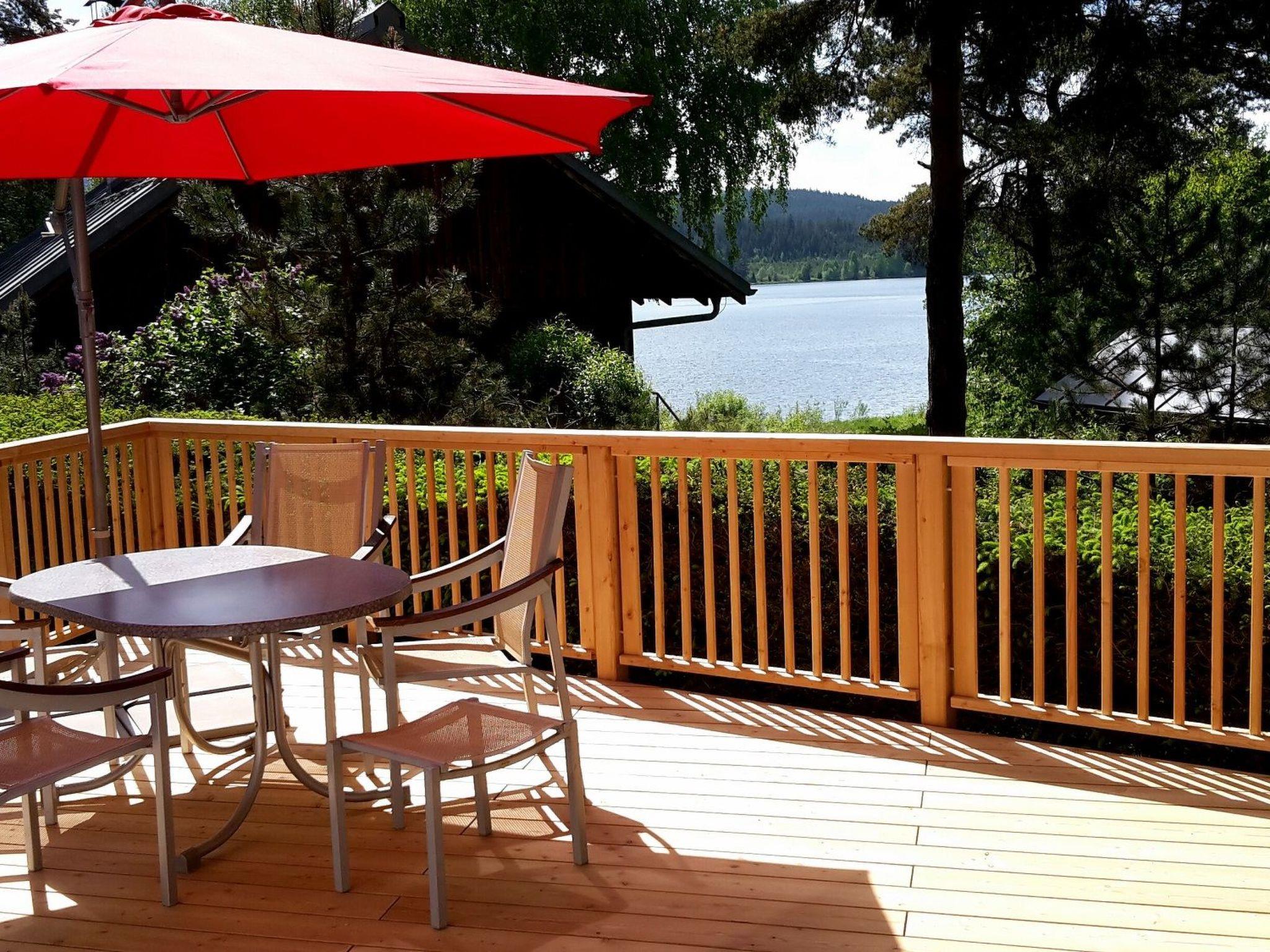 2018 wurde seeseitig eine 22 m² große Holzterrasse samt Geländer angebaut, die Ihnen einen tollen Blick auf den See bietet und mit der man diesem nun noch ein Stückchen näher rückt. Auf dieser Fläche sind eine acht teilige Gartengarnitur (vier Sessel, 1x 2-er Bank, Hocker, Tisch & Pendelschirm), sowie eine fünf teilige Mosaik-Sitzgruppe, bestehend aus zwei Sesseln samt Auflagen und ein Tisch, platziert. Auch würde das verbleibende Platzangebot es erlauben, dort zusätzlich noch Liegen, die Ihnen ebenso zur Verfügung gestellt werden, aufzustellen. Des Weiteren befinden sich im Außenbereich eine hölzerne Sitzgarnitur, die aus zwei Bänken samt Auflagen, einem Tisch und Sonnenschirm besteht. Im hinteren Bereich des Hauses gibt es eine offene Feuerstelle mit Grillrost. Rustikale Baumstämme dienen dort als Sitzgelegenheit. Und um den See auch vom Wasser aus zu erkunden, bzw. zur Erweiterung des Freizeit- & Spaßangebotes, gehören ein Ruderboot und ein, auch für Kinder einfach zu fahrendes, Kajak zum Haus. Der gefahrenfreie und sachgemäße Umgang mit dem Boot liegt rein in Ihrer Verantwortung. Bitte beachten Sie weiterhin, dass das Entzünden eines Feuers am Seeufer untersagt ist.