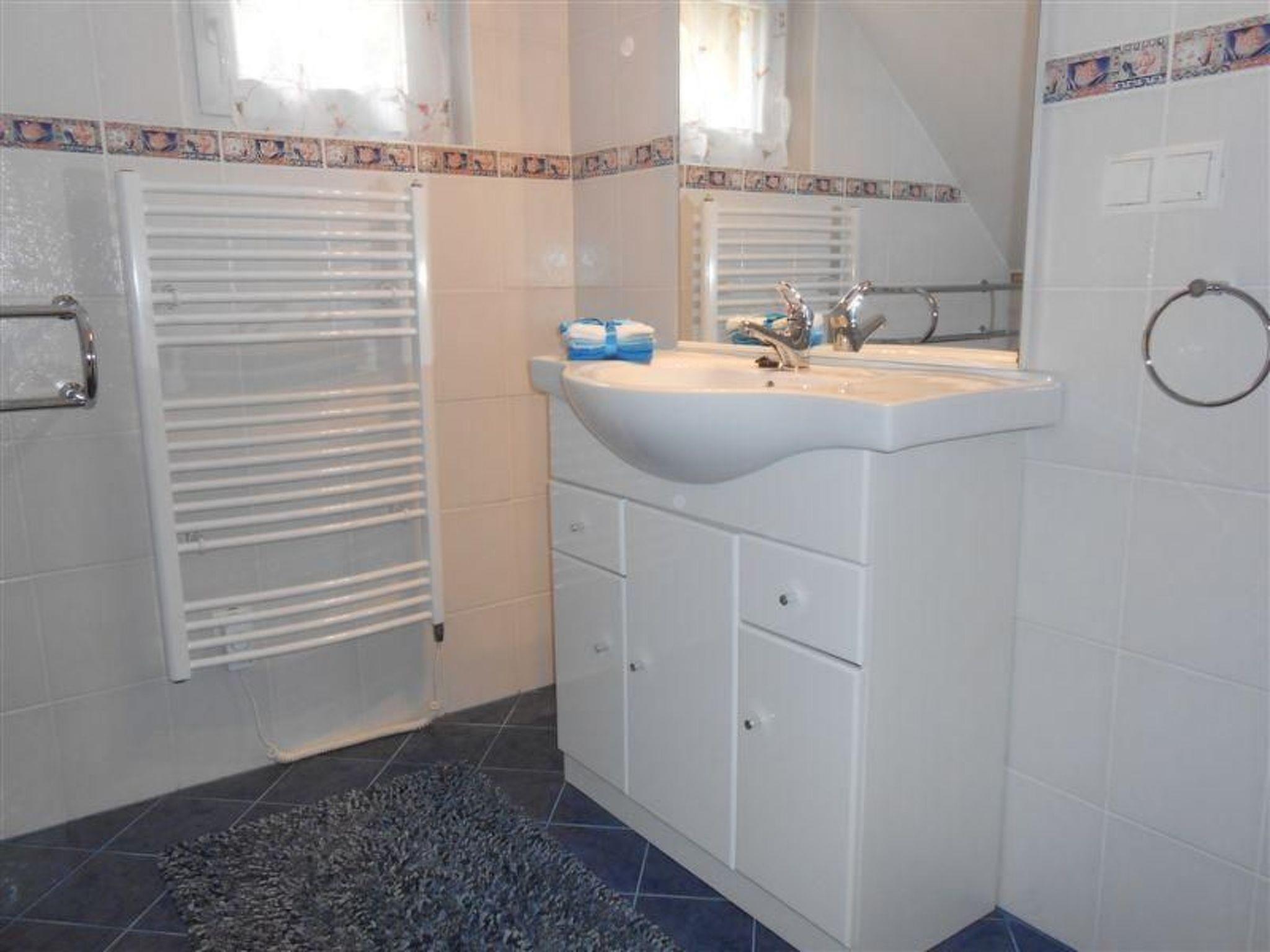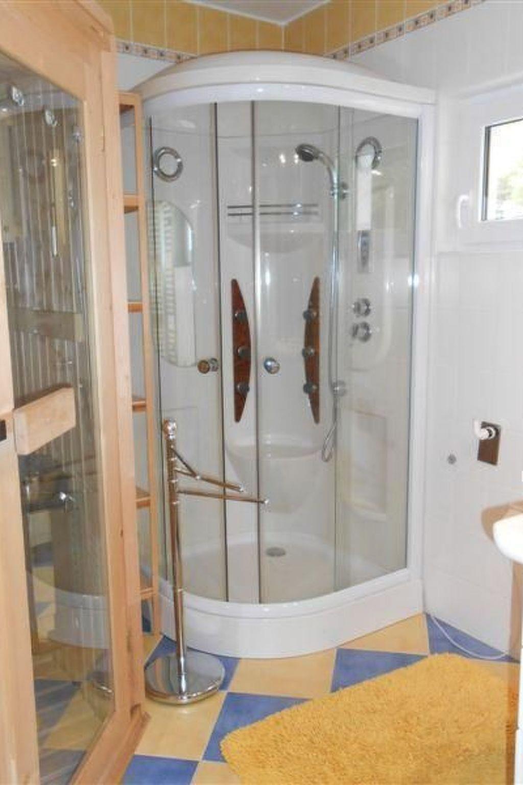 Ein freundlich eingerichtetes Badezimmer, mit komfortabler Duschkabine, Handtuchtrockner, einer kleinen Sauna, ein getrenntes WC und ein kleines Vorzimmer ergänzen die Räume im Erdgeschoss.