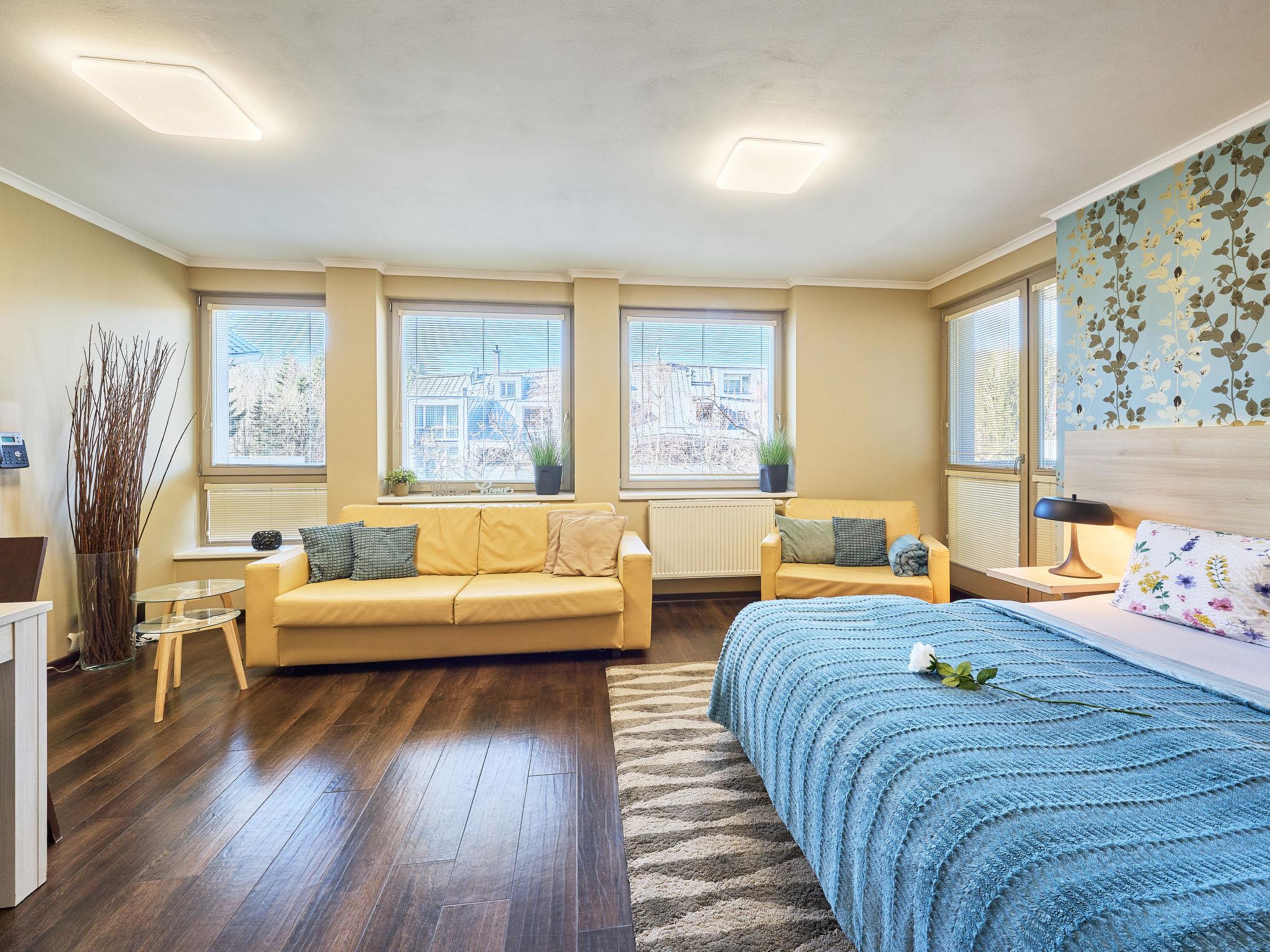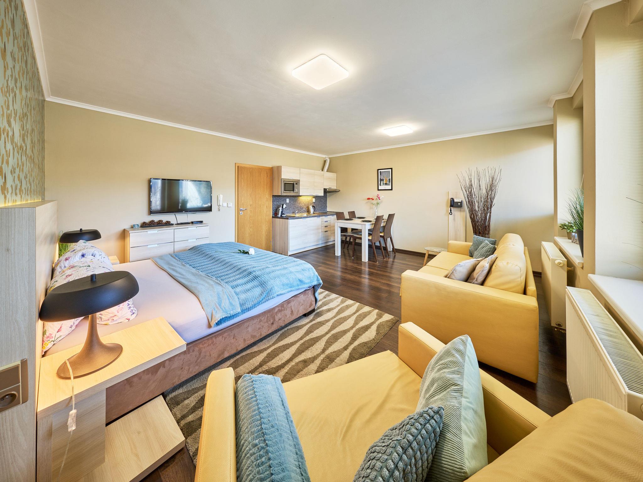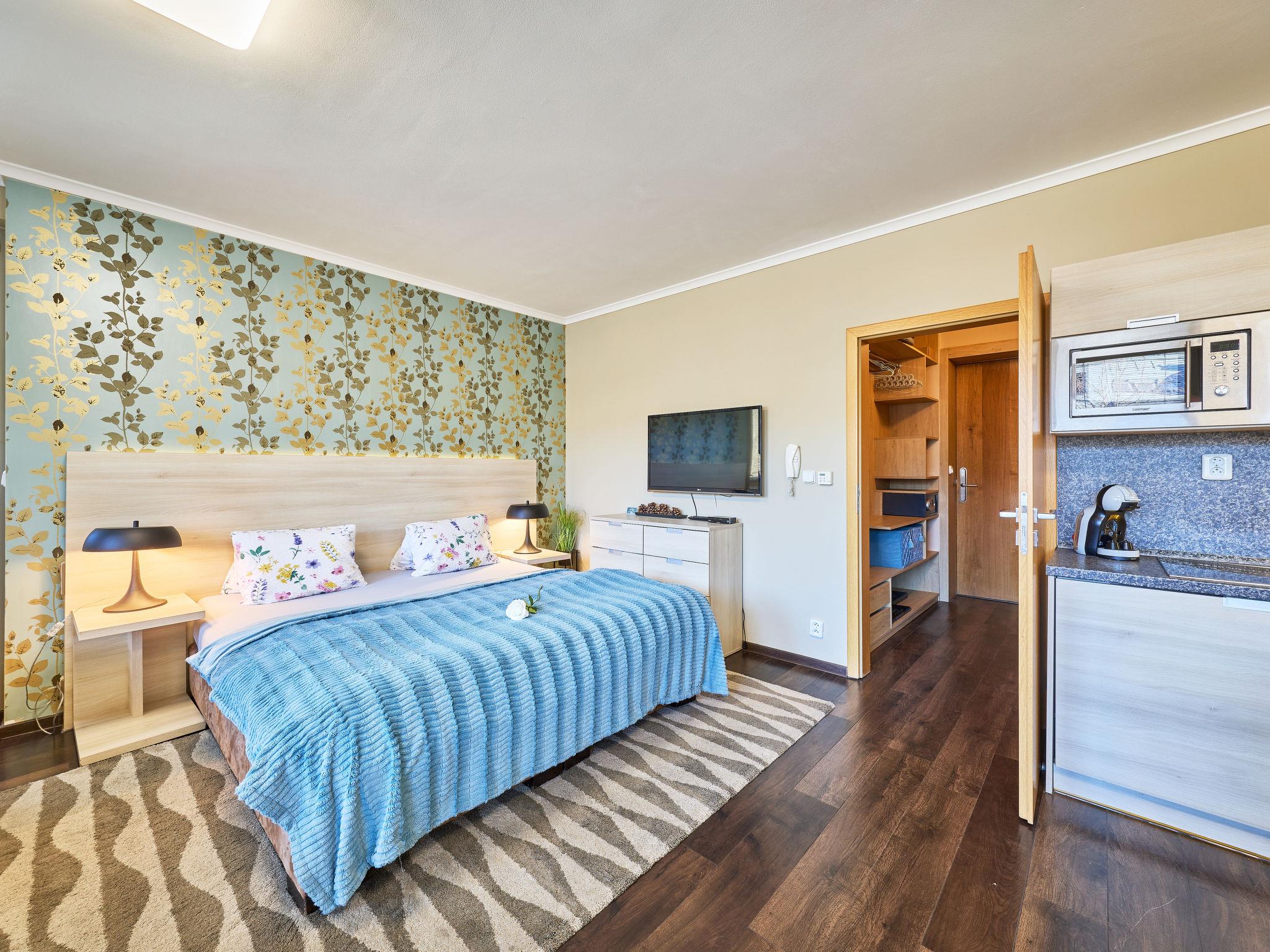 "Harrachov Resident", 1-Zimmer-Studio 40 m2, im Erdgeschoss. Modern und gemütlich eingerichtet: Wohn-/Schlafzimmer mit 1 Doppeldiwanbett, 1 Doppelbett und TV. Kochnische (2 Glaskeramikplatten, Wasserkocher, Mikrowelle, elektrische Kaffeemaschine) mit Esstisch. Bad/WC. Heizung. Grosser Balkon. Balkonmöbel, Abstellkammer. Sicht auf die Skipiste, den Garten und den Wald. Zur Verfügung: Haartrockner. Internet (WLAN, gratis). Parkplatz Nr. 102. Bitte beachten: geeignet für Familien. Nichtraucher-Unterkunft. Rauchmelder.