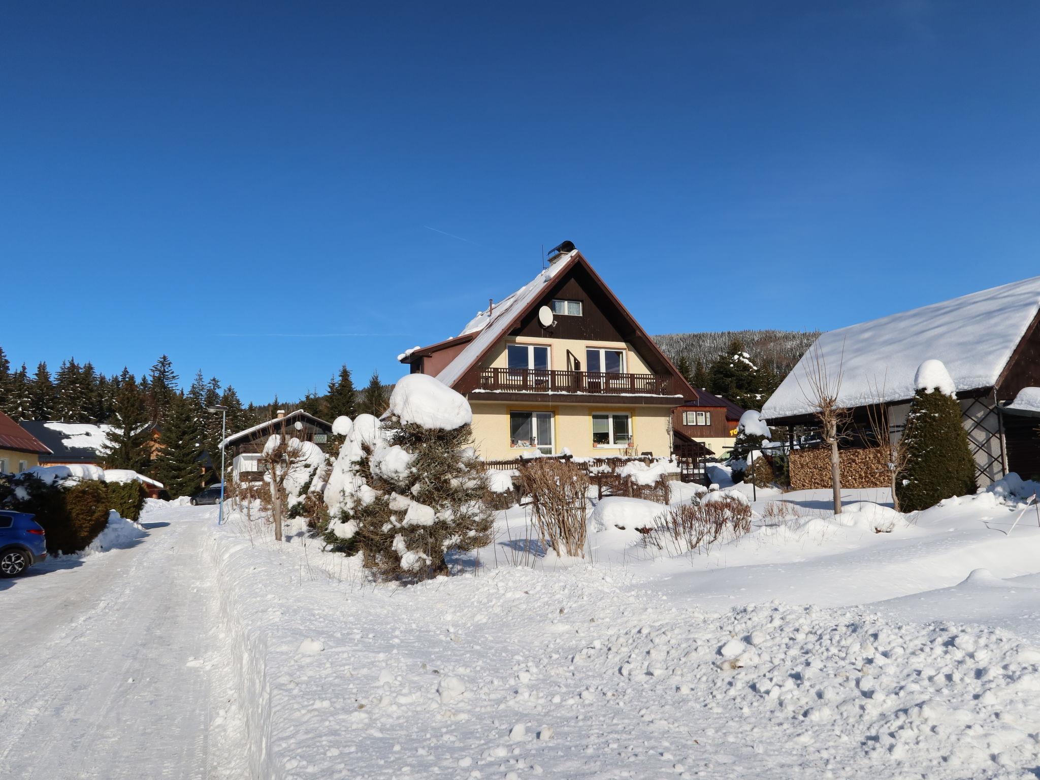 Zweifamilienhaus 700 m.ü.M.. 300 m vom Zentrum von Harrachov, 28 km vom Zentrum von Jablonec nad Nisou, 25 km vom See, 1.5 km vom Skigebiet. Zur Alleinbenutzung: Grundstück 300 m2, Rasen und Bäumen, Schwimmbad (3,6 m Durchmesser, 70 cm tief, saisonale Verfügbarkeit: 01.Jun. - 30.Sep.). Sitzplatz, Gartenmöbel, Grill, Kinderspielplatz (Schaukel, Sandkasten), Parkplatz (für 3 Autos) auf dem Grundstück. Einkaufsgeschäft, Supermarkt 400 m, Restaurant 300 m, Bushaltestelle "Harrachov U Motejlku" 300 m, Bahnstation "Harrachov, Mýtiny" 2 km, Grasstrand 25 km, Freibad 1.5 km, Hallenbad 1.5 km. Golfplatz (18 Loch) 39 km, Tennis 2 km, Tennishalle 3 km, Skilift, Sessellift 1.5 km, Skipisten 300 m, Skischule 1.5 km, Kinderskischule 1.5 km, Langlaufloipe 300 m, Kinderspielplatz 300 m. Nahe gelegene Sehenswürdigkeiten: Mumlava vodopád 2.5 km, Korenov 8 km, Jizerka 15 km, Jablonec nad Nisou 29 km, Liberec, Ješted 40 km, Termy Cieplickie (Pl) 30 km. Bekannte Skigebiete sind gut erreichbar: Harrachov 1.5 km, Príchovice 10 km, Rokytnice nad Jizerou 18 km. Wandergebiete: Western City(Pl) 40 km, Karpacz Wang,Park miniatury Kowary (Pl) 44 km, Giganteria Piechowice 23km, Dinopark(Pl) 15 km. Bitte beachten: Der Besitzer wohnt im selben Haus. Besitzer wohnt in separatem Hausteil.