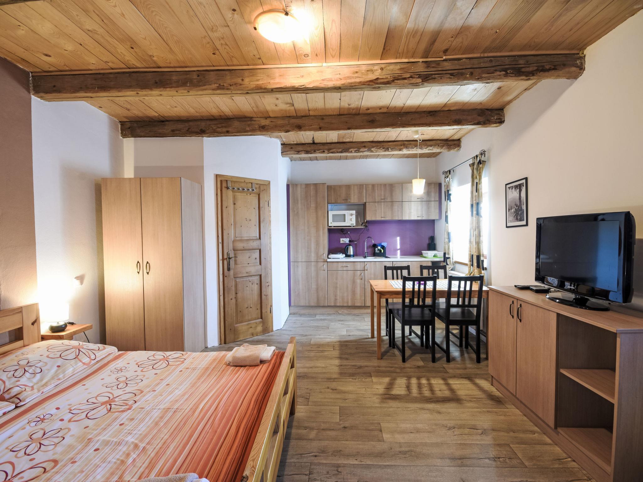 Pernek 3 km von Horní Planá: Grosses Bauernhaus "Pension u Rehoutu", aus dem 18. Jahrhundert. 500 m vom Waldrand, 1.8 km vom See, 500 m vom Bach, im Grünen. Zur Mitbenutzung: schöner, gepflegter Garten (eingezäunt), Aufstellpool (3,5 m Durchmesser, 90 cm tief, saisonale Verfügbarkeit: 01.Jun. - 01.Sep.). Grill, Feuerstelle (Sandkasten), begrünter Innenhof. Im Hause: Aufenthaltsraum, Wireless LAN, Trampolin, Zentralheizung. Frühstück möglich. Abstellraum vorhanden. Parkplatz beim Haus. Supermarkt 4 km, Restaurant 4 km, Fahrradverleih 4 km, Bushaltestelle "Horní Planá, Pernek" 150 m, Hallenbad 22 km, Badesee "Lipno" 1.8 km. Jacht-Hafen 29 km, Minigolf 27 km, Wanderwege ab Haus 10 m, Radweg 100 m, Langlaufloipe 5 km. Nahe gelegene Sehenswürdigkeiten: Stezka korunami stromu, Království lesa, Klášter Zlatá koruna, Rožmberk, Ceský Krumlov (UNESCO). Bekannte Skigebiete sind gut erreichbar: Frymburk, Lipno nad Vltavou 23 km, Hochficht, Sternstein 32 km, Mitterdorf 47 km. Bekannte Seen in der Umgebung sind gut erreichbar: Lipno 1.8 km. Wandergebiete: Národní park Šumava, CHKO Šumava. Bitte beachten: Der Besitzer wohnt im selben Haus.