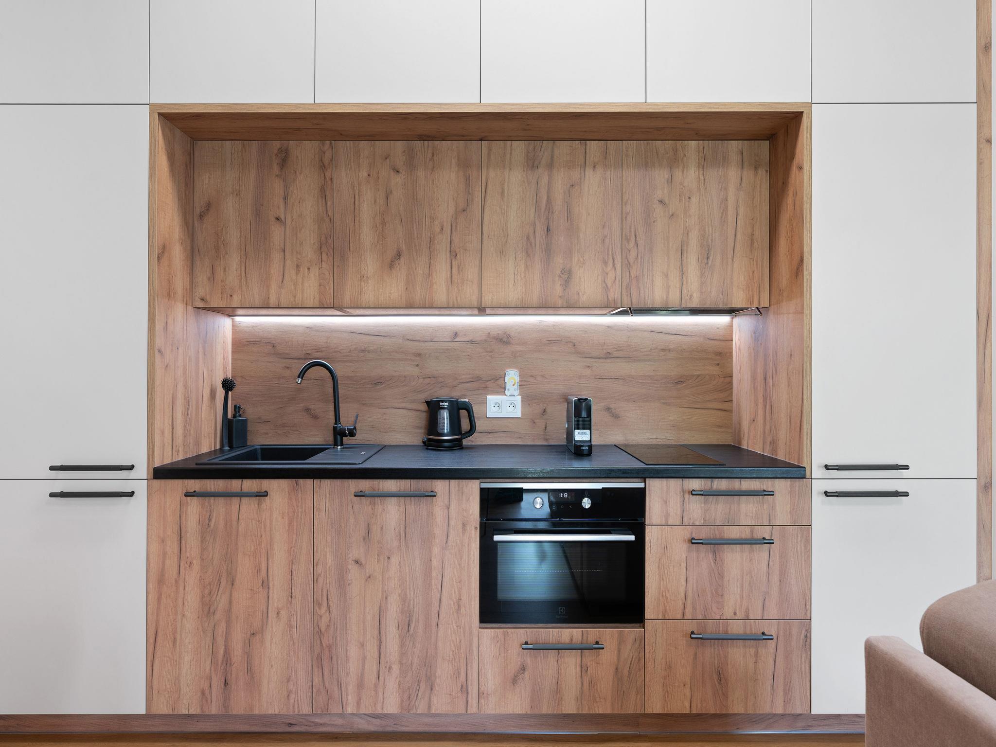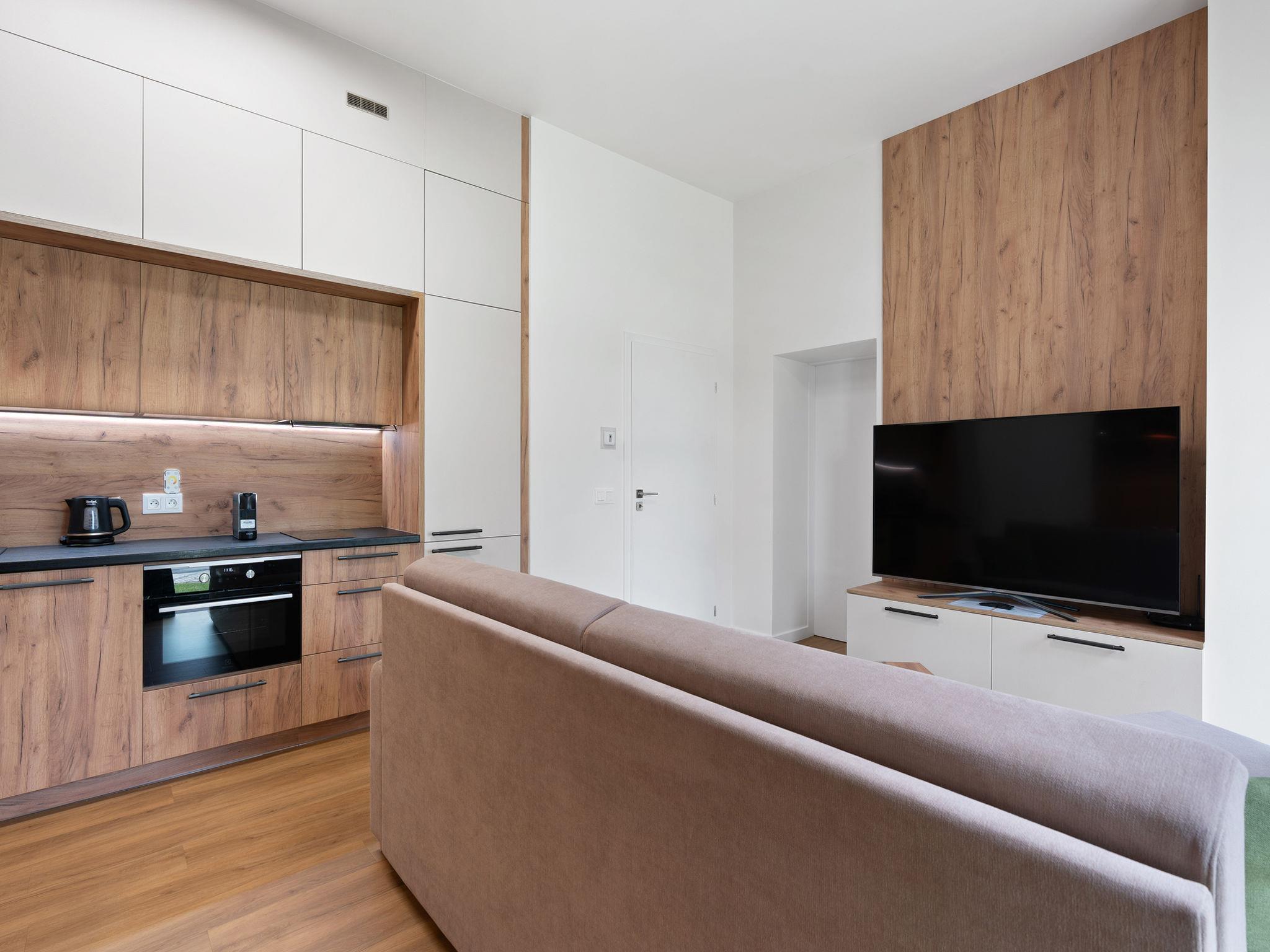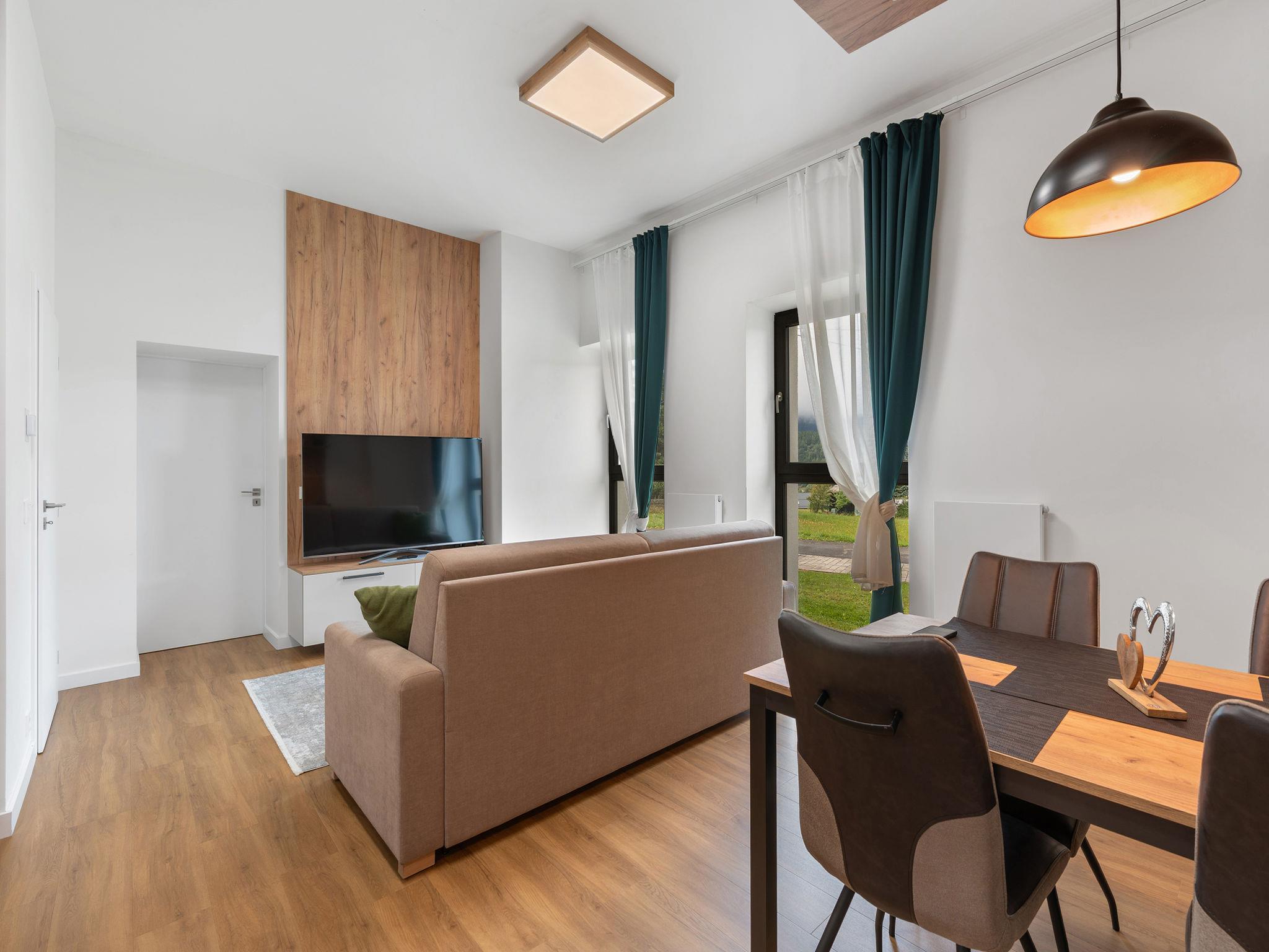 "Javorná Lodge", 2-Zimmer-Wohnung 45 m2, im Erdgeschoss, Südwestlage. Hell, modern eingerichtet: Eingang. Wohnzimmer mit 1 Doppeldiwanbett und TV. 1 Zimmer mit 1 Doppelbett. Kochnische (Backofen, Geschirrspüler, 2 Glaskeramikplatten, Wasserkocher, Tiefkühler) mit Essecke. Bad/WC. Zur Verfügung: Internet (WLAN, gratis). Bitte beachten: Nichtraucher-Unterkunft.