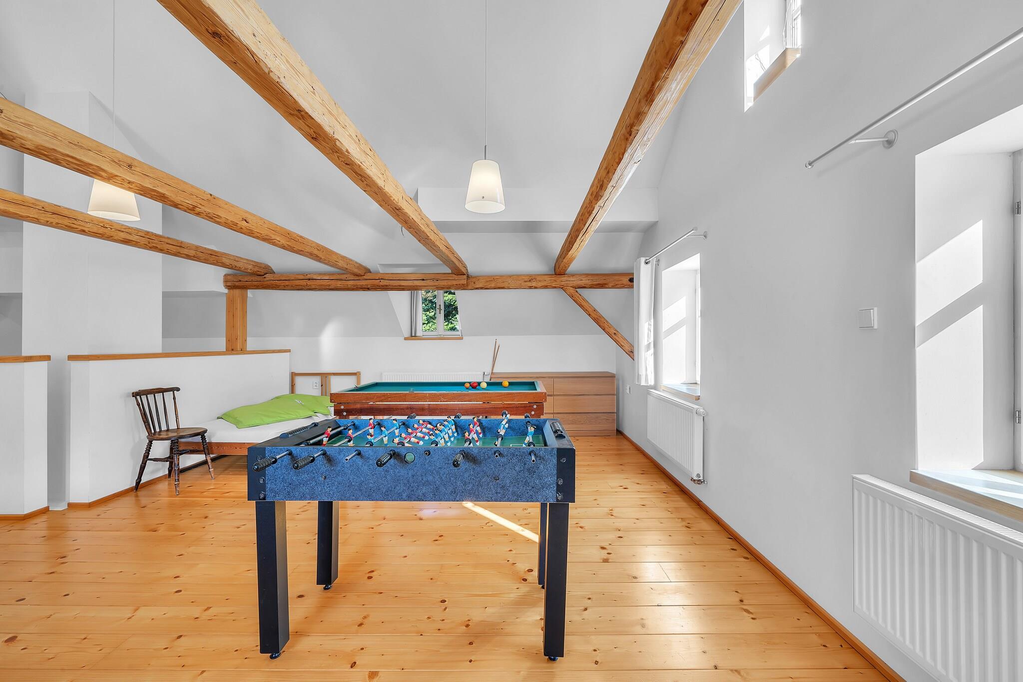 Suchen Sie eine moderne, voll möblierte Villa für eine große Gruppe? Diese charmante weiße Ferienvilla, perfekt für bis zu 11 Personen, bietet alles, was Sie für einen unvergesslichen Aufenthalt brauchen. Eingebettet in ein kinderfreundliches Waldgebiet verbindet sie modernen Komfort mit einer gemütlichen Atmosphäre und bietet den idealen Rückzugsort für Familien und Gruppen gleichermaßen. Die umliegende Natur von Mladé Buky ist ein Paradies für Outdoor-Fans. Wandern Sie oder fahren Sie mit dem Lift auf den Gipfel der Schneekoppe, dem höchsten Gipfel des Riesengebirges, oder genießen Sie den Baumwipfelpfad in Janske Lazne. Familien mit kleinen Kindern werden das nahe gelegene Areal Mladé Buky zum Rodeln und Spielen auf dem Spielplatz lieben. Besuchen Sie den nahe gelegenen Zoo mit seiner Safari oder erkunden Sie die atemberaubenden Felsformationen von Adrspach. Diese Villa bietet zu jeder Jahreszeit endlose Möglichkeiten für Abenteuer und Entspannung. Mit fünf Schlafzimmern, drei Bädern und zwei Toiletten gibt es reichlich Platz für alle. Die voll ausgestattete Küche mit Kühlschrank, Gefrierschrank, Ofen, Mikrowelle, Geschirrspüler, Kaffeemaschine und allen notwendigen Küchenutensilien erleichtert die Zubereitung köstlicher Mahlzeiten. An sonnigen Tagen können Sie sich im privaten Swimmingpool abkühlen oder draußen auf der Terrasse mit Gartenmöbeln entspannen. Am Abend können Sie sich um eine Feuerstelle versammeln und die ruhige Umgebung genießen. Entspannen Sie drinnen vor dem Satellitenfernsehen oder fordern Sie Ihre Gruppe zu einer Partie Billard oder Tischfußball auf dem Dachboden heraus. Für zusätzlichen Komfort stehen Ihnen eine Waschmaschine und ein Trockner zur Verfügung.