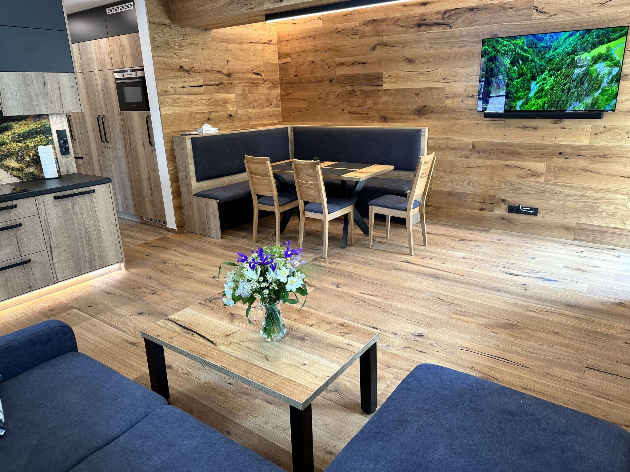 2-Zimmer-Wohnung im 1. Stock. Geräumig, luxuriös eingerichtet: Wohnzimmer mit 1 Doppeldiwanbett, Esstisch und TV. Ausgang zur Terrasse. 1 Zimmer mit 1 Doppelbett und 1 Ausziehbett. Kochnische (Backofen, Geschirrspüler, 4 Glaskeramikplatten, Mikrowelle, Tiefkühler, elektrische Kaffeemaschine). Dusche/WC. Grosse Terrasse. Terrassenmöbel. Schöne Sicht auf die Landschaft. Zur Verfügung: Internet (Wireless LAN, gratis). Parkplatz. Bitte beachten: geeignet für Familien. Nichtraucher-Unterkunft.
