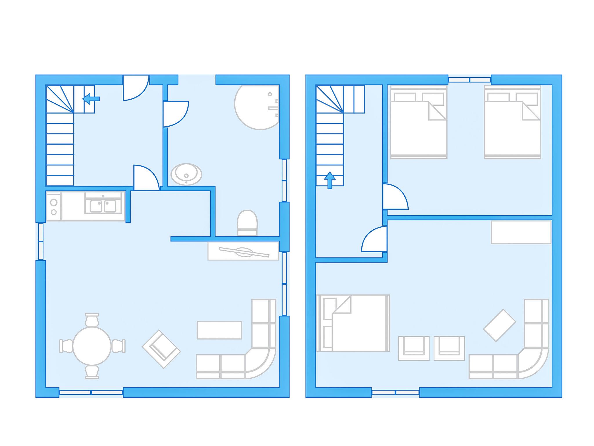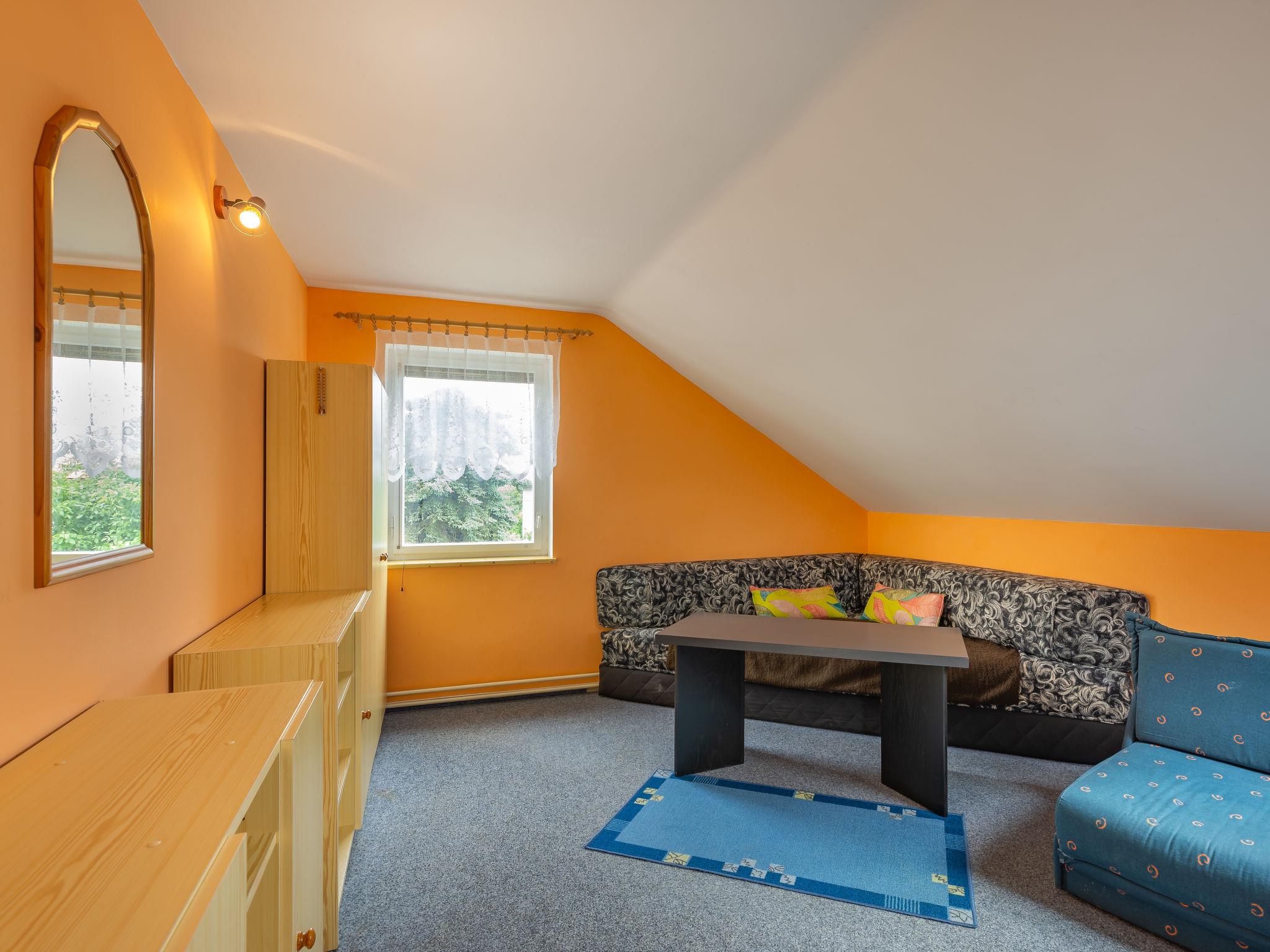 3-Zimmer-Haus 80 m2 auf 2 Stockwerken. Wohnzimmer mit Schwedenofen und Sat-TV. Ausgang zum Garten. Kochnische (2 Kochplatten, Mikrowelle, Tiefkühler, elektrische Kaffeemaschine) mit Esstisch. Dusche/WC. E-Heizung, Holzheizung, Boiler. Obergeschoss: 1 abgeschrägtes Zimmer mit 1 Bett und 1 Doppelbett. 1 abgeschrägtes Zimmer mit 1 Bett und 1 Doppelbett. Terrassenmöbel. Zur Verfügung: Internet (WLAN, gratis). Bitte beachten: geeignet für Familien. Nichtraucher-Haus. Maximal 3 Haustiere/Hunde erlaubt.