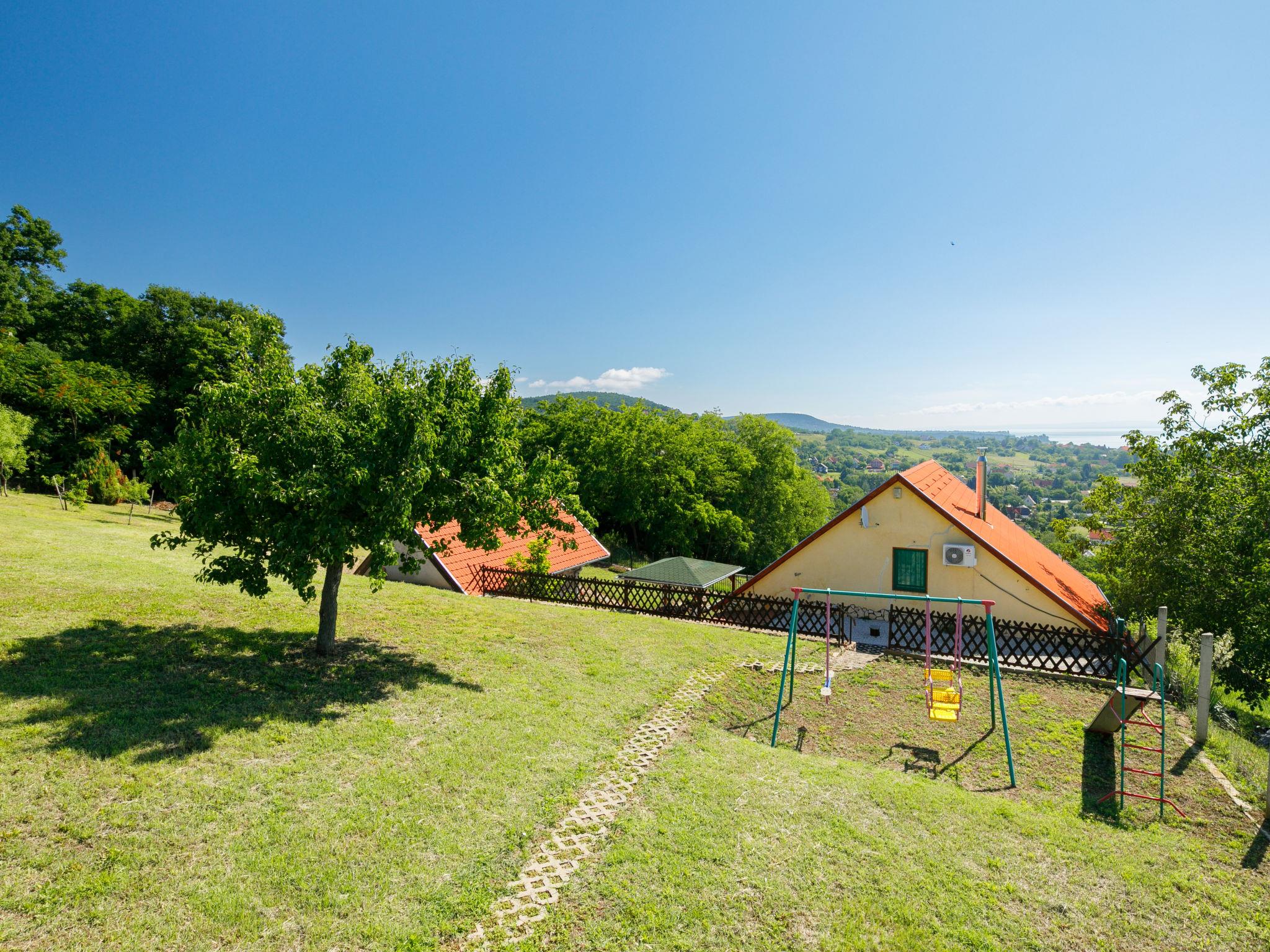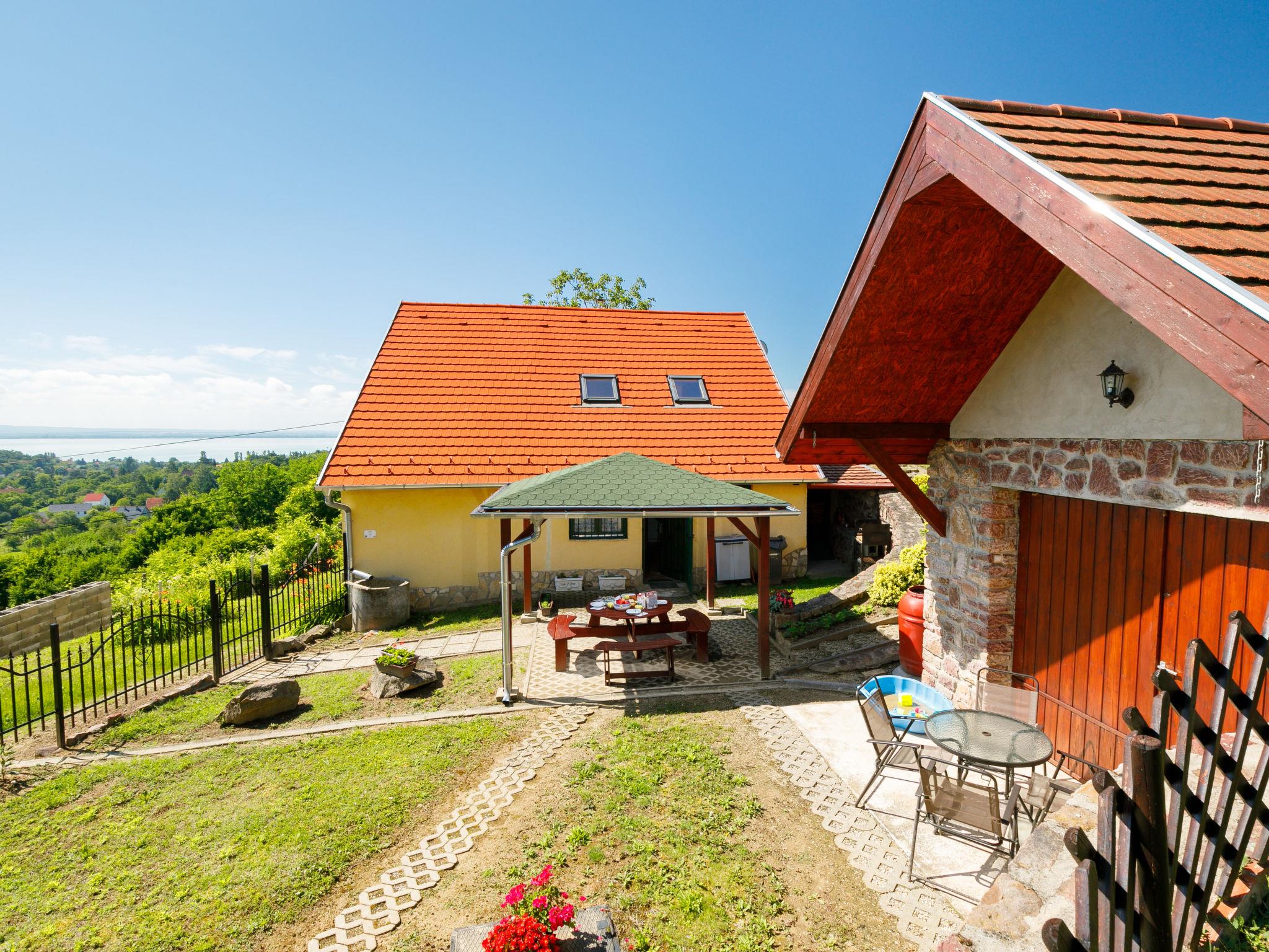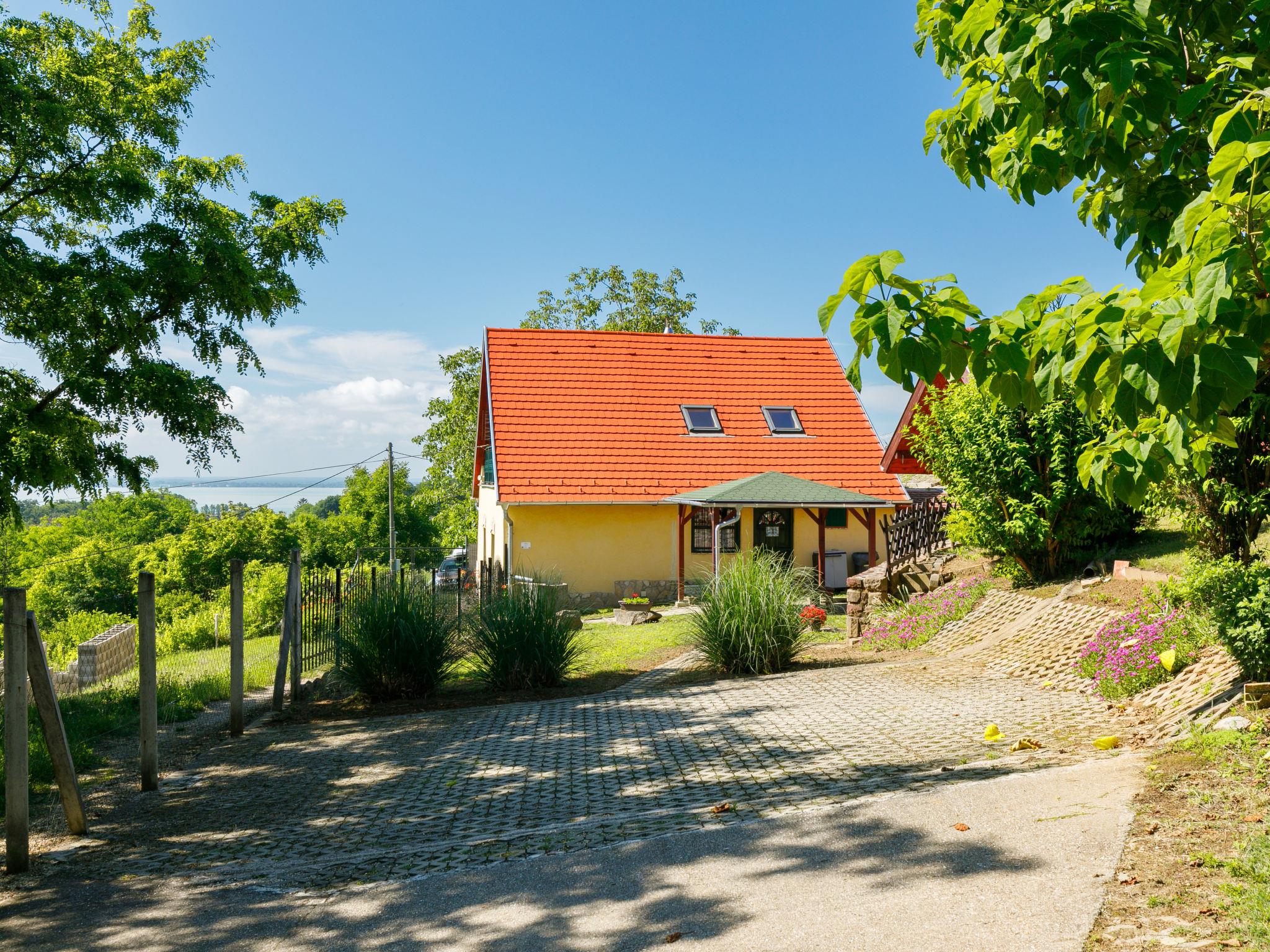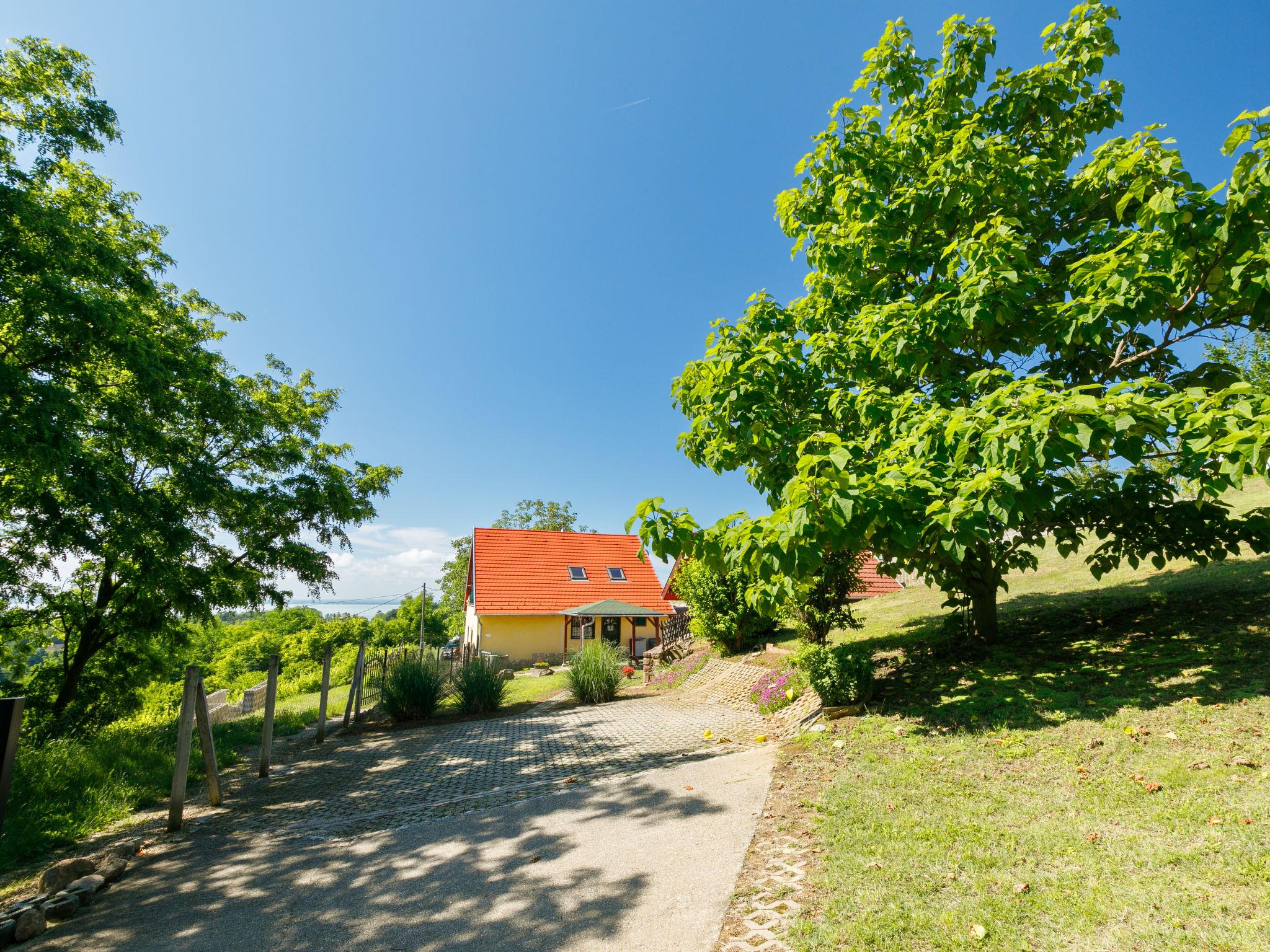 Ábrahámhegy 30 km von Keszthely: Freistehendes Haus "Fokas", umgeben von Bäumen, Wiesen und Weinbergen. 1.6 km vom Zentrum von Abrahamhegy, am Ortsrand, 15 km vom Zentrum von Tapolca, 33 km vom Zentrum von Keszthely, sonnige Lage am Hang, 2 km vom See, 2 km vom Strand. Zur Alleinbenutzung: Grundstück 300 m2 (eingezäunt) mit Bäumen, Wiese. Kinderspielplatz (Rutschbahn, Schaukel). 1 km lange holprige, schmale Zufahrt (200 m Naturweg). Parkplatz (für 2 Autos) auf dem Grundstück. Lebensmittelgeschäft 1.6 km, Supermarkt 13 km, Restaurant 1.6 km, Fahrradverleih 8 km, Grasstrand 2 km, Thermalbad "Hévíz" 39 km. Tennis 2.5 km, Radweg 800 m, Kinderspielplatz 1 km. Nahe gelegene Sehenswürdigkeiten: Festetics Castle 34 km, Tihany 33 km, Balatonfüred Annagora Aquapark 33 km, Tapolca Lake Cave Visitor Centre 14 km, Szigliget Castle 16 km, Festetics Zoo 32 km.