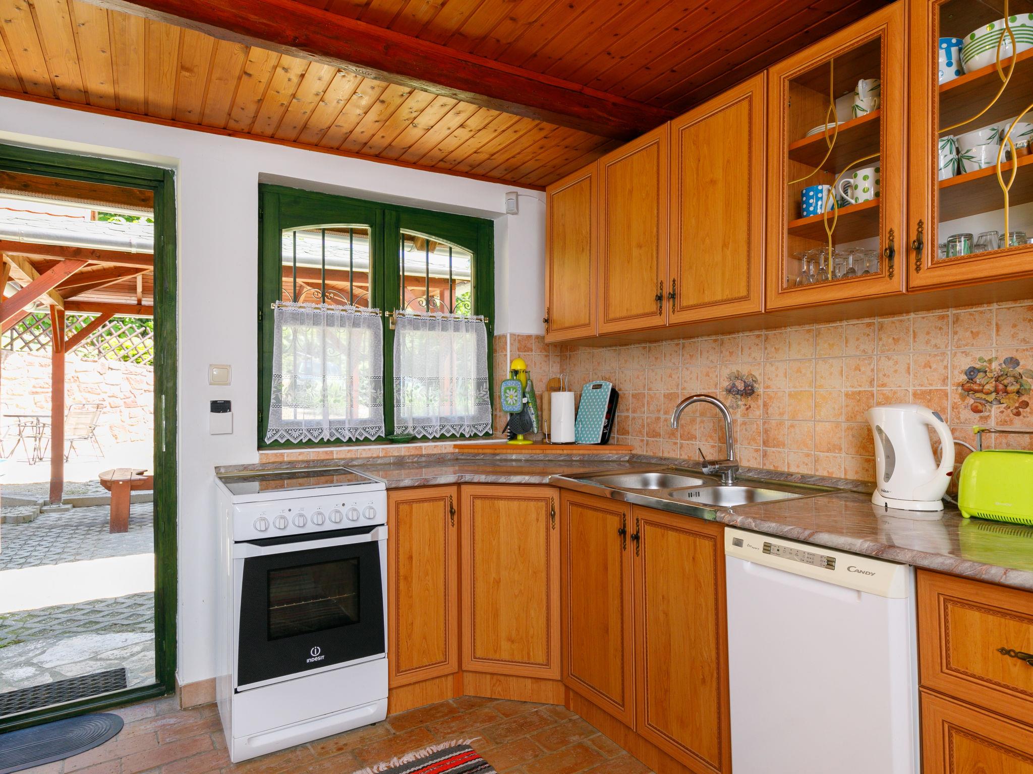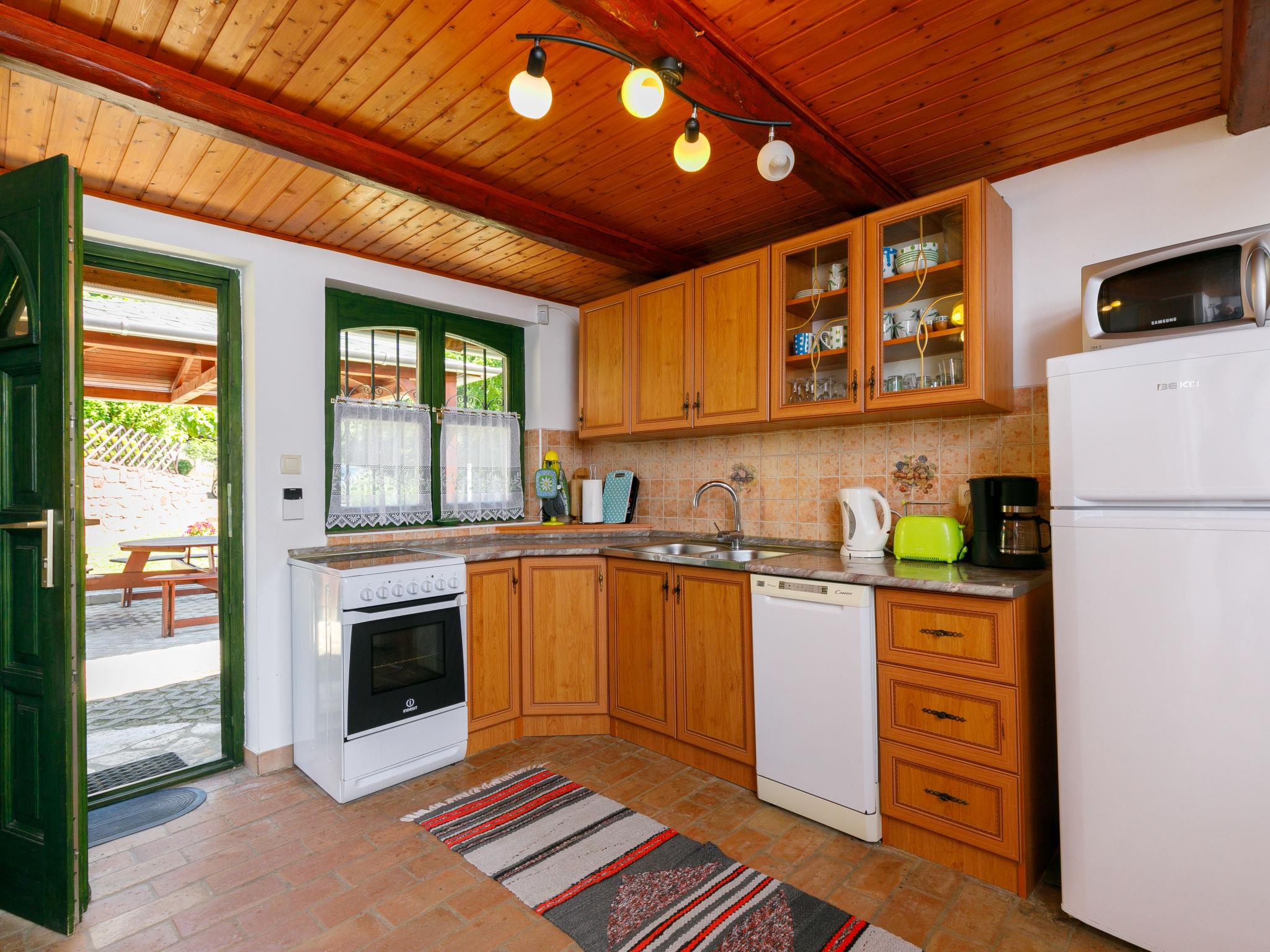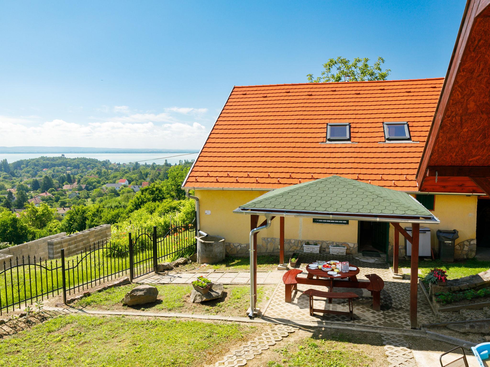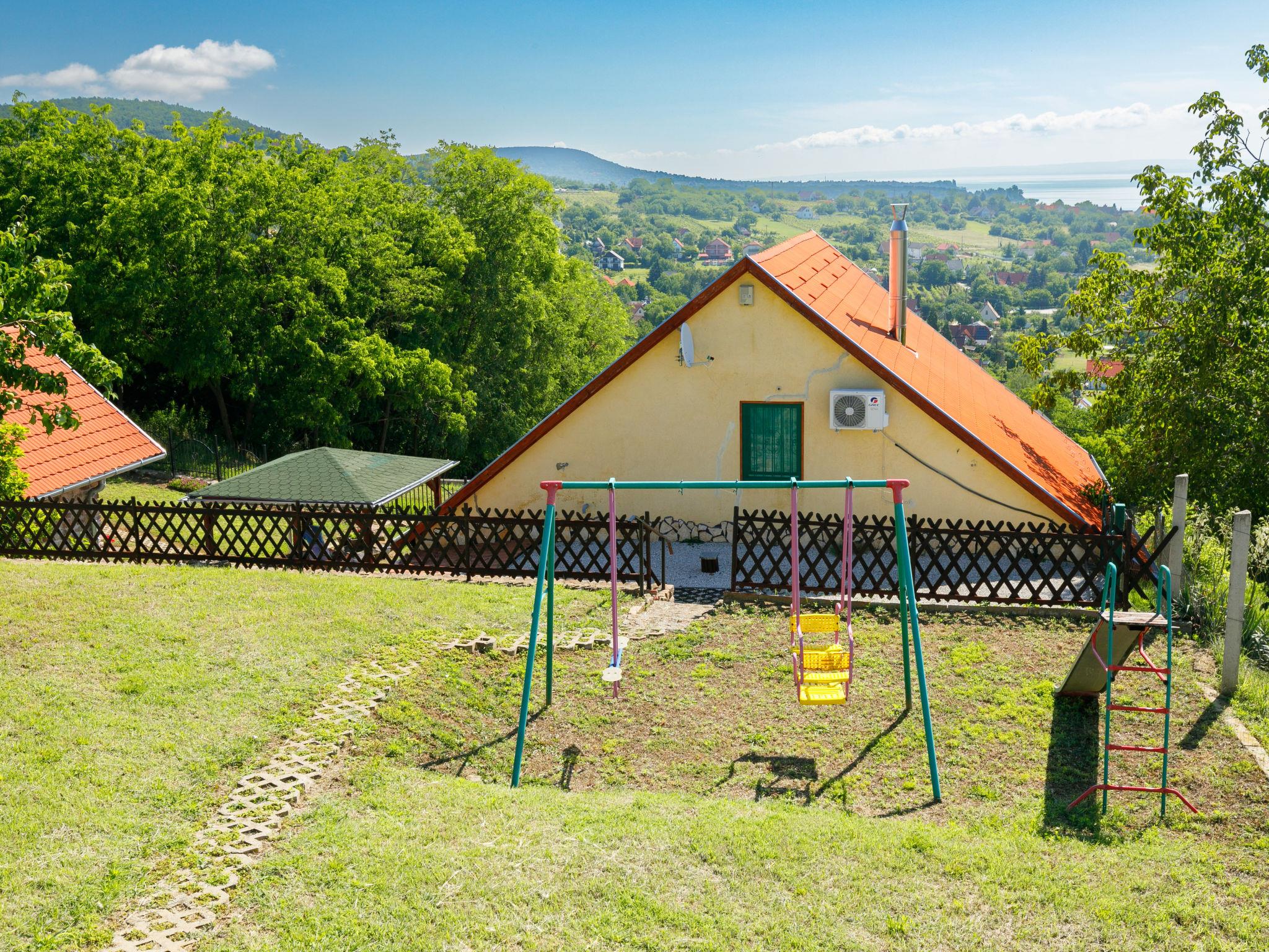 Ábrahámhegy 30 km von Keszthely: Freistehendes Haus "Fokas", umgeben von Bäumen, Wiesen und Weinbergen. 1.6 km vom Zentrum von Abrahamhegy, am Ortsrand, 15 km vom Zentrum von Tapolca, 33 km vom Zentrum von Keszthely, sonnige Lage am Hang, 2 km vom See, 2 km vom Strand. Zur Alleinbenutzung: Grundstück 300 m2 (eingezäunt) mit Bäumen, Wiese. Kinderspielplatz (Rutschbahn, Schaukel). 1 km lange holprige, schmale Zufahrt (200 m Naturweg). Parkplatz (für 2 Autos) auf dem Grundstück. Lebensmittelgeschäft 1.6 km, Supermarkt 13 km, Restaurant 1.6 km, Fahrradverleih 8 km, Grasstrand 2 km, Thermalbad "Hévíz" 39 km. Tennis 2.5 km, Radweg 800 m, Kinderspielplatz 1 km. Nahe gelegene Sehenswürdigkeiten: Festetics Castle 34 km, Tihany 33 km, Balatonfüred Annagora Aquapark 33 km, Tapolca Lake Cave Visitor Centre 14 km, Szigliget Castle 16 km, Festetics Zoo 32 km.