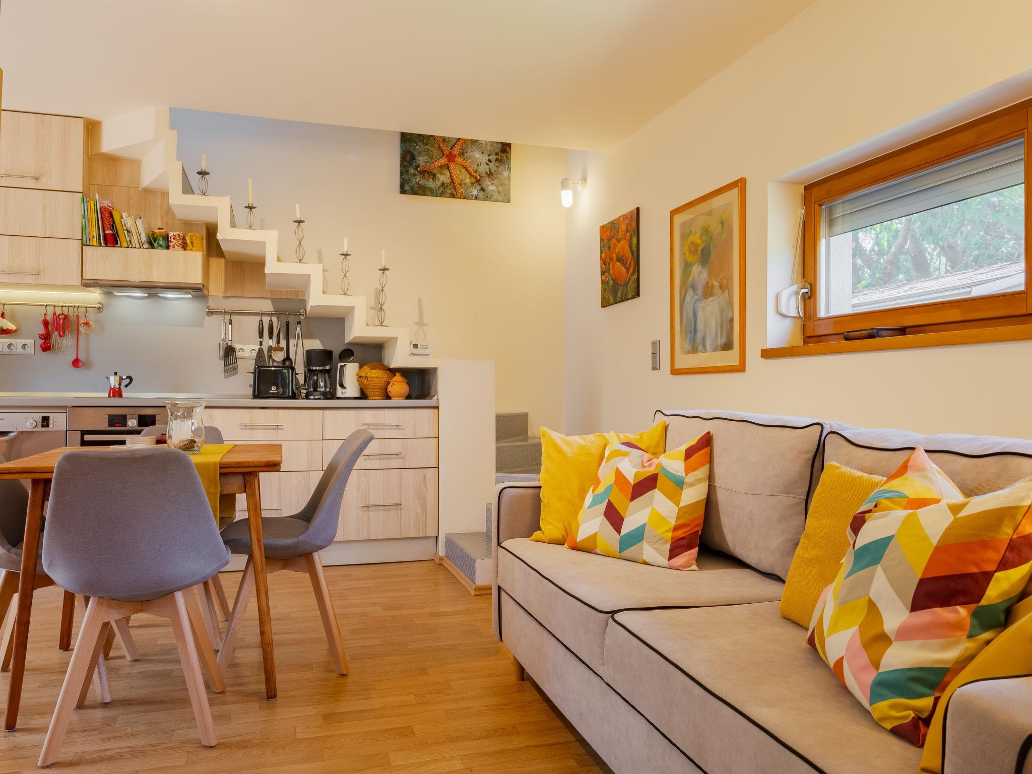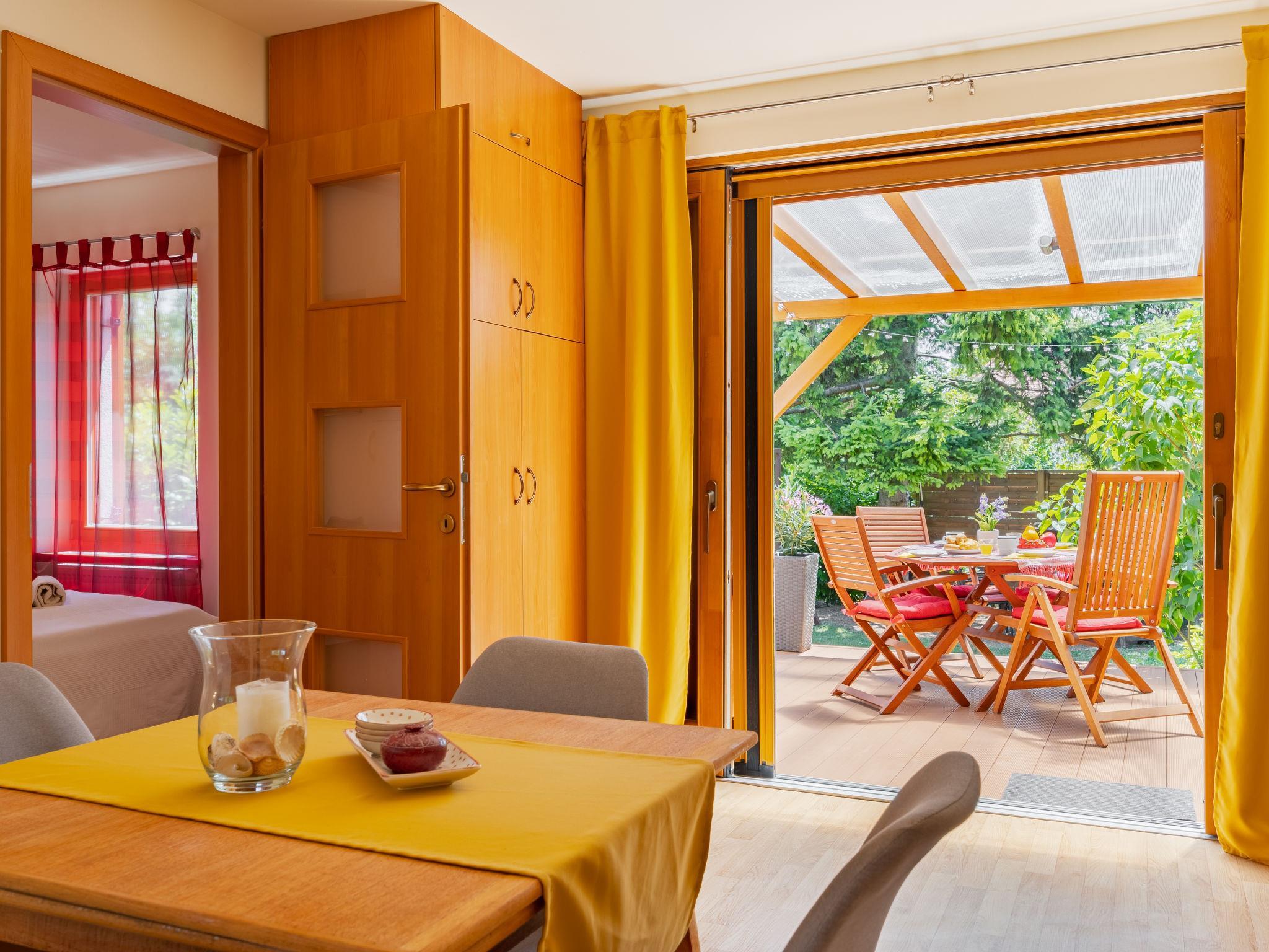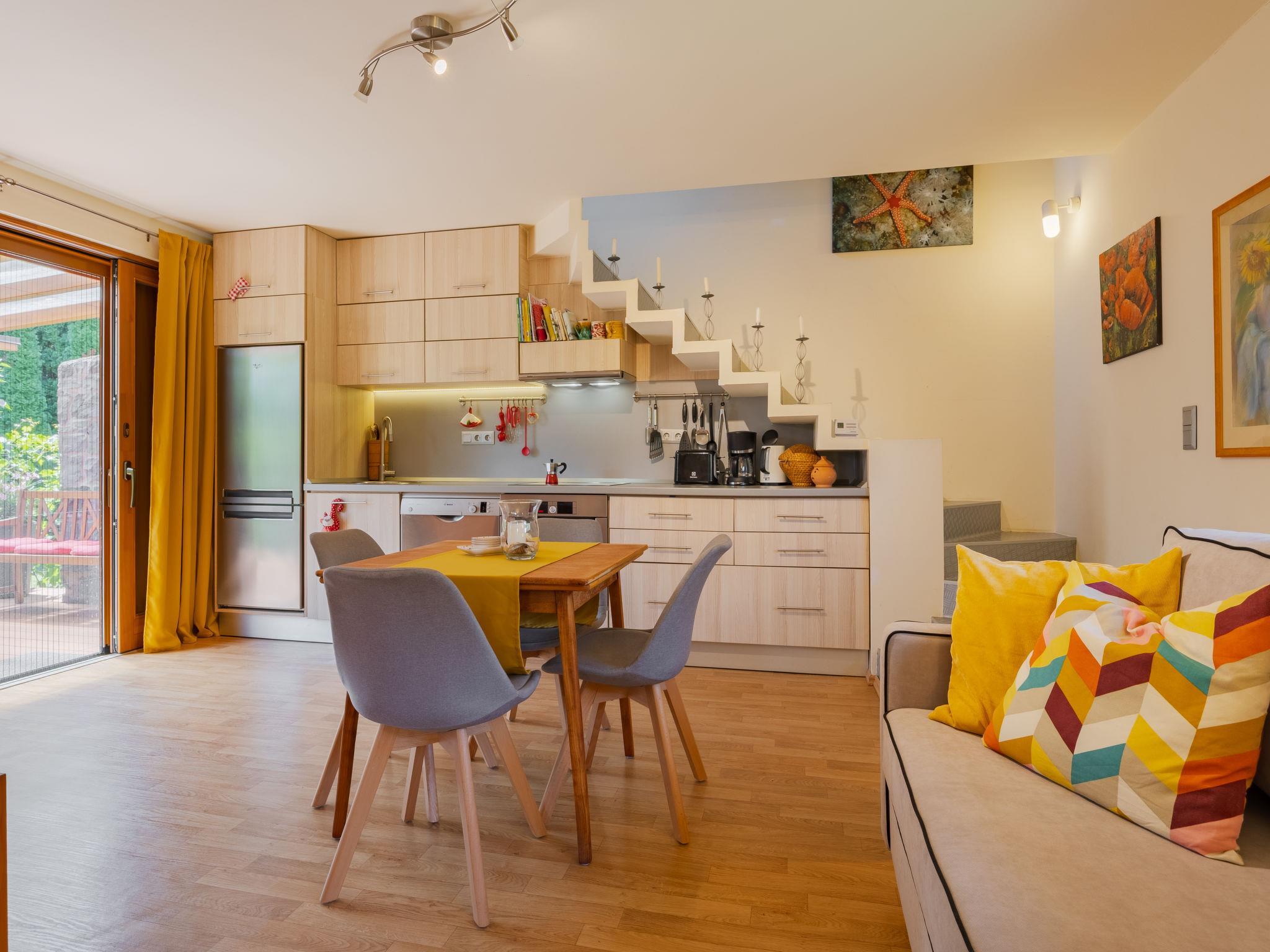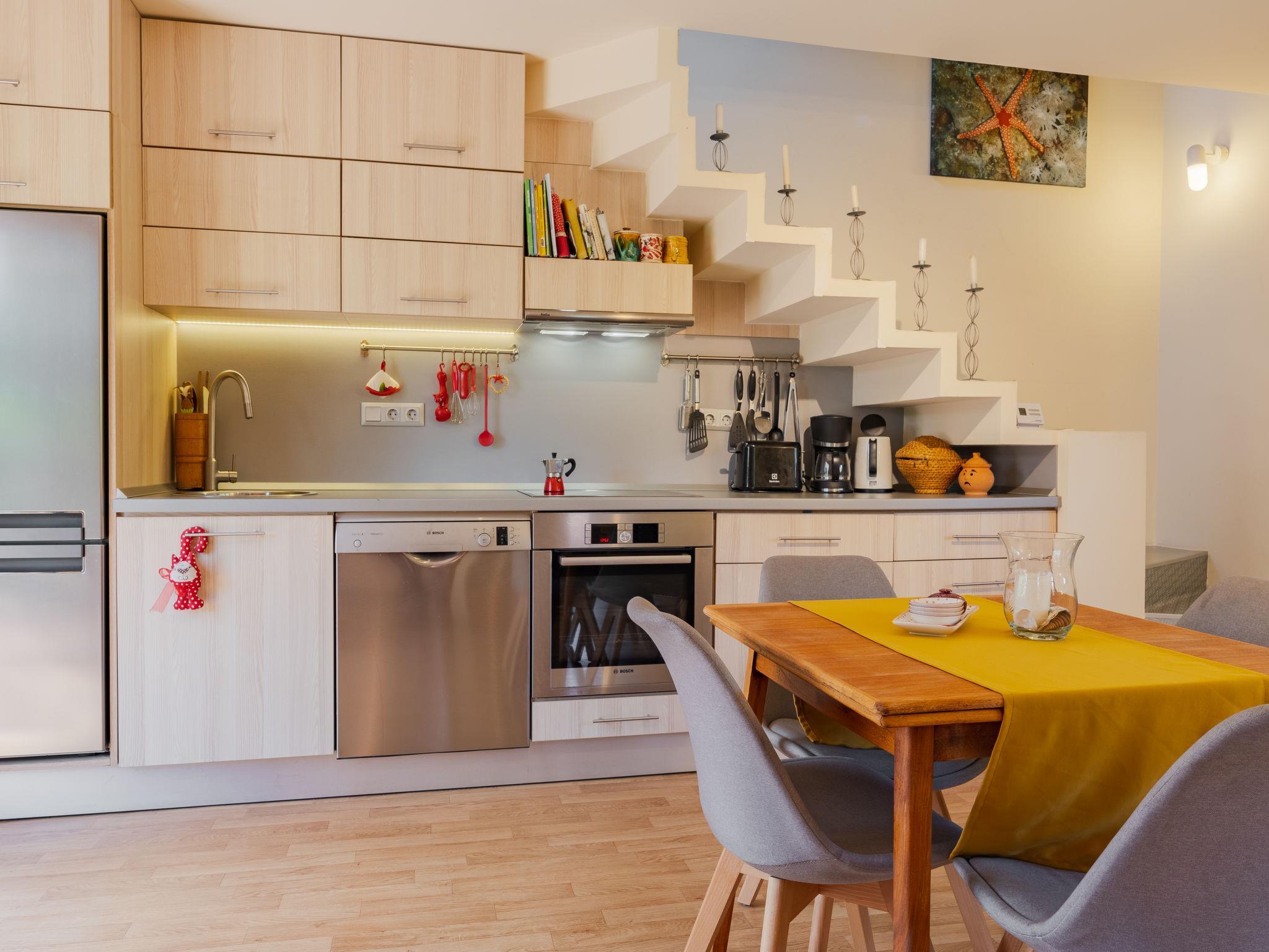 3-Zimmer-Doppelhaushälfte auf 2 Stockwerken, Südlage. Objekt geeignet für 5 Erwachsene + 1 Kind. Modern und gemütlich eingerichtet: offenes Wohn-/Esszimmer mit 1 Diwanbett und Esstisch. Ausgang zur Terrasse. 1 kleines Doppelzimmer mit 1 franz. Bett (160 cm, Länge 200 cm). (Backofen, Geschirrspüler, 4 Glaskeramikplatten, Toaster, Wasserkocher, Tiefkühler, elektrische Kaffeemaschine). Dusche/WC. Heizung. Obergeschoss: 1 Doppelzimmer mit 1 Bett (80 cm, Länge 180 cm), 1 franz. Bett (160 cm, Länge 200 cm), Klimaanlage. Dusche/WC. Terrasse, Südostlage. Terrassenmöbel, Gartengrill (mobil), Liegestühle (2). Zur Verfügung: Waschmaschine, Fliegengitter. Internet (WLAN). Parkplatz (eingezäunt). Bitte beachten: geeignet für Familien. Nichtraucher-Haus.