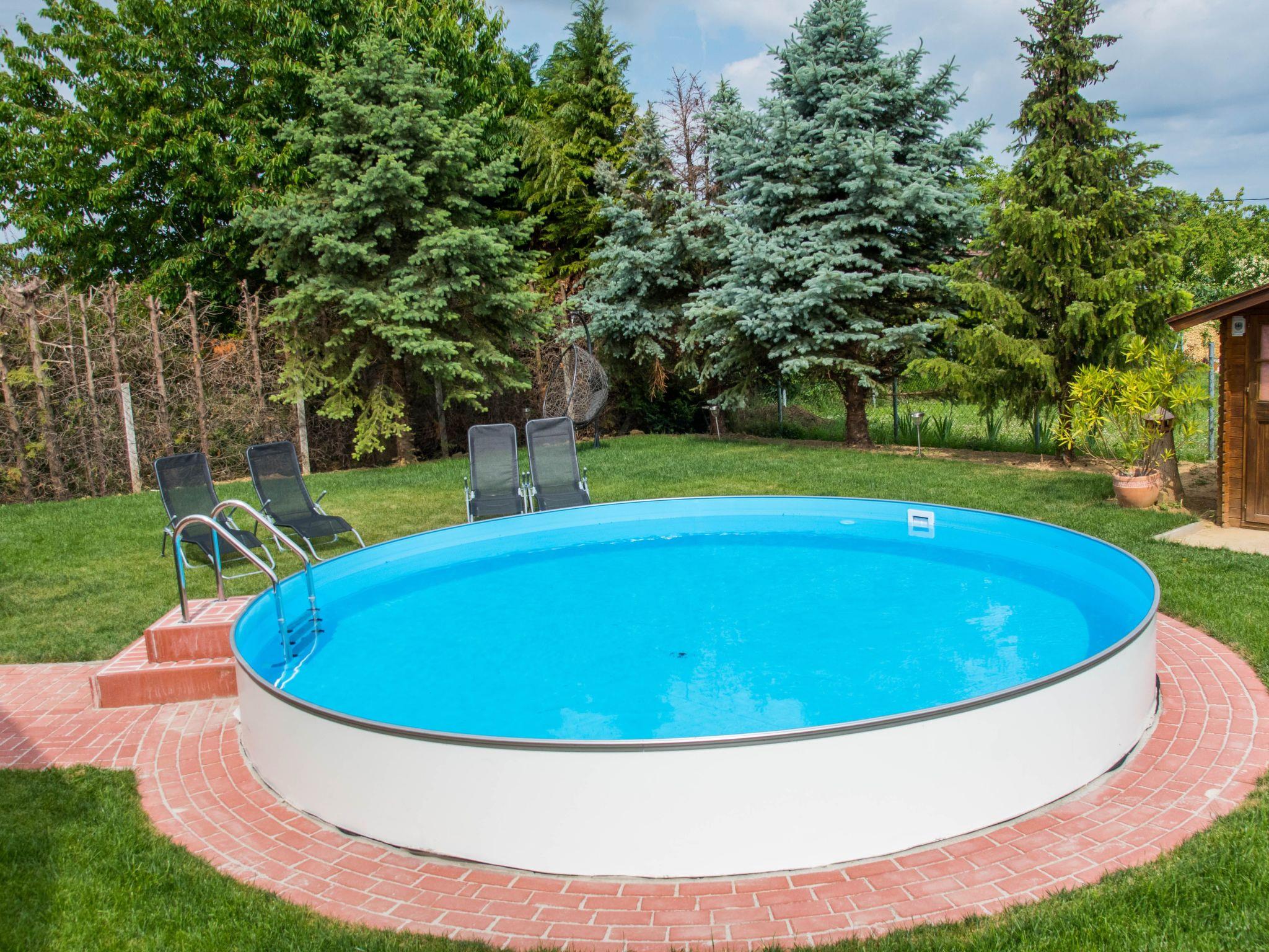 Der Pool ist fest eingebaut und hat einen Durchmesser von 5 Metern und eine Wassertiefe von 1,20 m.