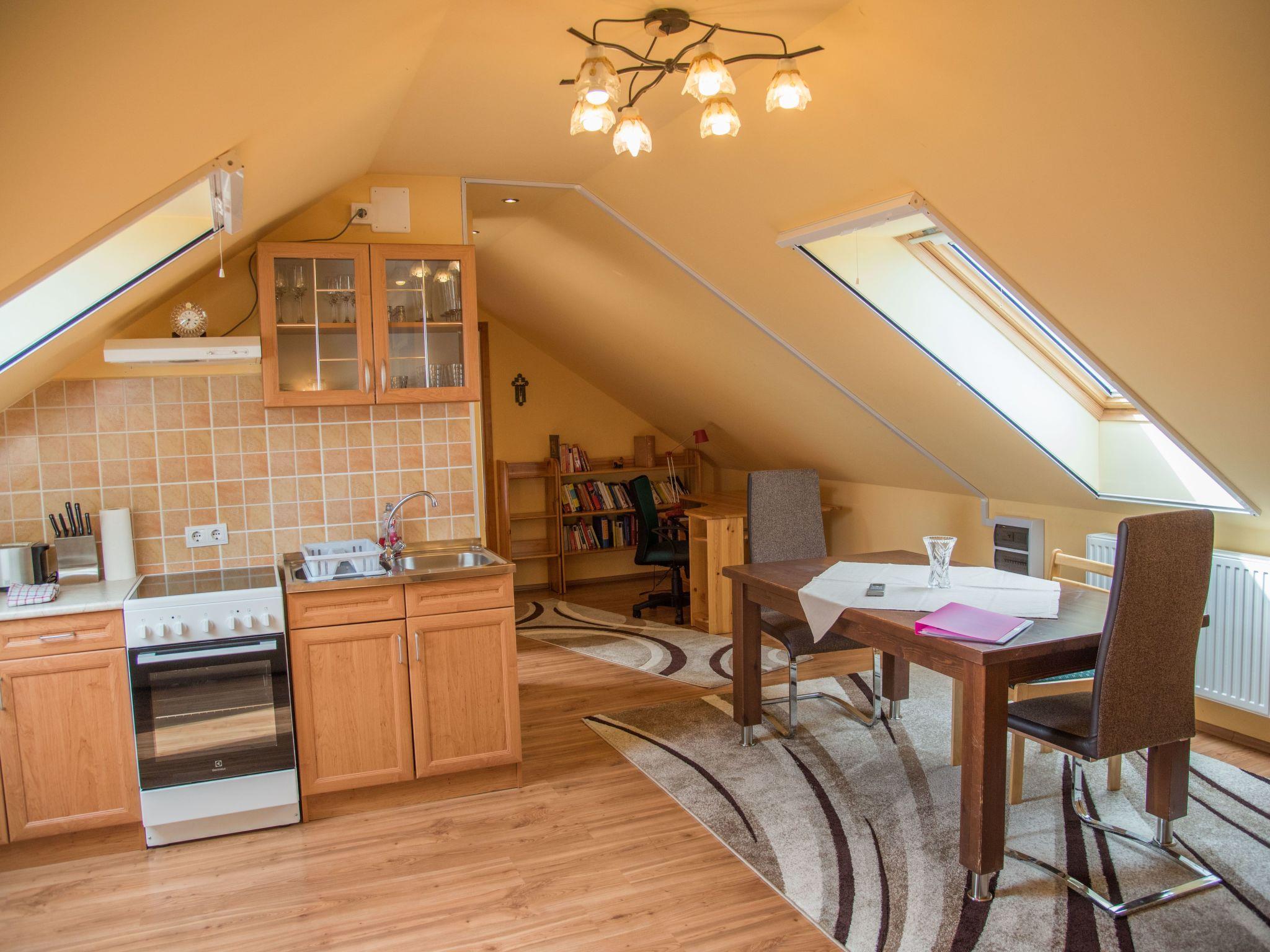 Wohnung Obergeschoss: In der Obergeschosswohnung befindet sich ein großes Schlafzimmer mit einem Doppelbett und einem Zusatzbett. Im Wohn-Essbereich gibt es ein weiteres Bett. Für eine vierköpfige Familie ist diese Wohnung ideal.