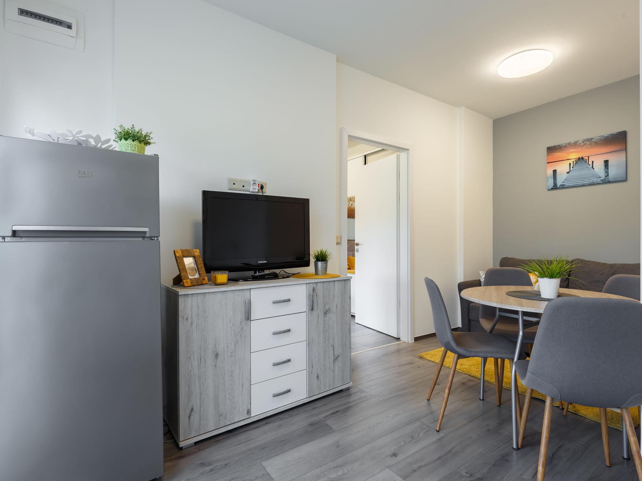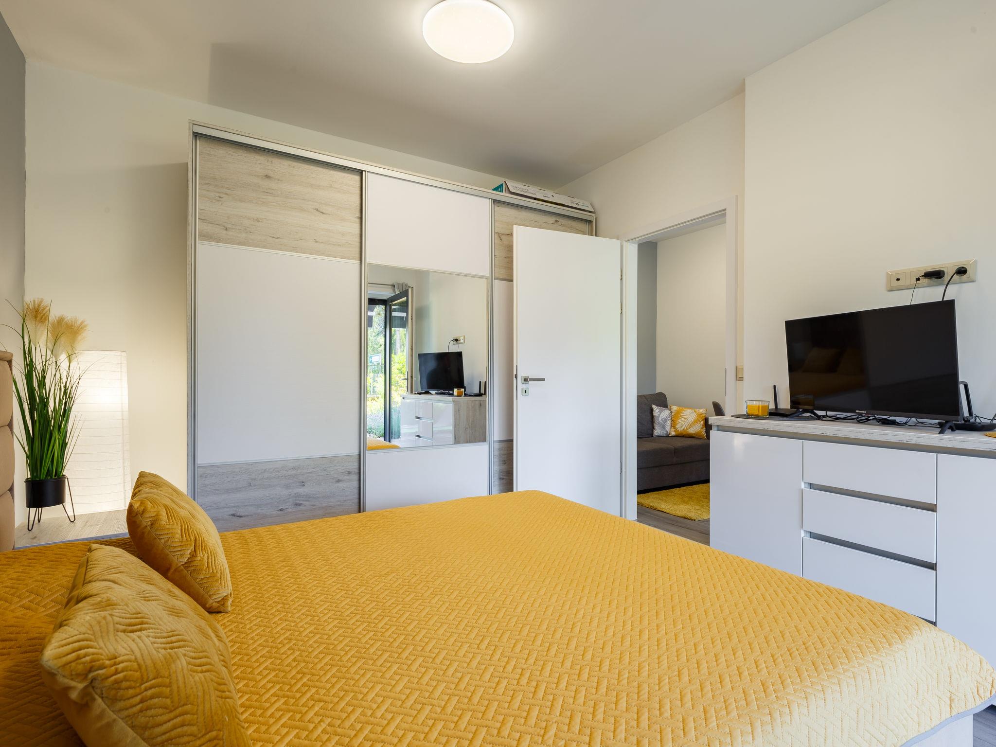 "Juventus", 2-Zimmer-Wohnung 28 m2, im Erdgeschoss. Schön und modern eingerichtet: Wohn-/Schlafzimmer mit 1 Ausziehbett (2 Pers.), Kabel-TV und Klimaanlage. Ausgang zur Terrasse. 1 Zimmer mit 1 franz. Bett (160 cm, Länge 200 cm), Kabel-TV und Klimaanlage. Offene Küche (2 Kochplatten, Mikrowelle, Tiefkühler, elektrische Kaffeemaschine). Dusche/WC. Keine Heizmöglichkeit. Terrasse 10 m2. Terrassenmöbel, Liegestühle (2). Zur Verfügung: Kinderhochstuhl, Babybett (extra). Parkplatz Nr. 2 (1 Auto).
