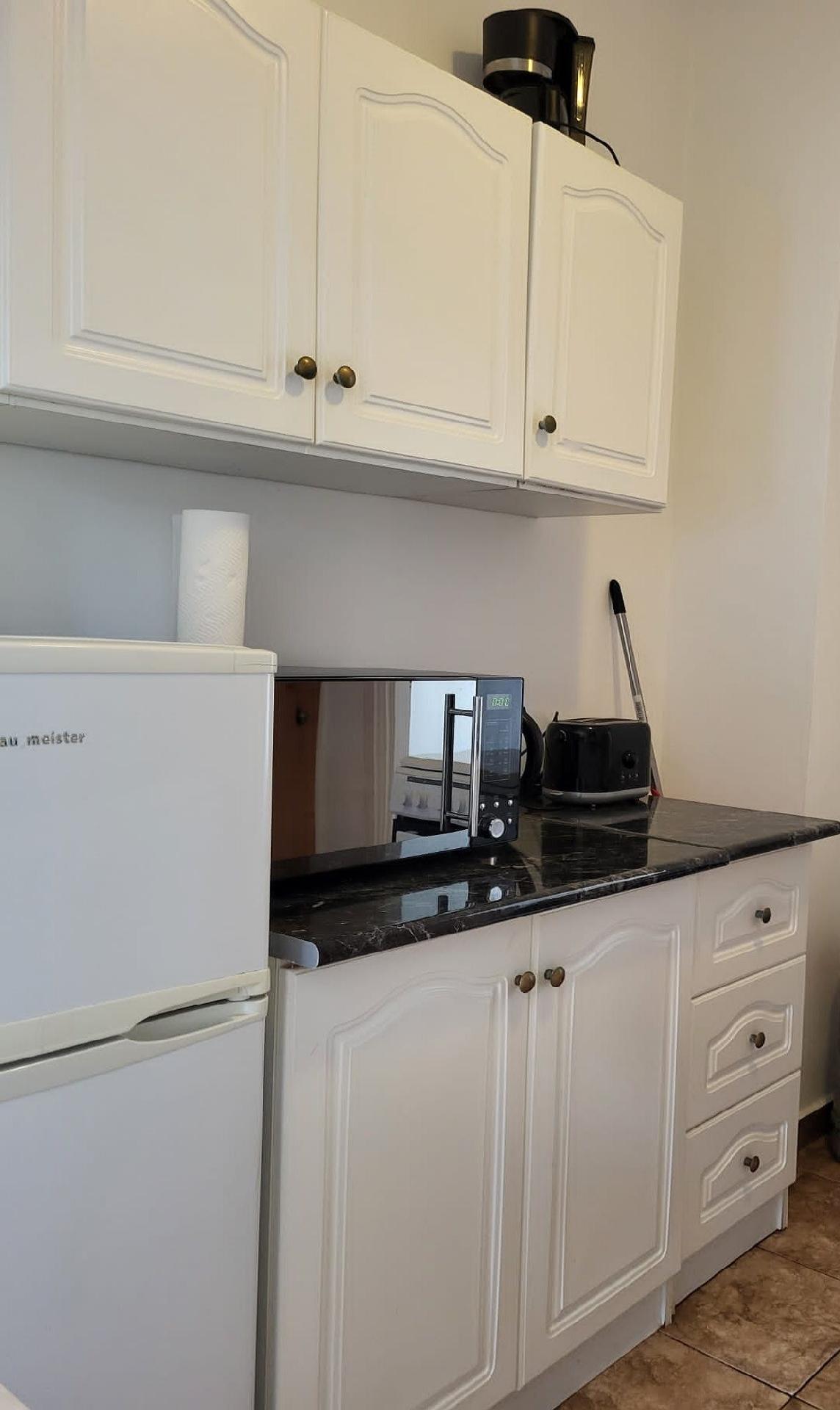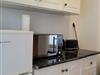 Esszimmer mit TV. Küche mit Kühlschrank, Backoffen, Spülmaschine, Mikrowelle mit Back und Grillfunktion, Kaffeemaschine, Toaster, Wasserkocher.