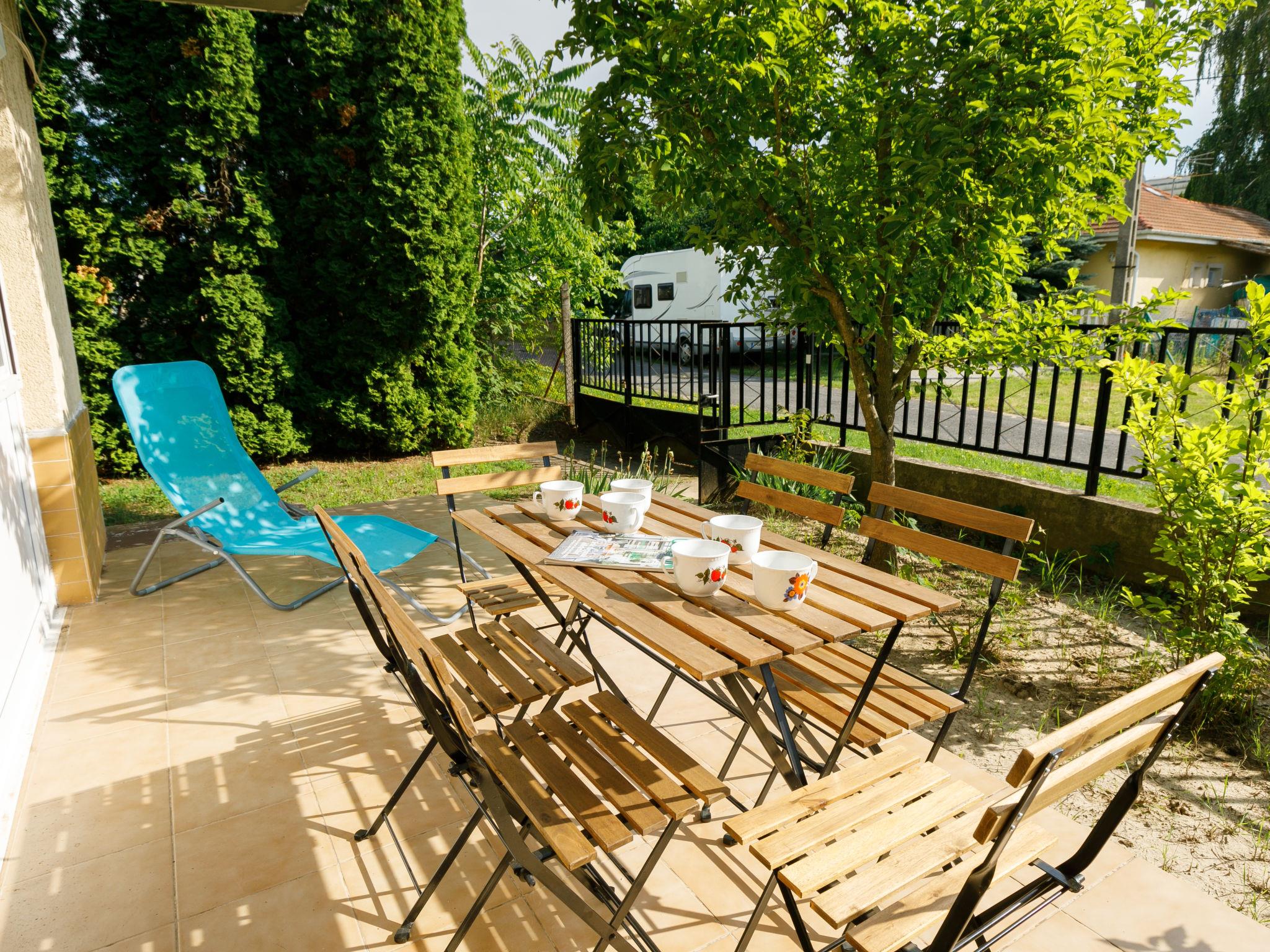 Balatonszárszó 27 km von Siófok: Doppelhaus "Palma", auf 2 Stockwerken. Im Ort, ruhige Lage, 700 m vom See, 1.6 km vom Strand. Zur Alleinbenutzung: Garten 350 m2 (eingezäunt) mit Rasen, Liegewiese. Lebensmittelgeschäft 1 km, Restaurant 500 m, Bahnstation 1 km, Grasstrand 700 m.