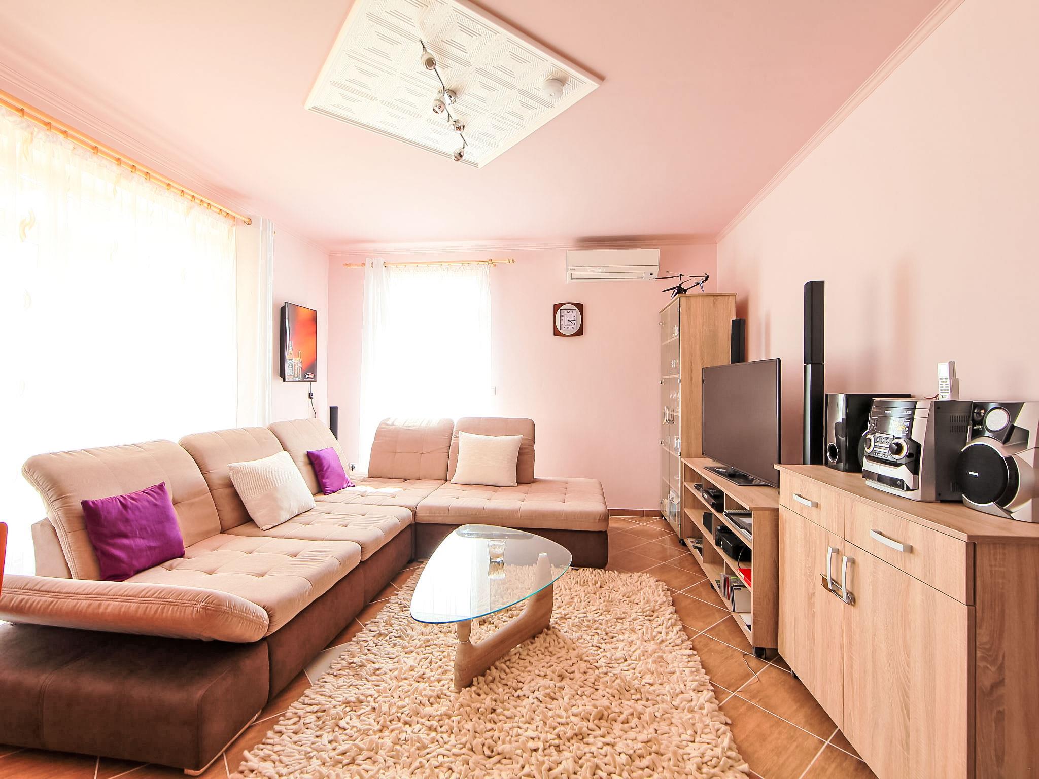 3-Zimmer-Haus 80 m2. Komfortabel und gemütlich eingerichtet: Wohnzimmer mit 1 Ausziehbett (2 Pers.), Esstisch und Sat-TV. Ausgang zur Terrasse. 2 Zimmer, jedes Zimmer mit 1 franz. Bett. Offene Küche (4 Kochplatten, Backofen, Geschirrspüler, Mikrowelle). Dusche/Bidet/WC, sep. WC. Heizung, Bodenheizung. Terrasse 15 m2. Terrassenmöbel. Zur Verfügung: Kinderhochstuhl, Babybett (extra). Parkplatz (2 Autos).