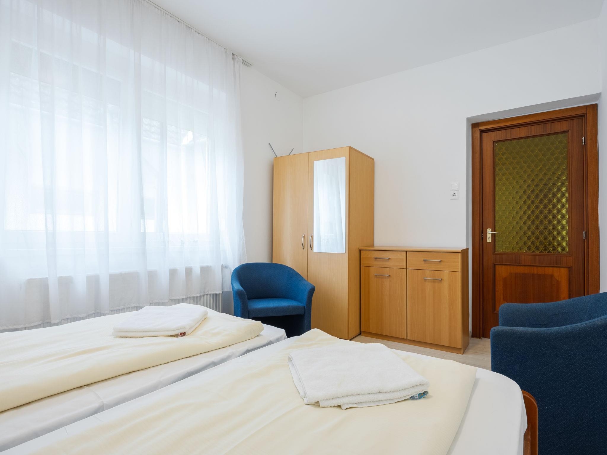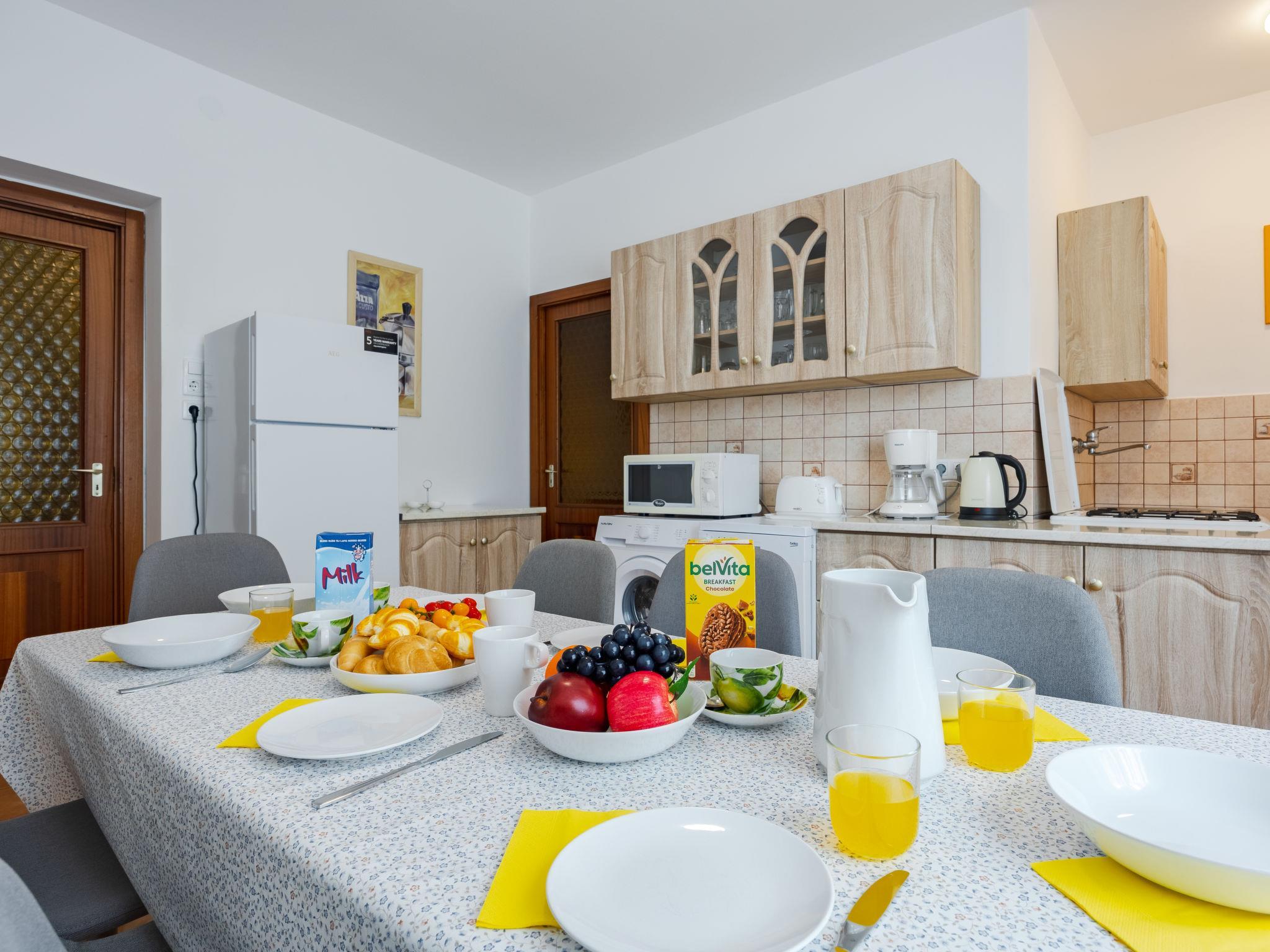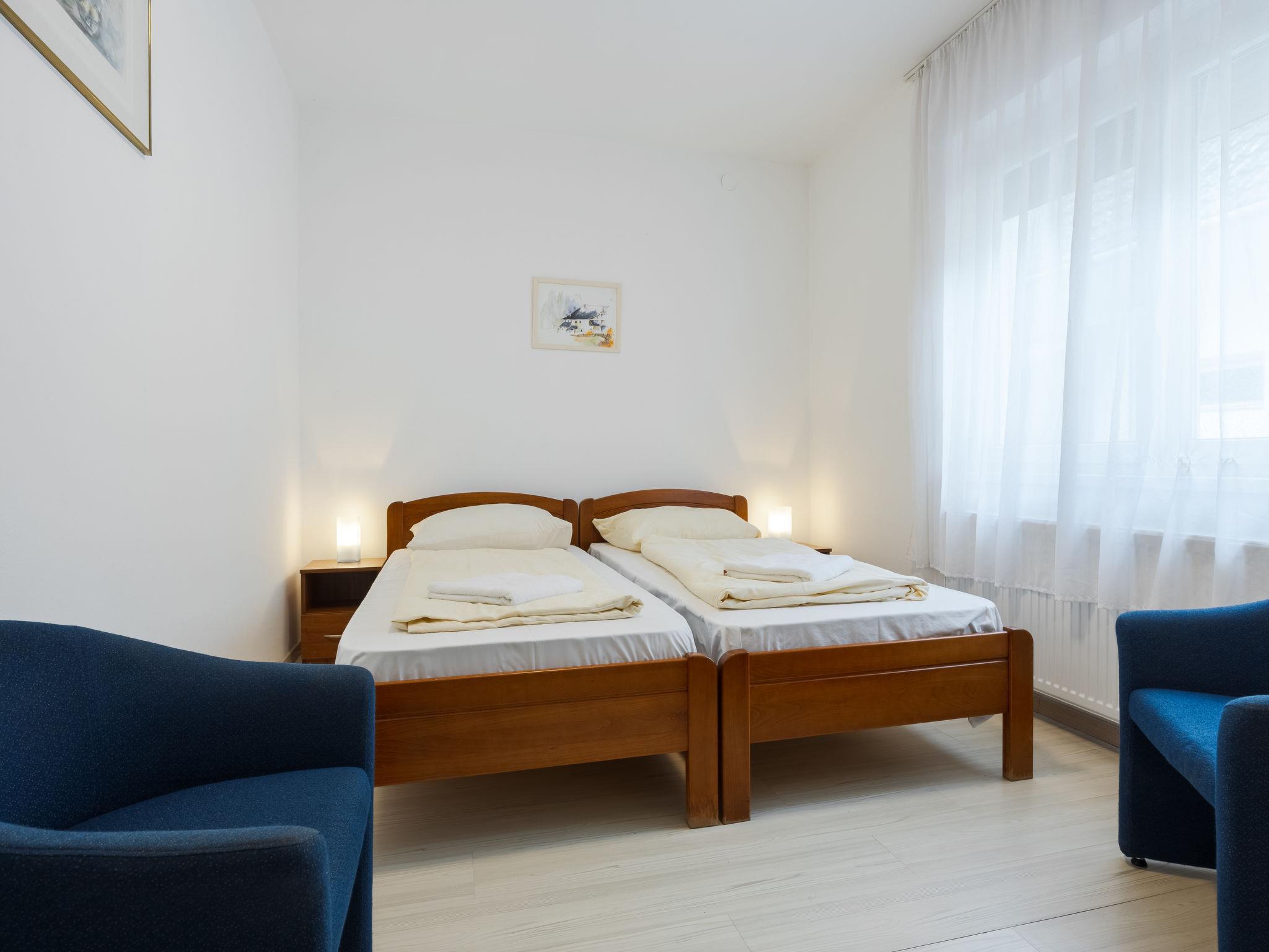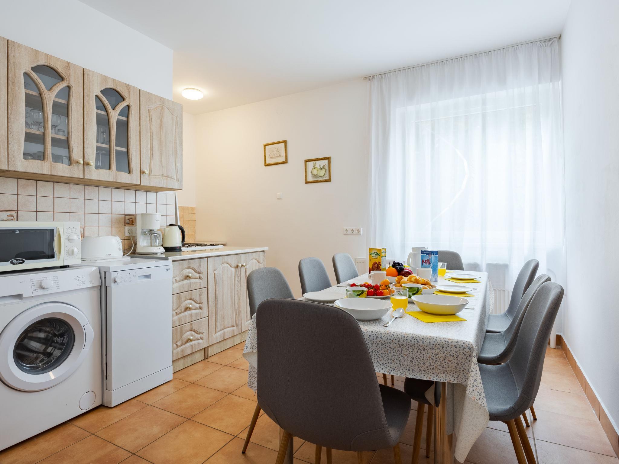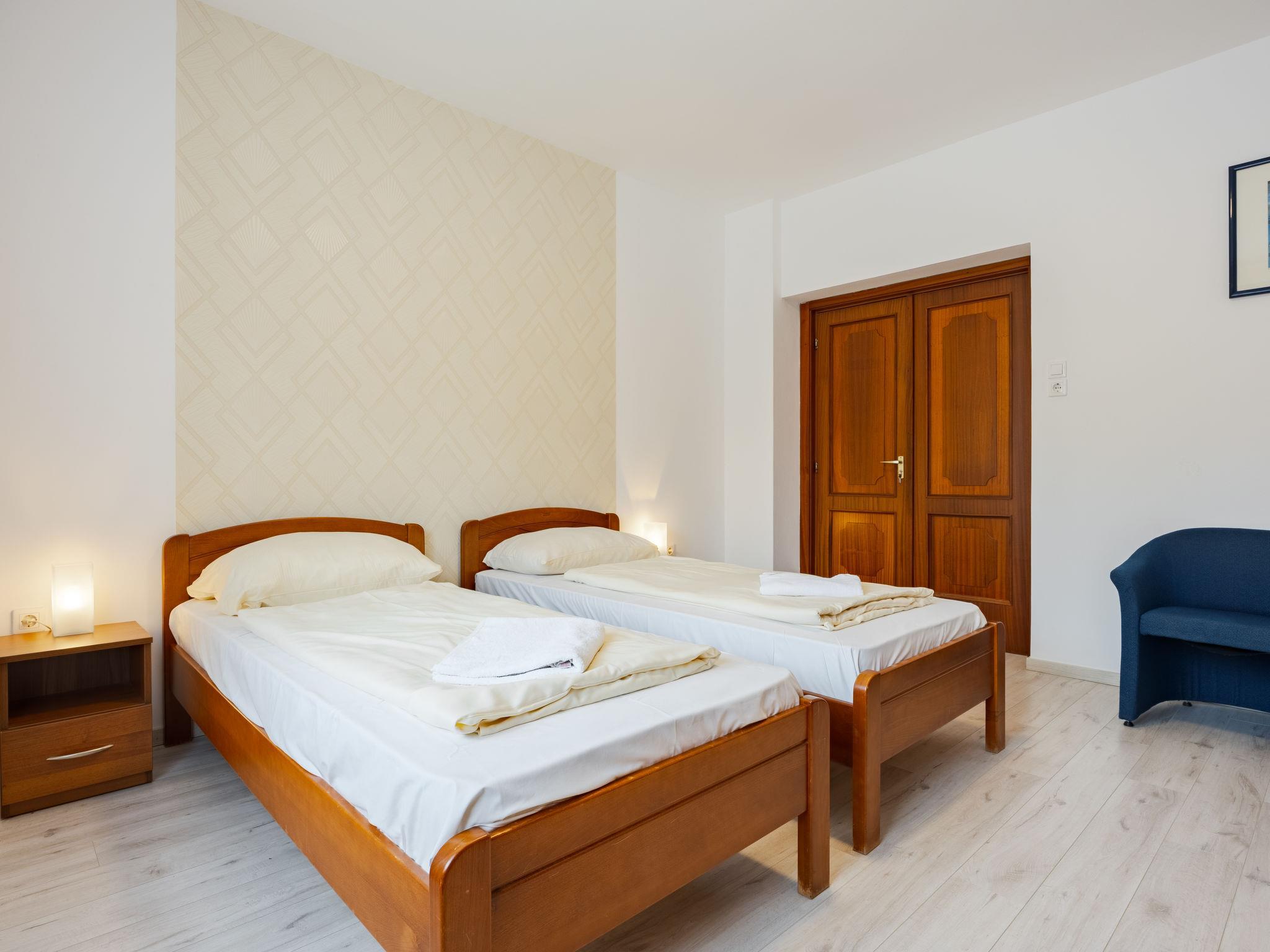 "Moni 1", 7-Zimmer-Wohnung 200 m2. Geräumig, komfortabel eingerichtet: Eingang mit Sat-TV. Ausgang zur Terrasse. 3 Zimmer, jedes Zimmer mit 2 Betten (90 cm, Länge 200 cm). Offene Küche (4 Kochplatten, Backofen, Geschirrspüler, Toaster, Wasserkocher, Mikrowelle, Tiefkühler, elektrische Kaffeemaschine). 2 Duschen/WC. Heizung, G-Heizung (extra), Klimaanlage. Obergeschoss: Eingang. Ausgang zum Balkon. Wohnzimmer mit Sat-TV und Klimaanlage. 3 Zimmer, jedes Zimmer mit 3 Betten und Klimaanlage. Offene Küche (3 Kochplatten, Backofen, Geschirrspüler, Toaster, Wasserkocher, Mikrowelle, Tiefkühler, elektrische Kaffeemaschine). Ausgang zum Balkon. Dusche/WC, sep. WC. Terrassenmöbel, Balkonmöbel, Gartengrill (mobil), Liegestühle (10). Zur Verfügung: Kinderhochstuhl, Babybett (extra). Parkplatz (eingezäunt, 4 Autos). Maximal 1 Haustier/Hund erlaubt. Bitte beachten Sie: Im Gebäude auf der Straßenseite befindet sich ein Lebensmittelladen. MA19022039