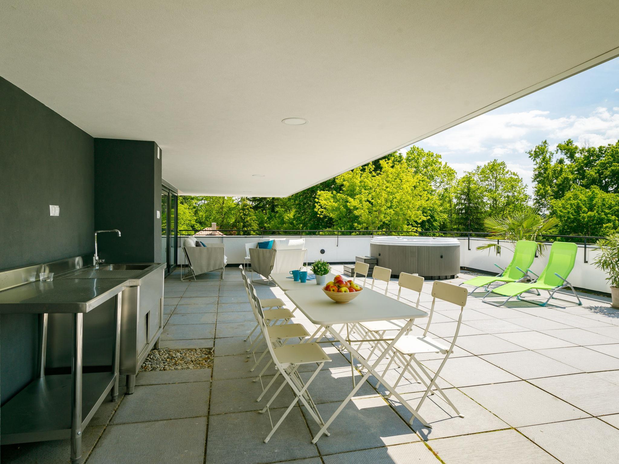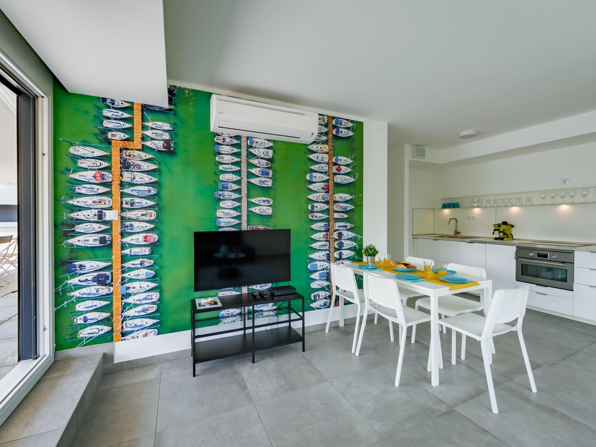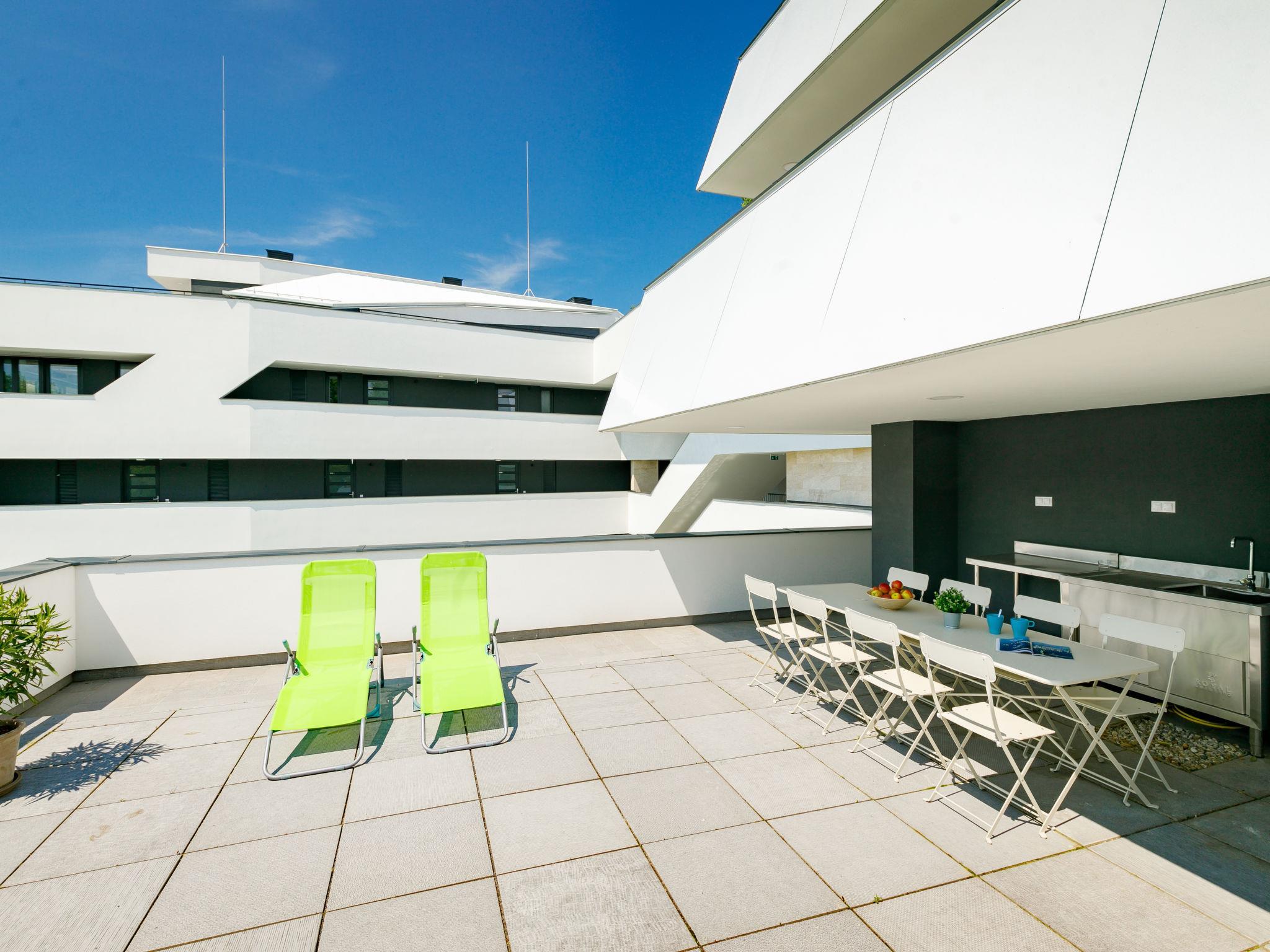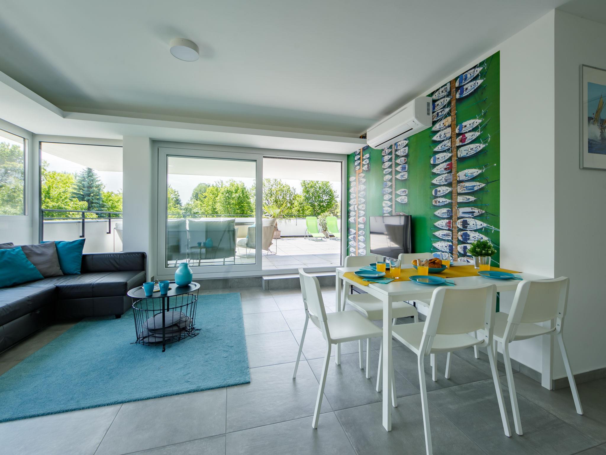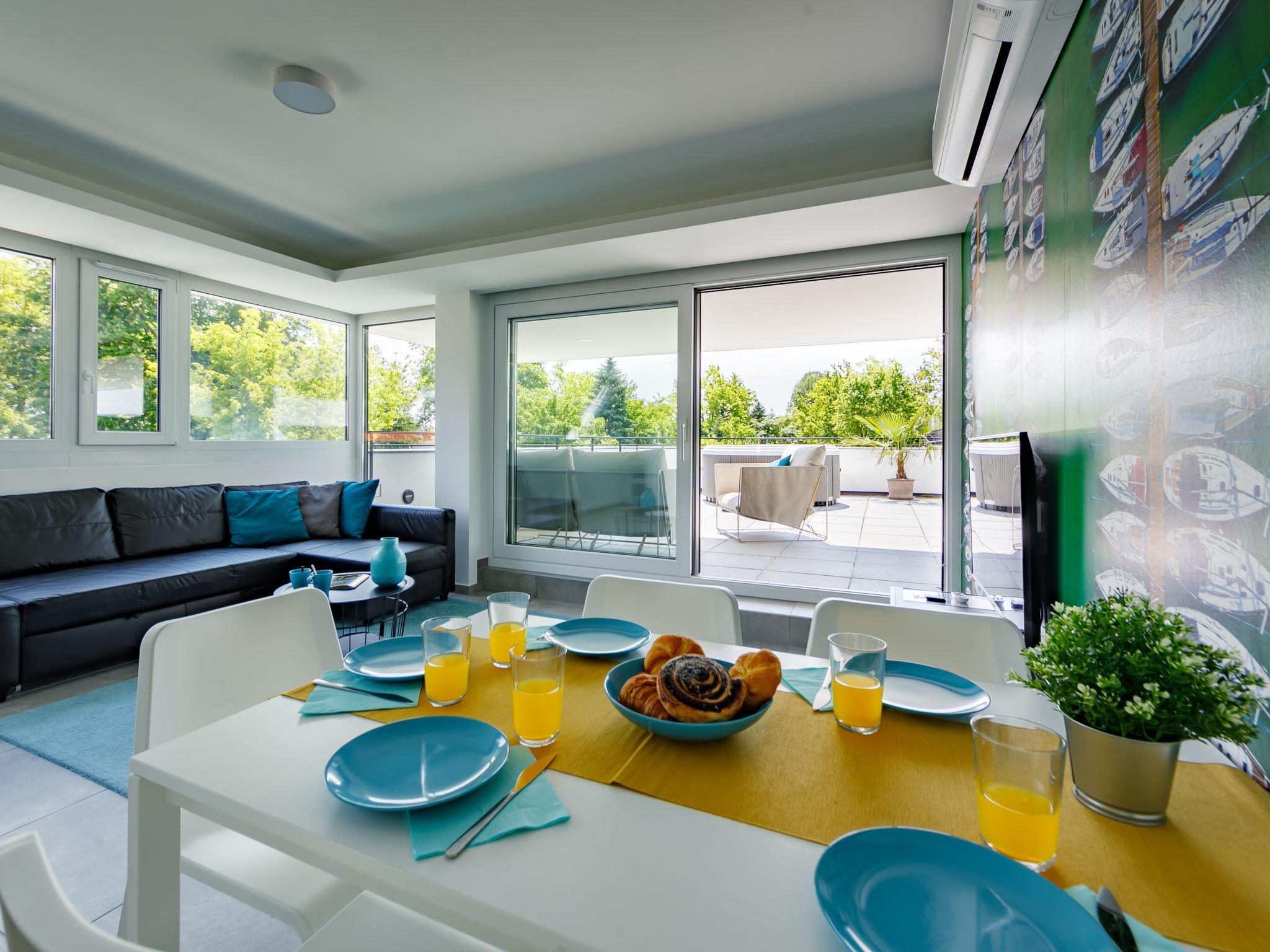 "Kenese", 3-Zimmer-Wohnung 60 m2 im 2. Stock. Modern und geschmackvoll eingerichtet: grosses Wohn-/Schlafzimmer mit 1 Ausziehbett (2 Pers.), Kabel-TV und Klimaanlage. Ausgang zur Terrasse. 2 Zimmer, jedes Zimmer mit 1 franz. Bett. Offene Küche (Backofen, Geschirrspüler, Toaster, Wasserkocher). Dusche/WC, sep. WC. Heizung, Bodenheizung. Grosse Terrasse 60 m2. Terrassenmöbel. Zur Verfügung: Kinderhochstuhl, Babybett (extra). Internet (WLAN). Parkplatz (1 Auto). Maximal 1 Haustier/Hund erlaubt. EG21000354