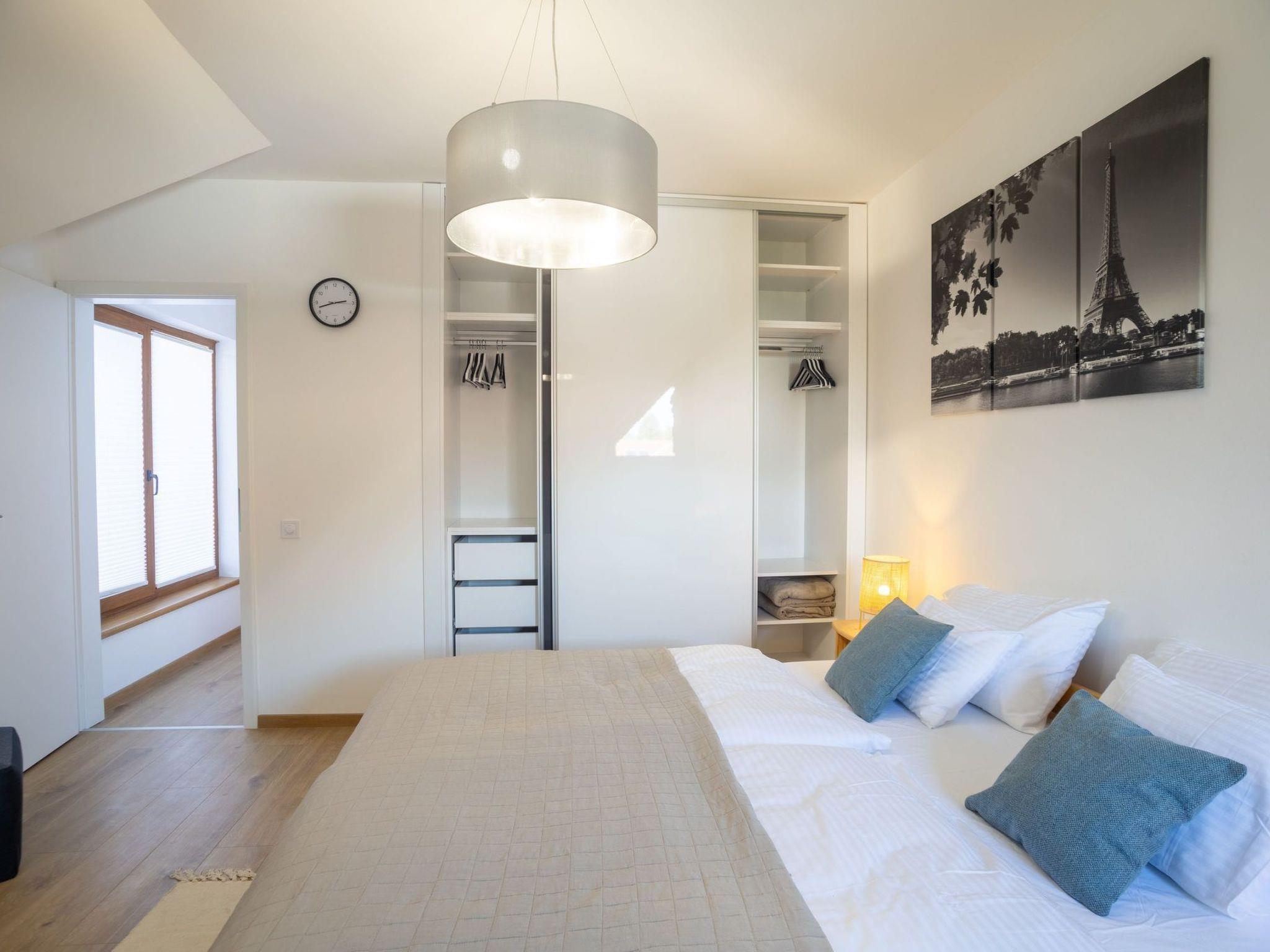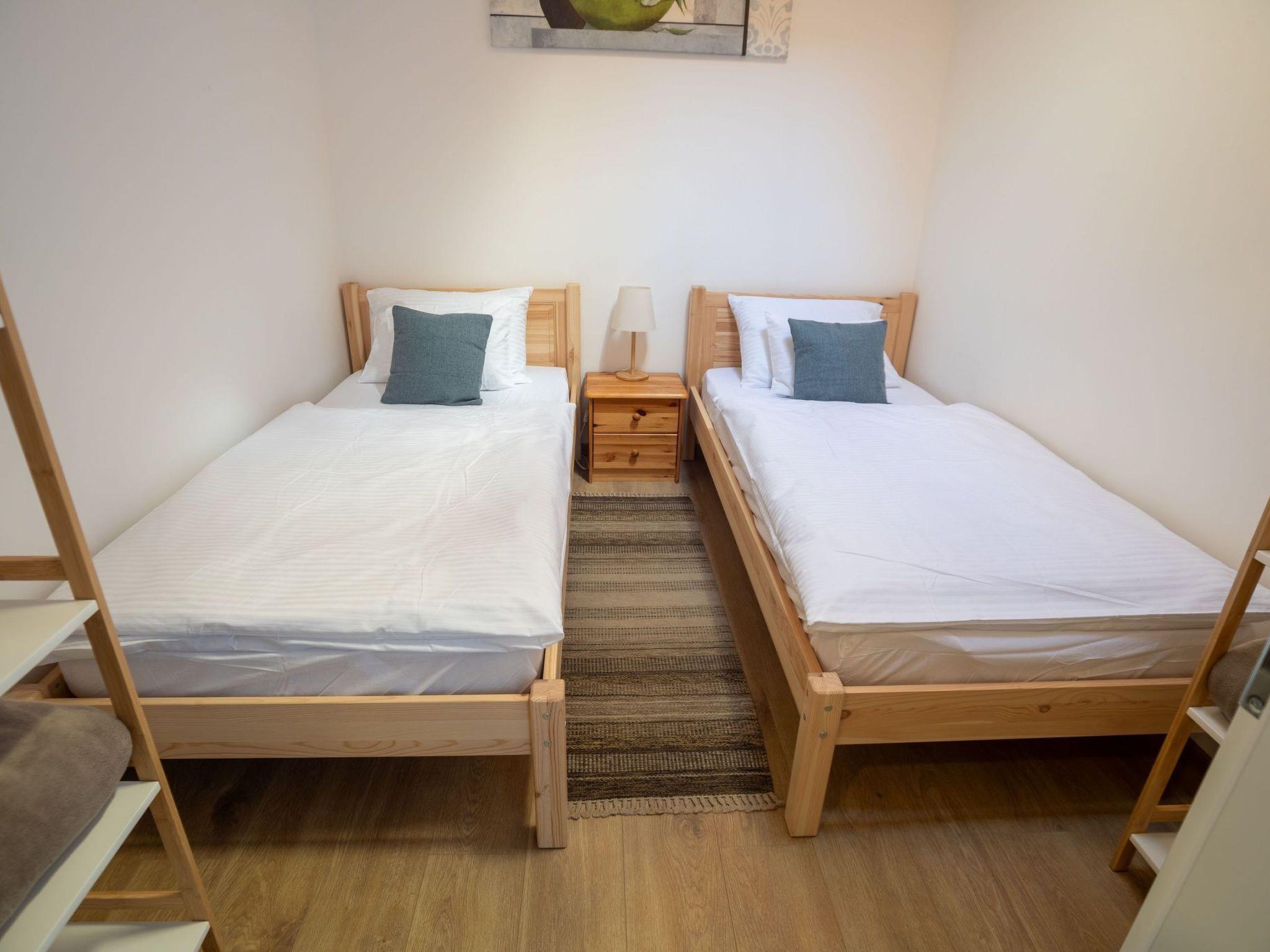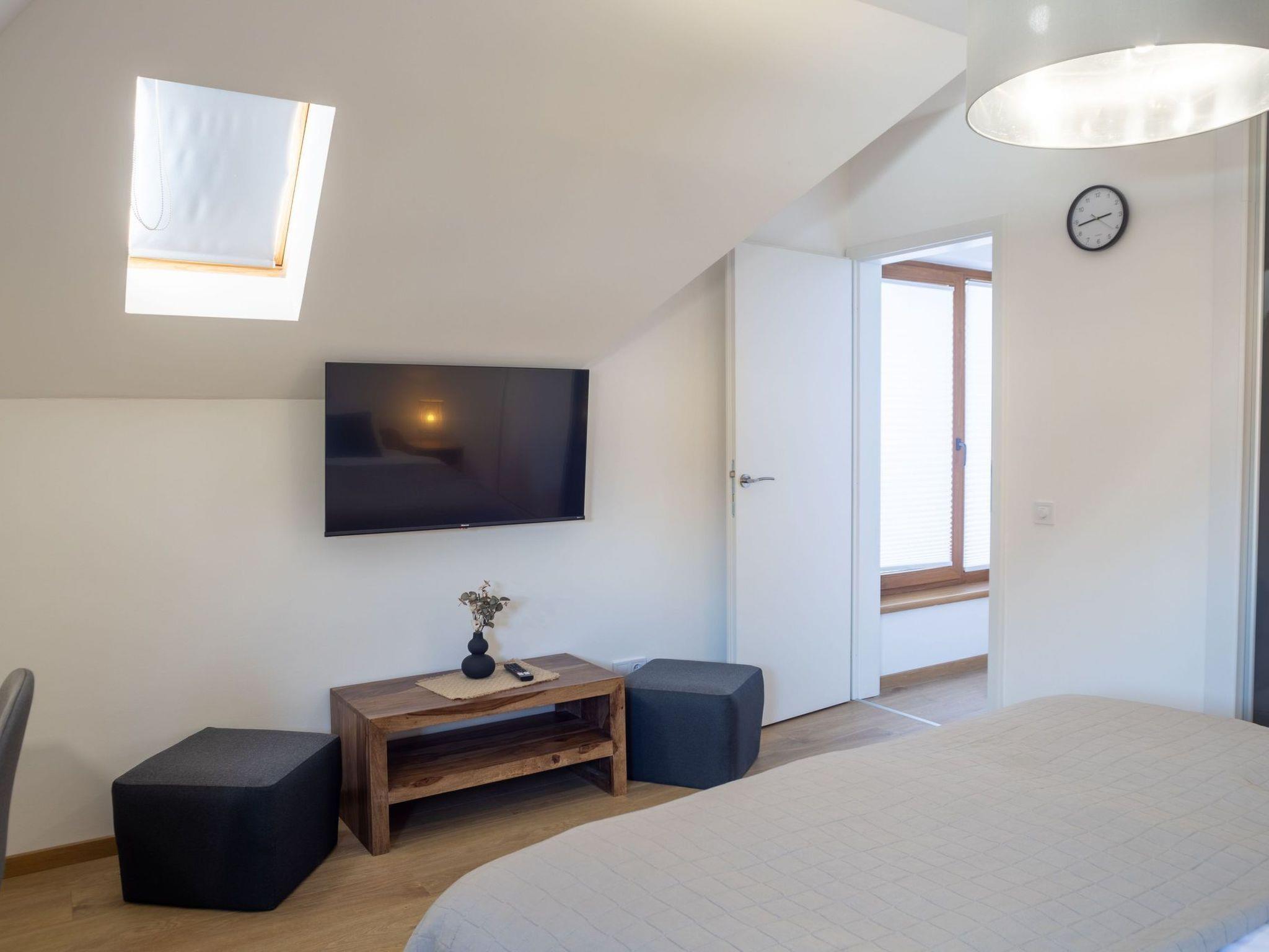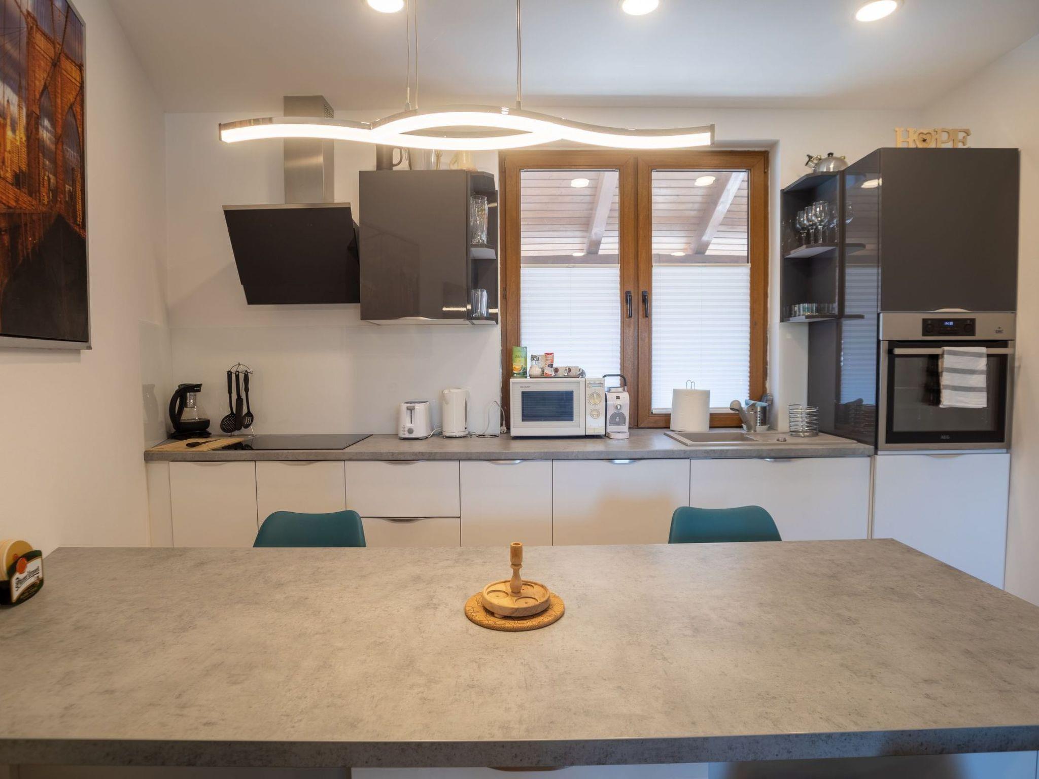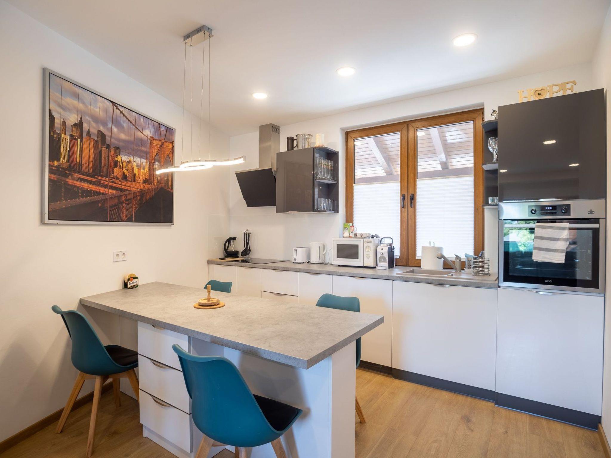 Im Inneren erwarten Sie ein stilvoll eingerichtetes Doppelzimmer und ein gemütliches Zweibettzimmer, untermalt von einem amerikanischen Wohnzimmer mit integrierter Essecke und Kochnische. Für Ihren Komfort ist das Badezimmer mit einer Dusche, Waschmaschine und WC ausgestattet; ein separates WC erhöht den Wohnkomfort zusätzlich. Die moderne Küchenausstattung umfasst einen E-Herd, Kaffeemaschine, Kühlschrank, Mikrowelle, Toaster, Wasserkocher und Spülmaschine, die für Selbstversorger keine Wünsche offenlassen.