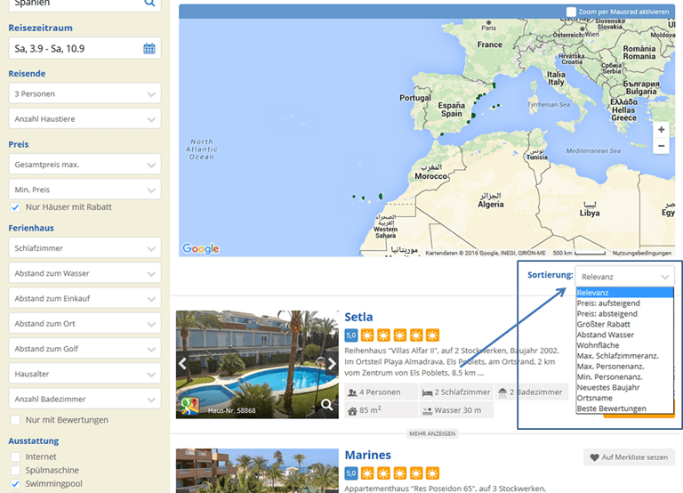 Um die Häuser-Suche individuell gestalten zu können, kann man nach Eingabe der gewünschten Kriterien wie Anzahl der Reisenden und Zeitraum die Suchergebnisse nach verschiedenen Kriterien sortieren. Wählen Sie dazu rechts unter der Karte Ihre präferierte Sortierungsart aus. Unter anderem kann man dabei die am besten bewerteten Häuser oder die Objekte mit dem neuesten Baujahr oder günstigsten Preis als Erstes anzeigen lassen. Sortieren Sie so ganz einfach die angezeigten Häuser nach Ihren Wunschkriterien.