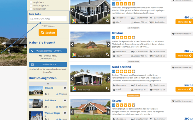 Um die Suche nach dem Ferienhaus noch individueller gestalten zu können, kann man das Suchfeld „Freie Suche“ nutzen. Diese Suchfunktion dient all denjenigen, welche einen speziellen Wunsch an das Ferienhaus haben. Wer beispielsweise einen Hund hat und deswegen unbedingt ein eingezäuntes Grundstück haben möchte, kann den Suchbegriff „eingezäunt“ oder „Zaun“ in das Suchfeld eingeben. Aufgrund dieser präzisen Formulierung kann man zielgerichteter nach seinem gewünschten Ferienhaus suchen und schlussendlich durch ein paar einfache Klicks das ideale Ferienhaus finden.