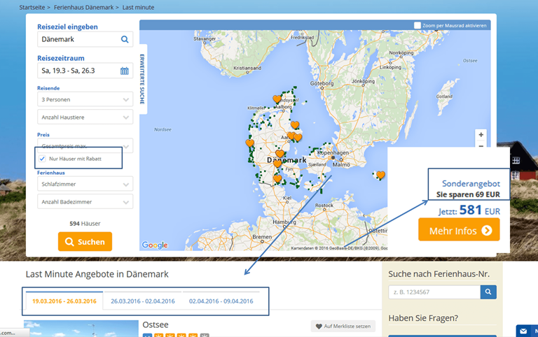Für diejenigen, die gerne spontan verreisen, sind Last Minute Angebote genau das Richtige. Unter unseren Last Minute Angeboten werden Ihnen die 3 jeweils nächsten Wochen ab Datum der Suche vorgeschlagen, aus denen Sie wählen können. Neben den Häusern wird Ihnen außerdem angezeigt, wie viel Sie bei der Buchung – im Vergleich zum herkömmlichen Preis – sparen. Mit ein paar Klicks haben Sie schnell und einfach Ihr Traumhaus in kürzester Zeit gefunden – und dies zu einem unschlagbaren Preis.