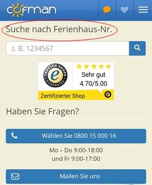 Cofmans erster und vielleicht bester Tipp ist, direkt nach der Hausnummer des Hauses zu suchen, falls Sie oder jemand aus Ihrer Familie die Hausnummer bereits wissen. Scrollen Sie auf unserer Homepage einfach ein wenig nach unten bis Sie das Feld „Suche nach Ferienhaus-Nr.“ sehen. Dort tragen Sie die Nummer ein und schon finden Sie direkt das gesuchte Haus. Wenn Sie gezielt Fragen zum gesuchten Haus haben, die wir Ihnen beantworten sollen, dann können wir das gewünschte Haus mit der Hausnummer ebenfalls sofort finden.