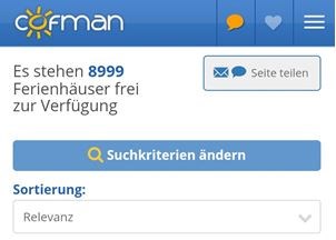 Unter dem Feld „Suchkriterien ändern“, gibt es die Möglichkeit der „Sortierung“. Hier kann man zum Beispiel „Preis: aufsteigen“ auswählen, dann werden zuerst die günstigsten Ferienhäuser angezeigt. Je weiter man nach unten scrollt, desto teurer werden sie. Je nachdem welche Priorität Sie haben, können sie aus 11 verschiedenen Relevanzen auswählen, um Ihnen so die Suche zu erleichtern.