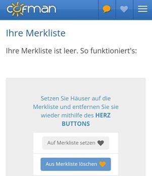 Auf Cofman.com gibt es eine Funktion namens "Merkliste". Hier haben Sie die Möglichkeit, die Häuser, die Ihnen gefallen haben, für später zu speichern. Wenn Sie auf einer Hausseite sind, klicken Sie einfach auf das graue Herz, schon wird Ihr Haus für später gespeichert.