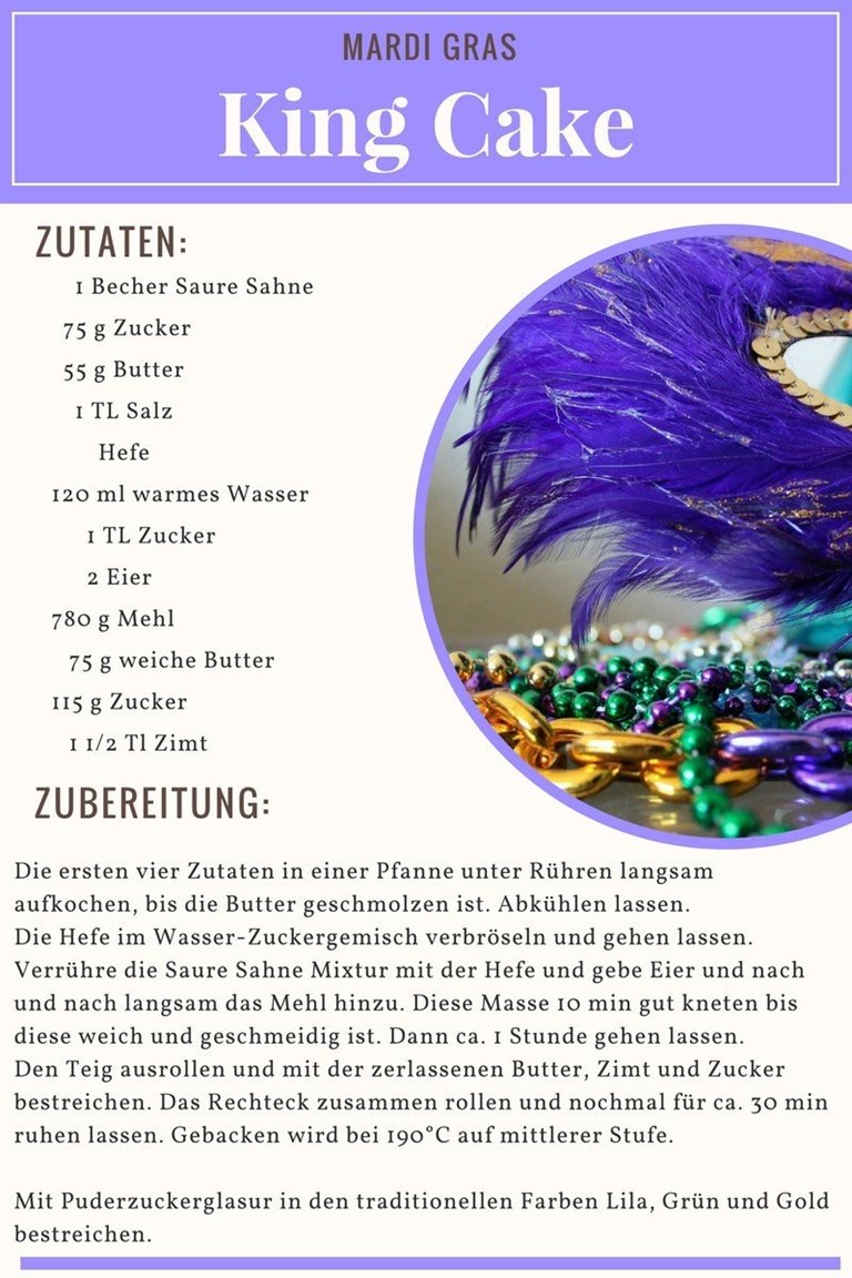 Das sieht man vor allem auch in seinem traditionellen Gerichten zu diesem Feiertag. So wird neben dem deftigen und klassischen Jamalaya, der King Cake gegessen. Ein Teigling mit einer Cremefüllung verziert in den klassischen Farben des Mardi Gras Lila, Grün und Gold.
