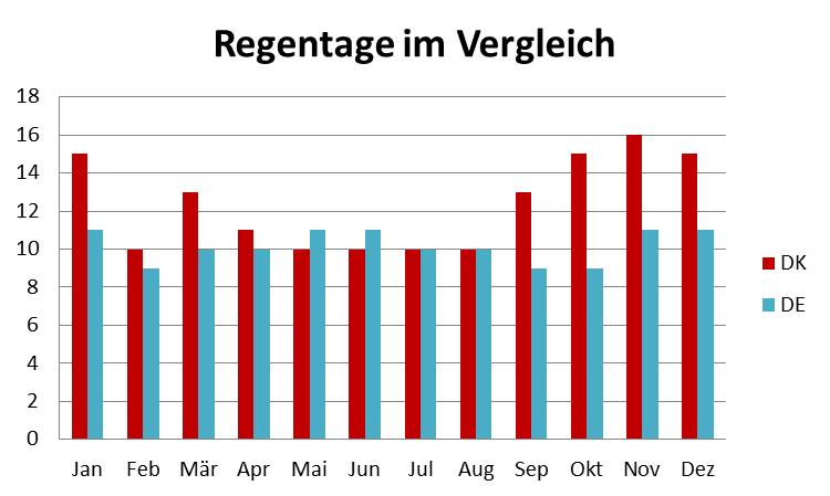 Dänemark befindet sich in der sogenannten gemäßigten Zone, was so viel bedautet wie relativ mildes Klima, obwohl es von der Nord-und Ostsee umgeben liegt. Auch wenn der Wind dort oben etwas rauer weht, ist die durchschnittliche Niederschlagsmenge, in anderen Worten Regen und/ oder Schnee, mit 700 bis 800 mm pro m² im Osten und 500 bis 600 mm pro m² im Westen im Vergleich zu anderen mitteleuropäischen Verhältnissen sogar gering. Wer hätte das gedacht?