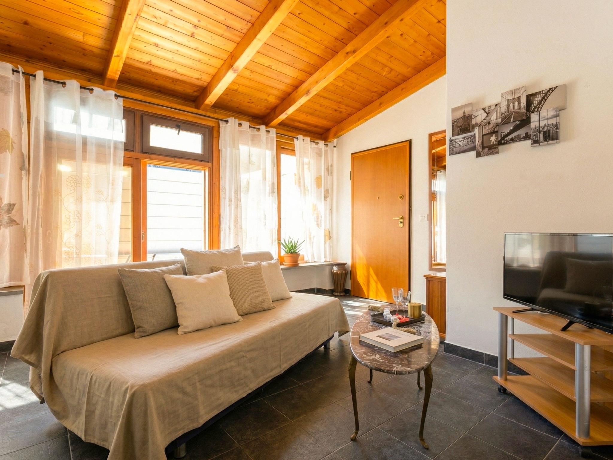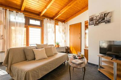 3,0"Il Girasole", 4-Zimmer-Wohnung 75 m2 auf 2 Stockwerken, im Erdgeschoss. Schön und gemütlich eingerichtet: Wohn-/Esszimmer mit TV und Flachbildschirm. Ausgang zum Balkon. Büro, ohne Fenster. Küche (Mini-Backofen, 3 Induktionskochplatten, Toaster,